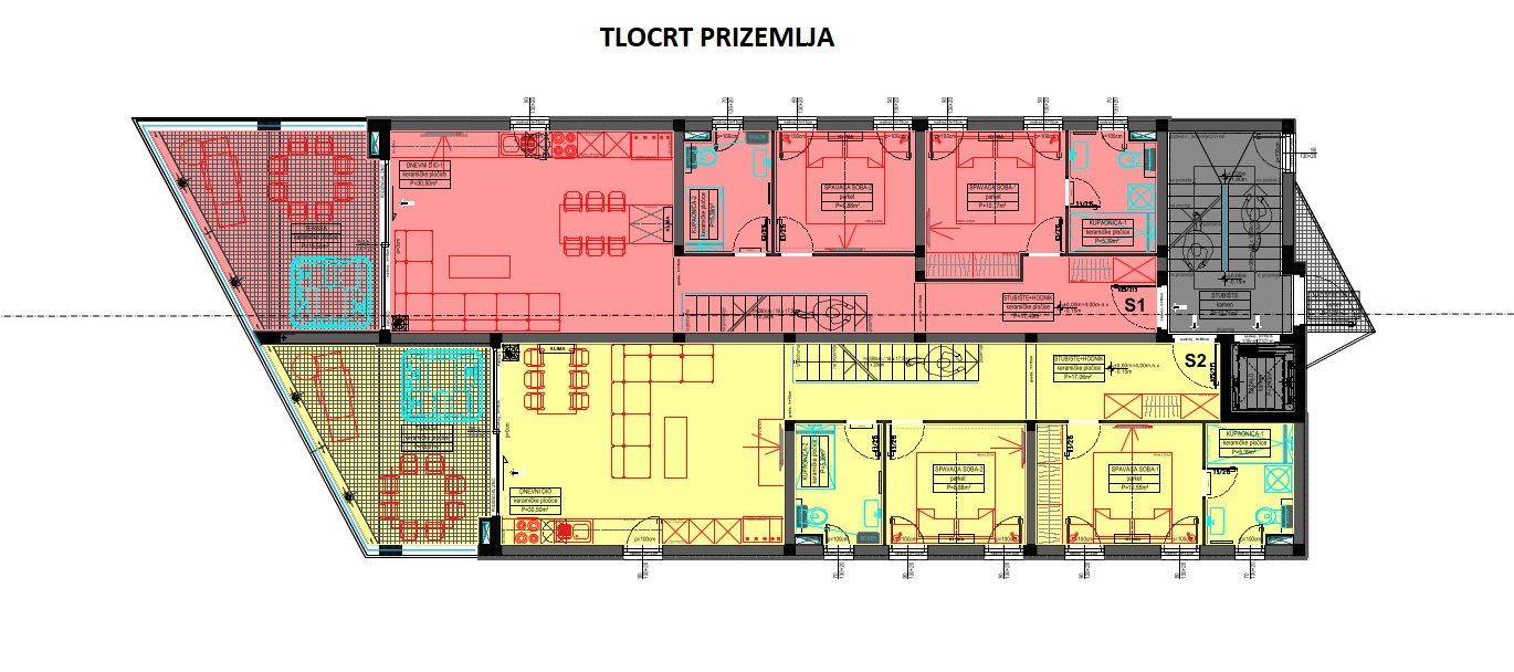 – Obergeschoss: zwei Schlafzimmer, Wohnzimmer + Küche + Esszimmer, Flur, zwei Badezimmer und Terrasse.