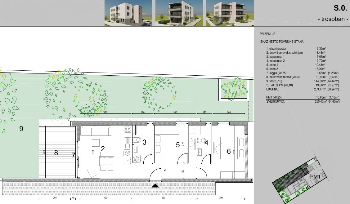 Es besteht aus: zwei Schlafzimmern, Wohnzimmer + Küche + Esszimmer, Flur, zwei Badezimmern und einer überdachten Terrasse.