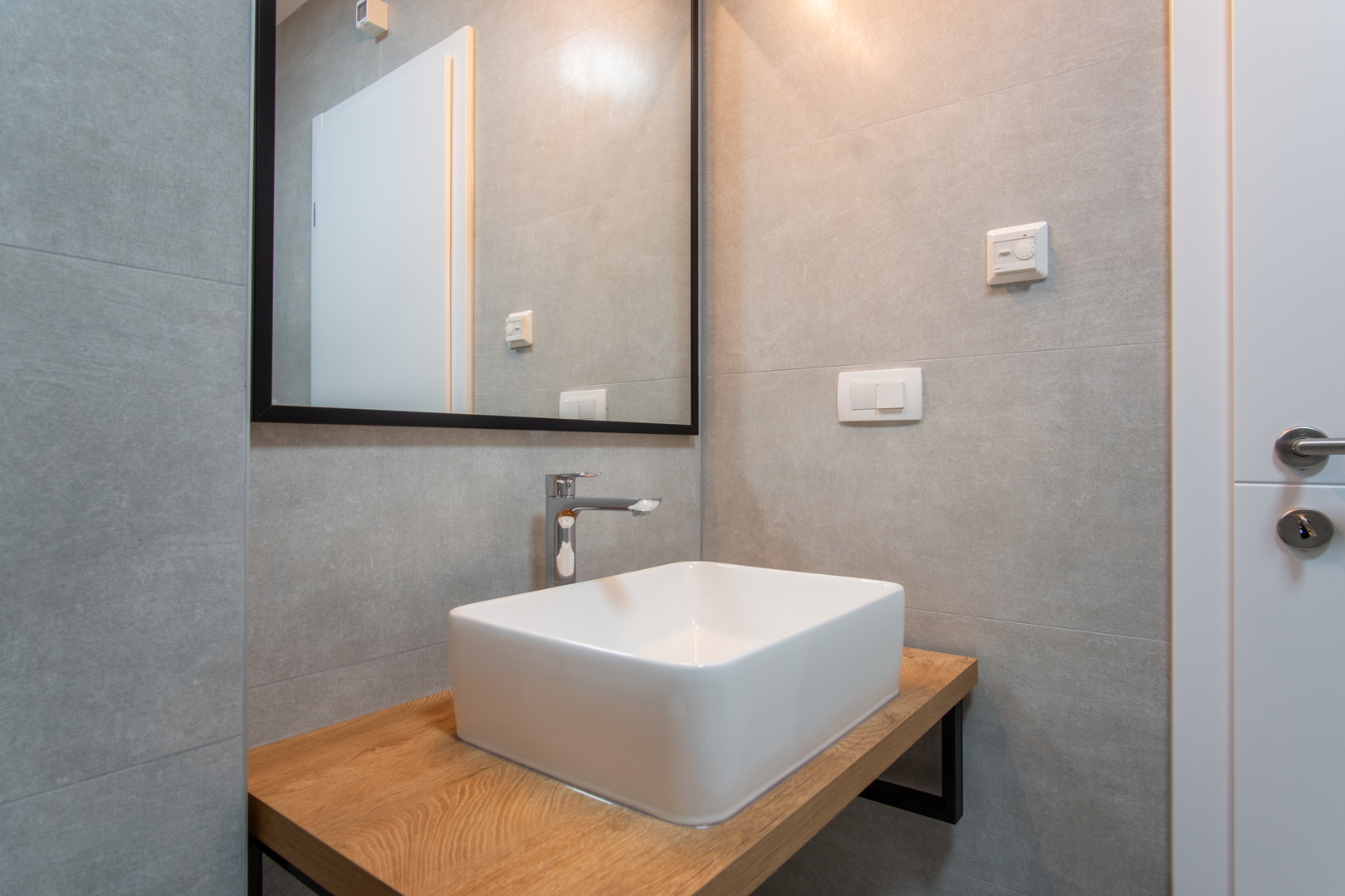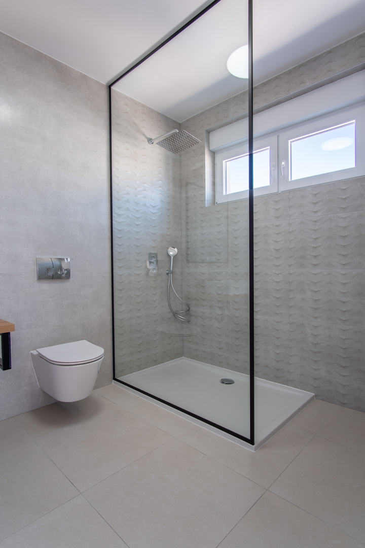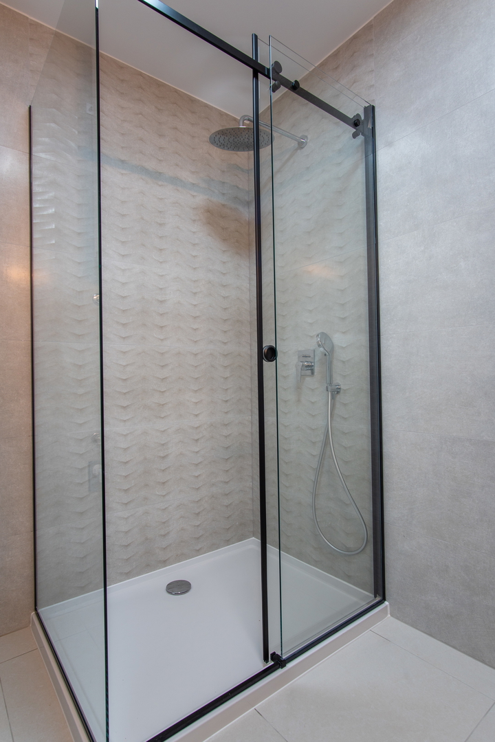 *BADEZIMMER: Fußbodenheizung, hochwertige Keramik 120X40, begehbare Glasduschen, Kopfmischer und Duschköpfe, Elektroboiler, Vorbereitung für einen elektrischen Badheizkörper, Jalousien mit elektrischer Hebevorrichtung, eingebautes Waschbecken und Wasserhahn, SIKA-Abdichtung, GEBERIT Wassertanks