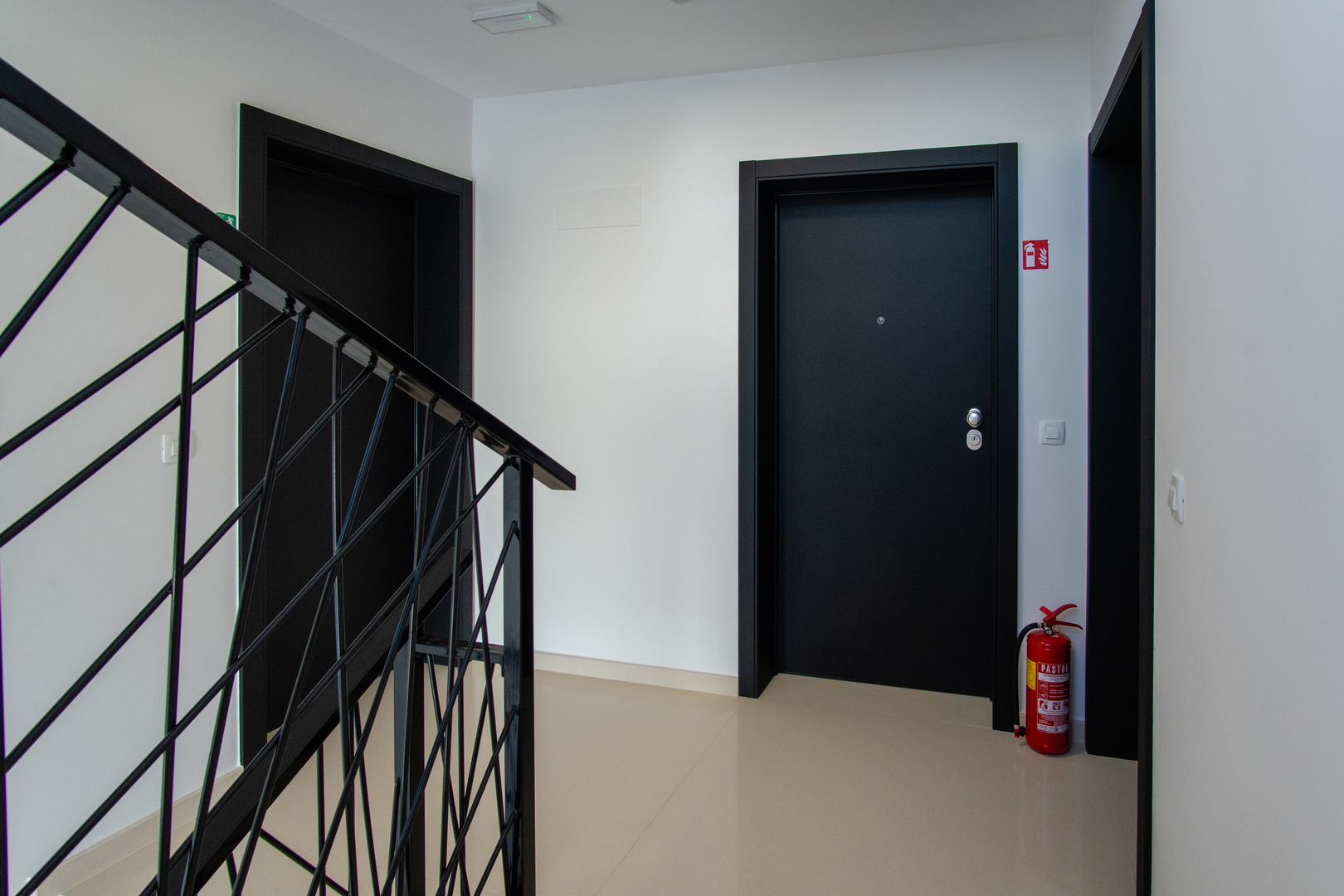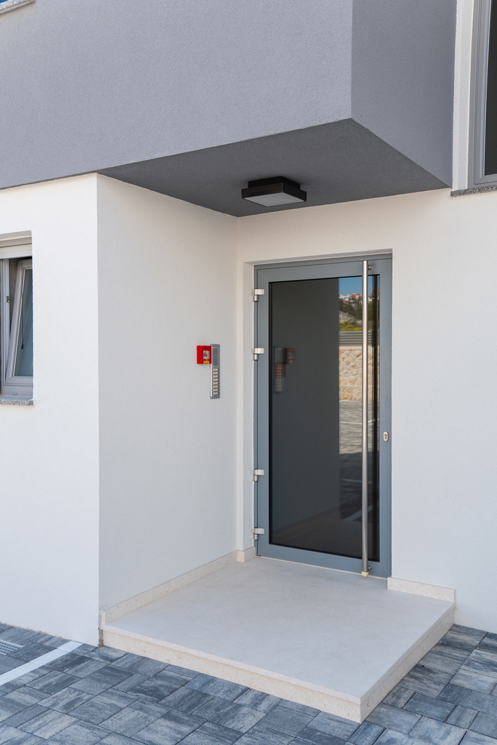 *Eingangstür: einbruchhemmende, feuersichere, rauch- und rauchsichere Haustür, eingebaute Fußleisten in Türfarbe, Innenleisten in Türfarbe, Türrahmen plastifiziert in Türblattfarbe