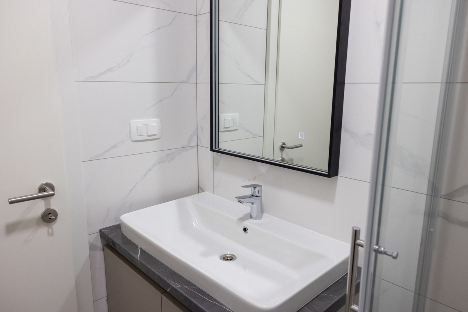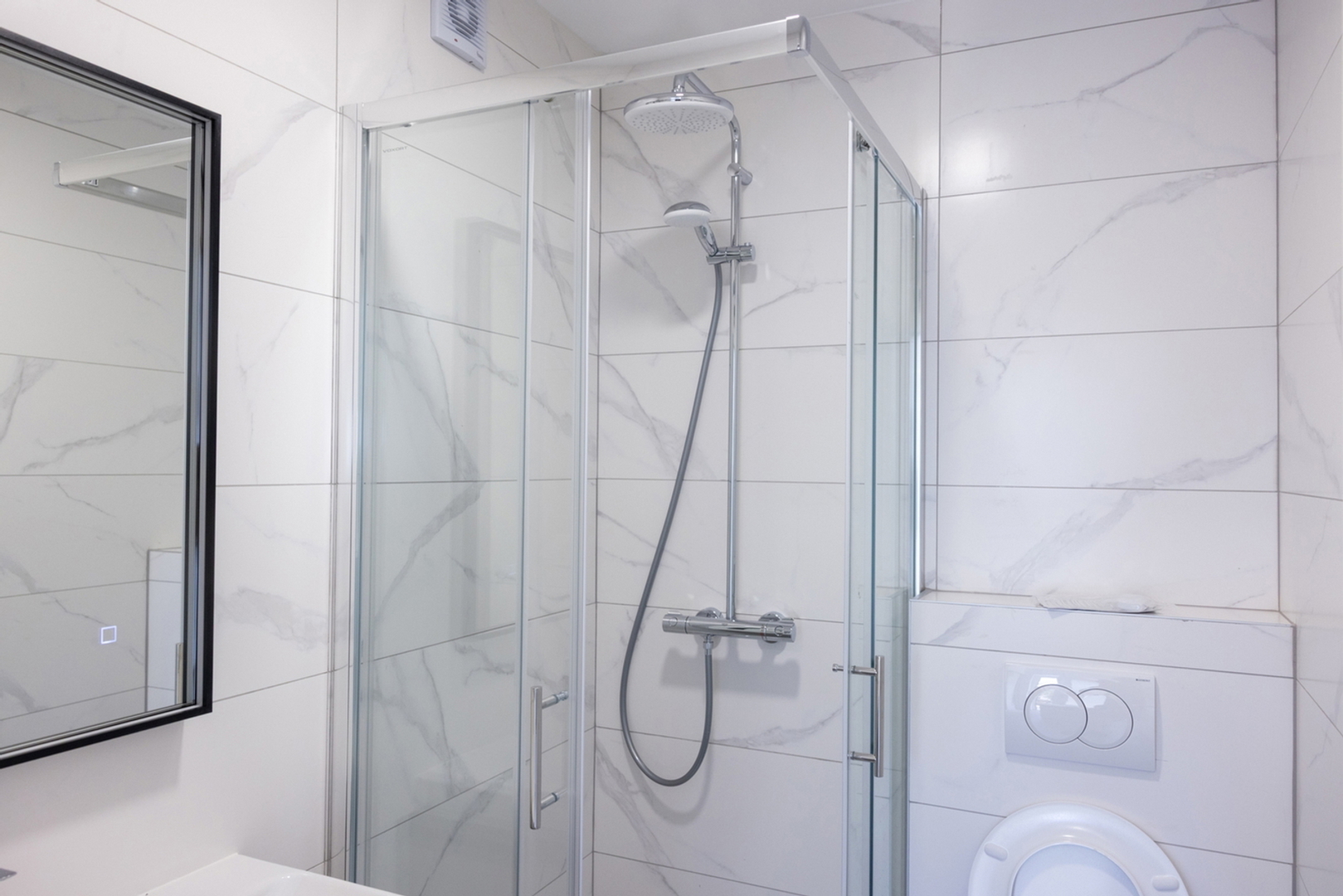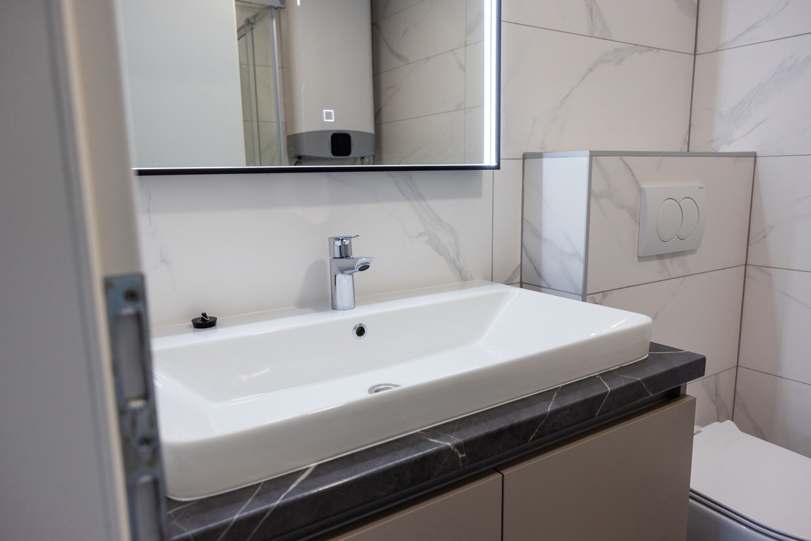 Es besteht aus: zwei Schlafzimmern, Wohnzimmer + Küche + Esszimmer, Flur, Hauswirtschaftsraum, zwei Badezimmern und einer Loggia.