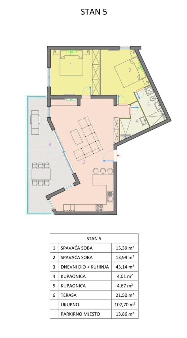 Es besteht aus: zwei Schlafzimmern, Wohnzimmer + Küche + Esszimmer, Badezimmer und Terrasse.