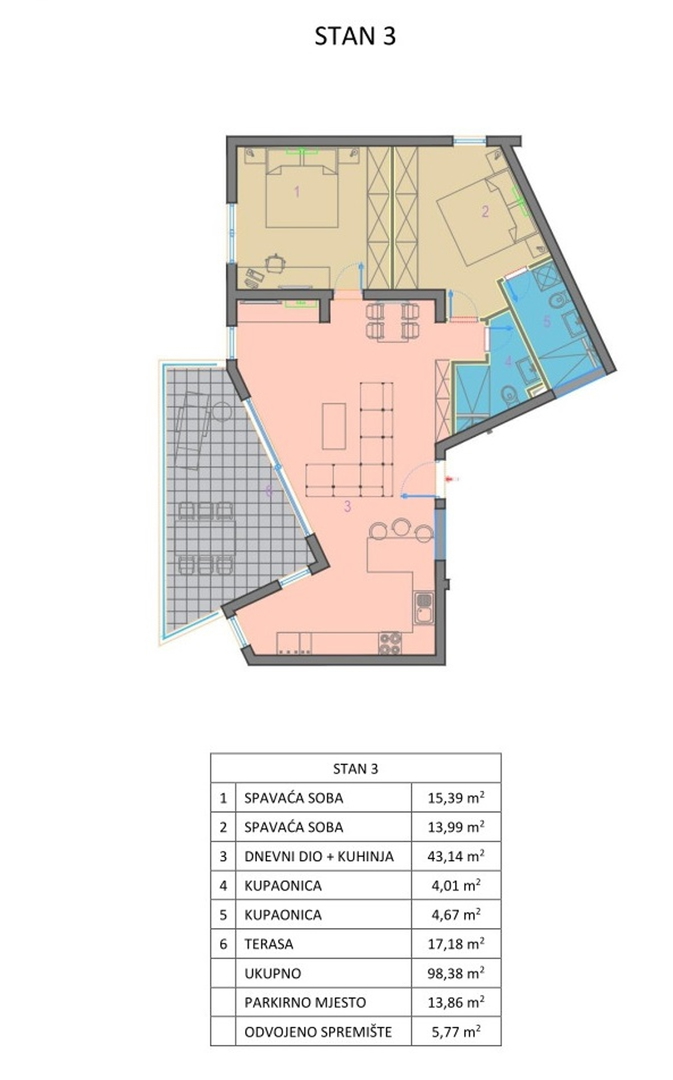 Es besteht aus: zwei Schlafzimmern, Wohnzimmer + Küche + Esszimmer, Flur, zwei Badezimmern und einer Terrasse.