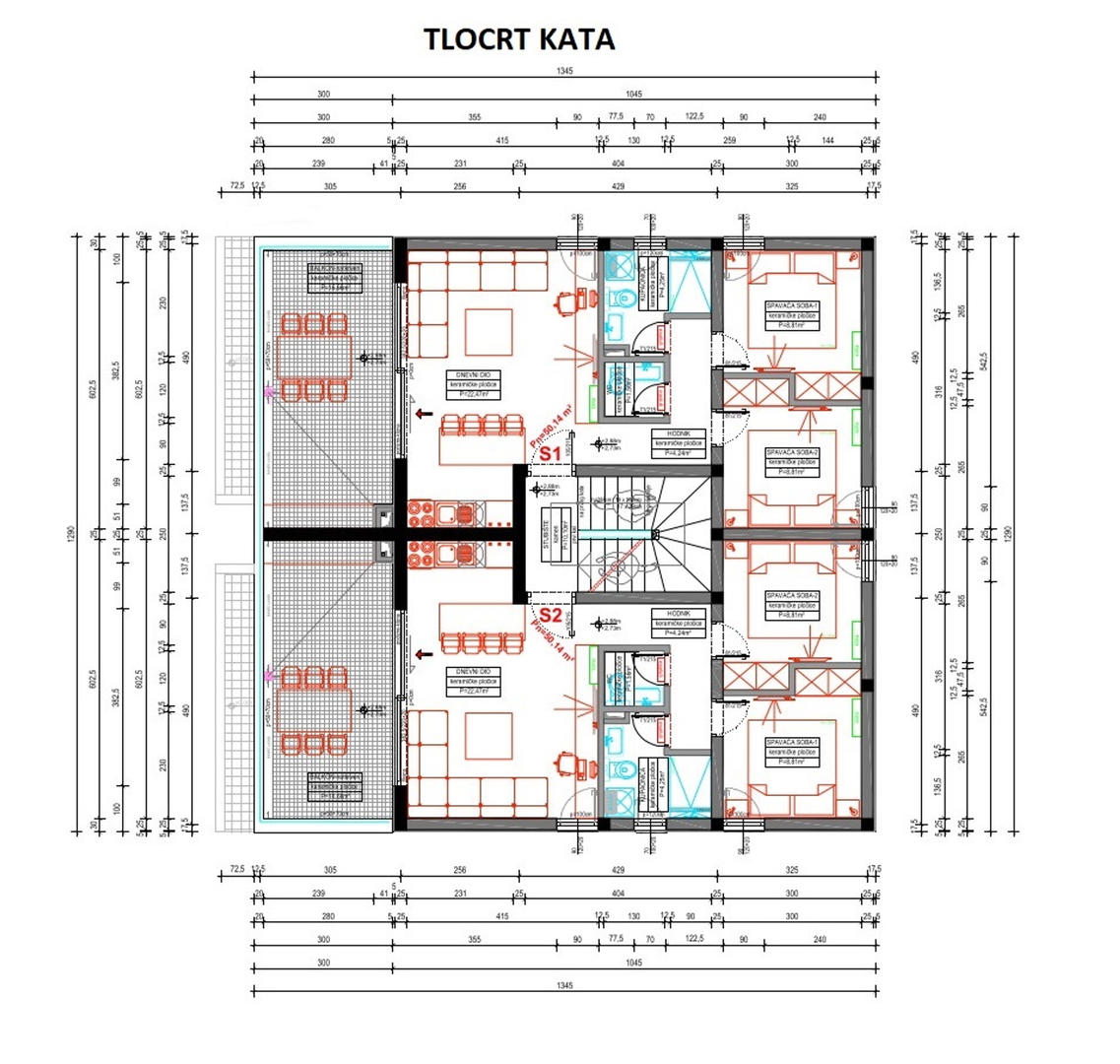 Es besteht aus: zwei Schlafzimmern, Wohnzimmer + Küche + Esszimmer, Flur, Bad, WC und Terrasse.