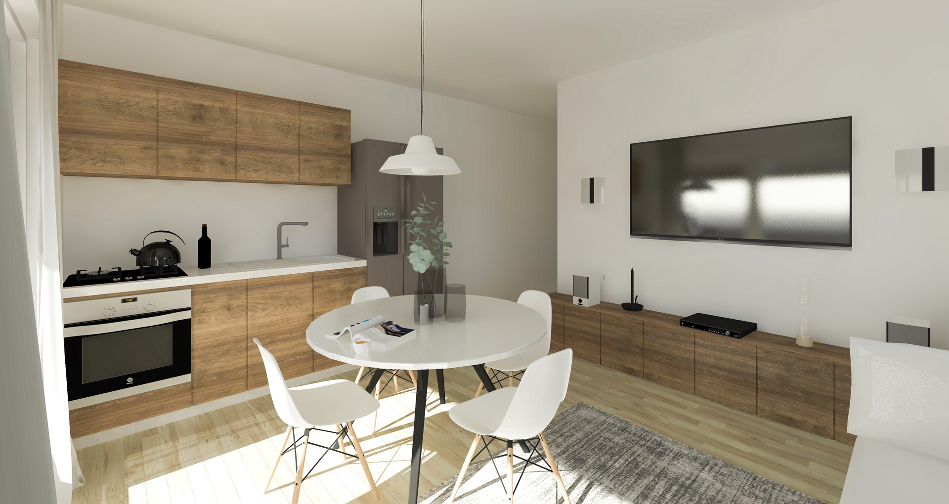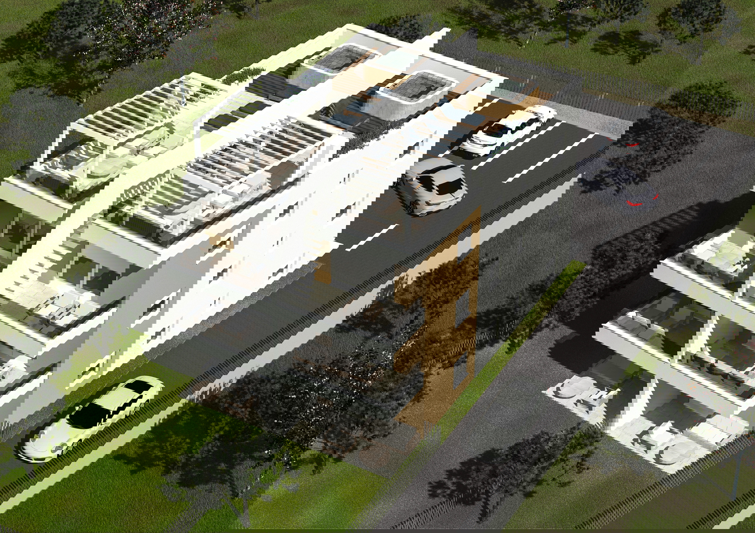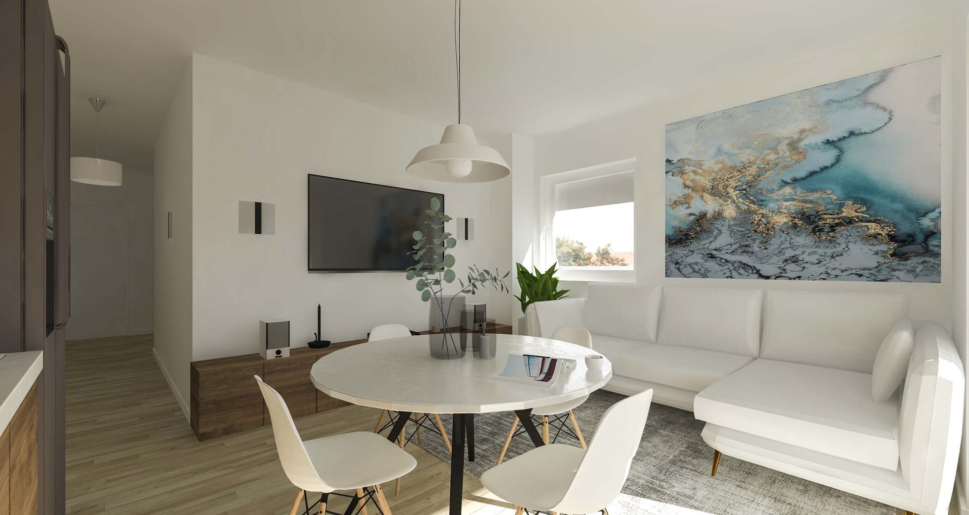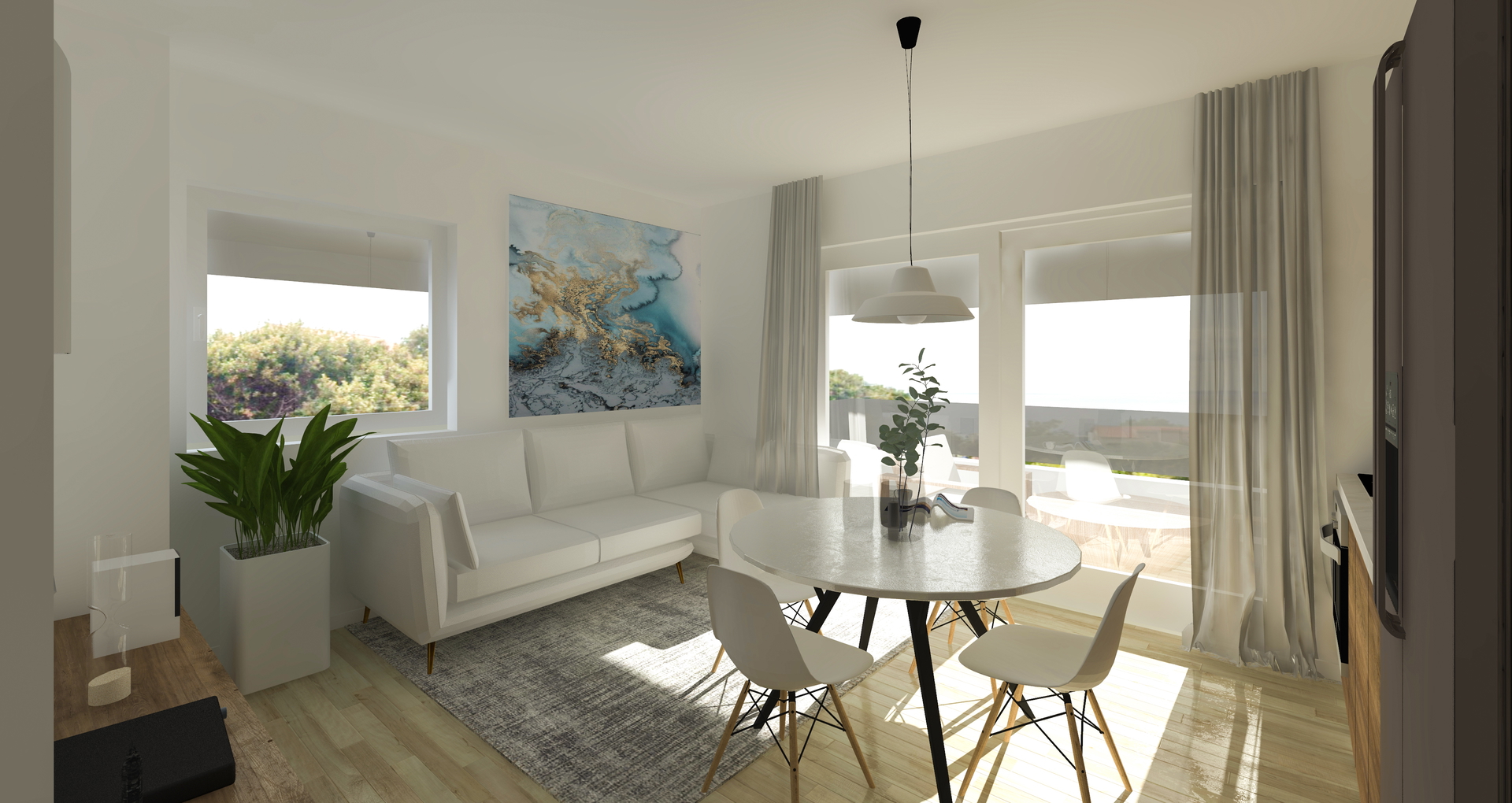 Es besteht aus: zwei Schlafzimmern, Wohnzimmer + Küche + Esszimmer, Flur, Badezimmer und überdachter Terrasse.
