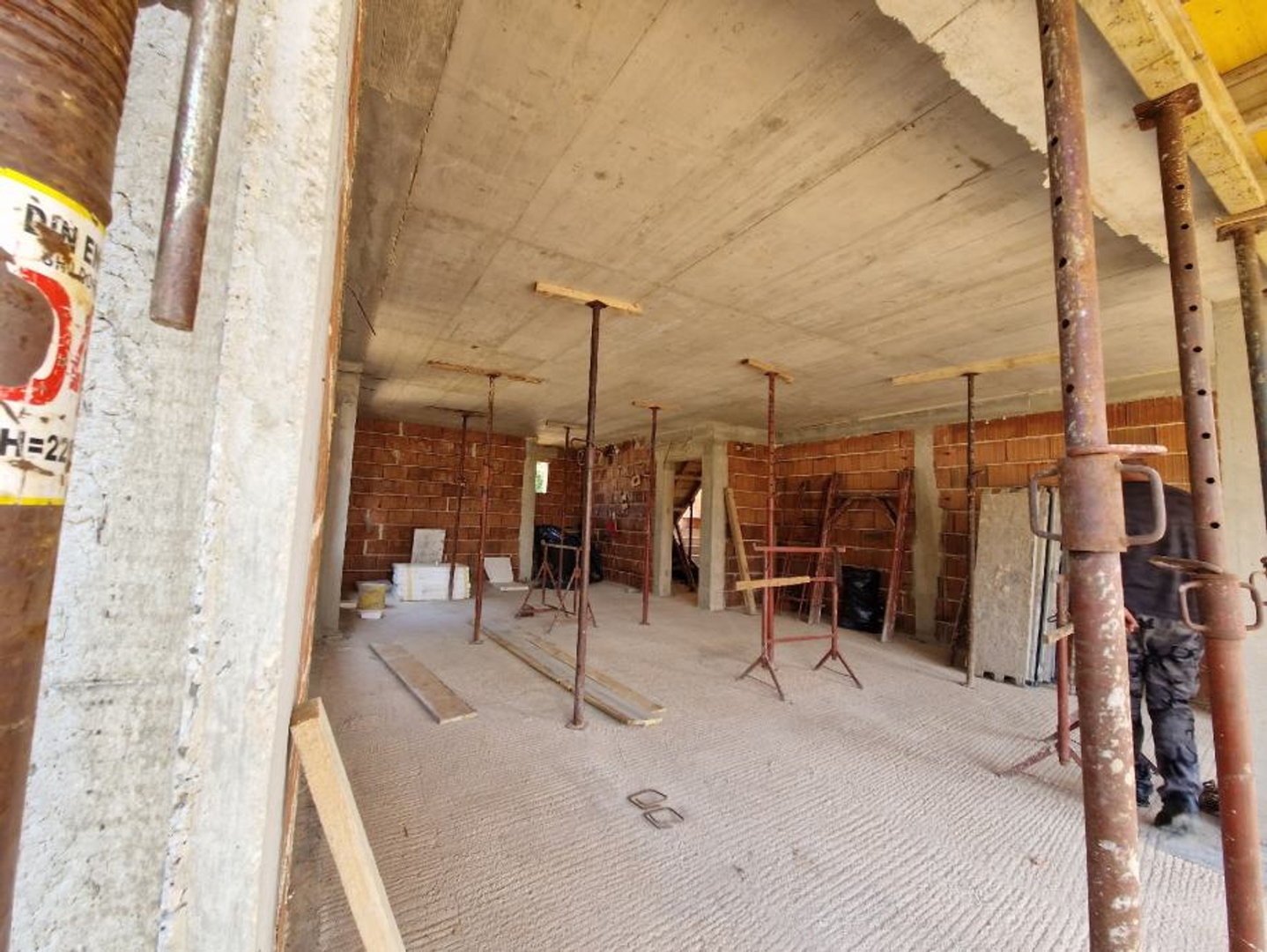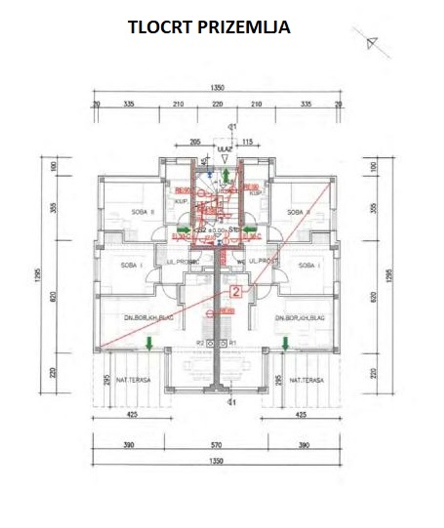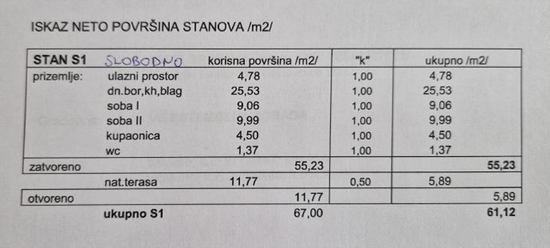 Es besteht aus: zwei Schlafzimmern, Wohnzimmer + Küche + Esszimmer, Flur, Bad, WC und überdachter Terrasse.