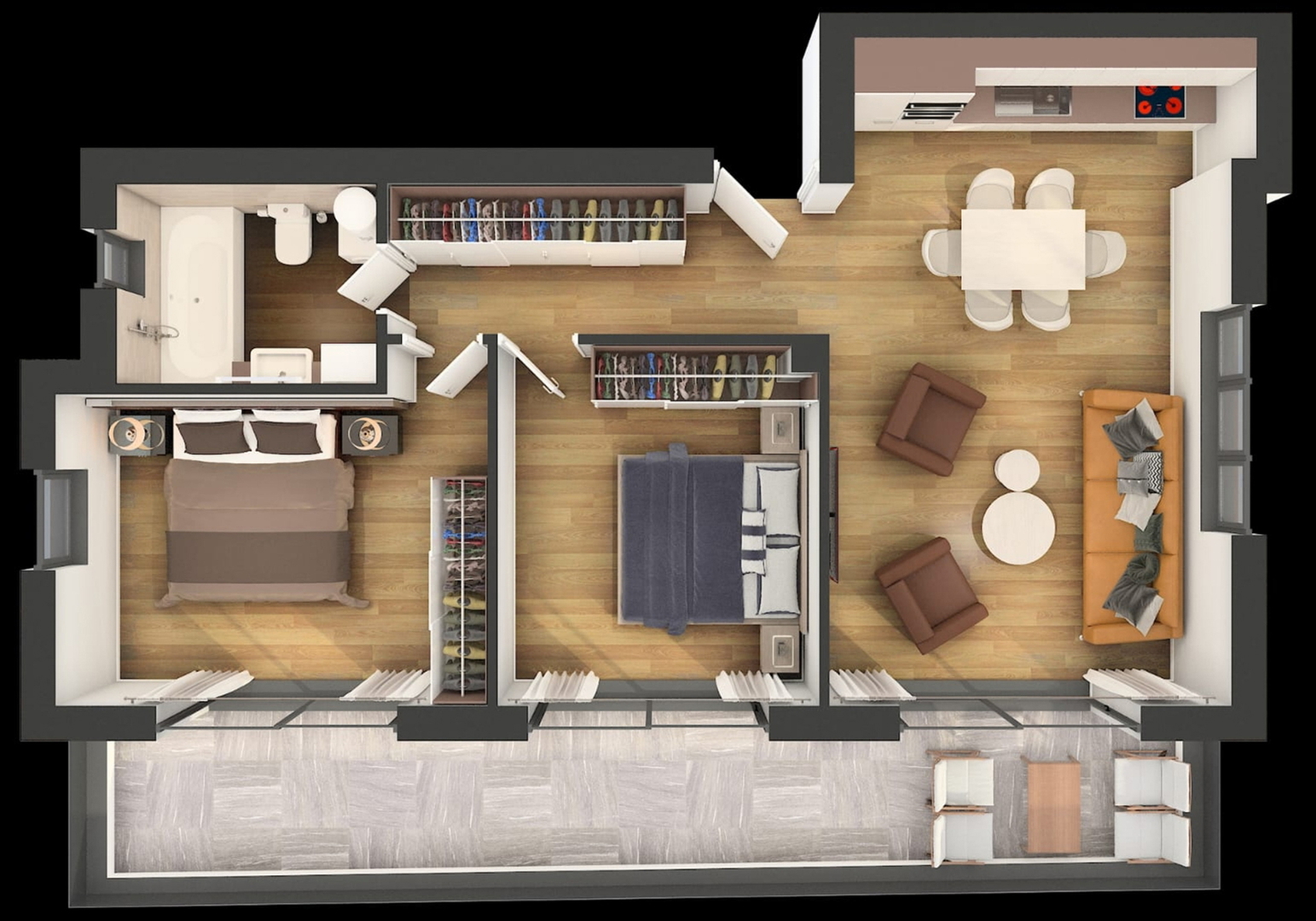 Es besteht aus: zwei Schlafzimmern, Wohnzimmer + Küche + Esszimmer, Flur, Badezimmer und Terrasse.