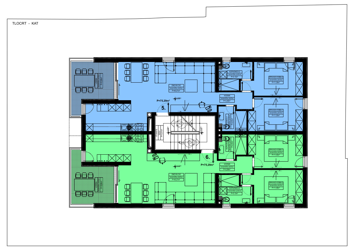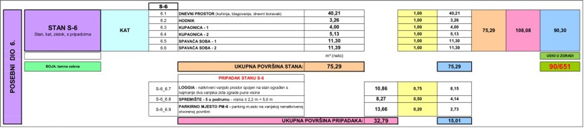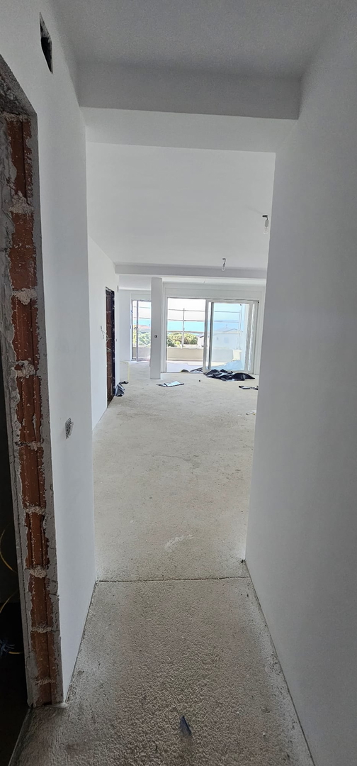Es besteht aus: zwei Schlafzimmern, Wohnzimmer + Küche + Esszimmer, Flur, zwei Badezimmern und Terrasse.