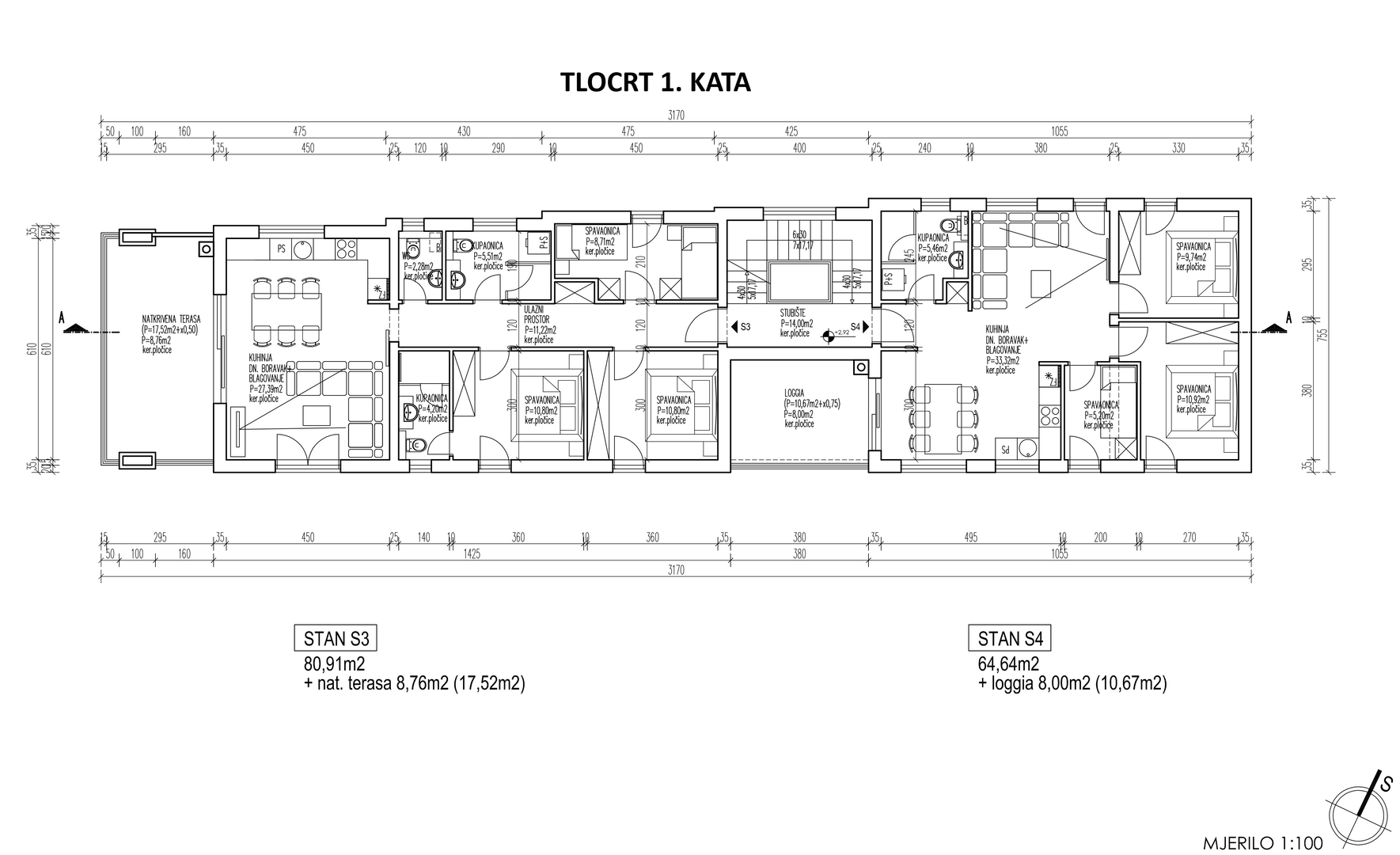 Es besteht aus: drei Schlafzimmern, Wohnzimmer + Küche + Esszimmer, Flur, zwei Badezimmern, Toilette und Terrasse.