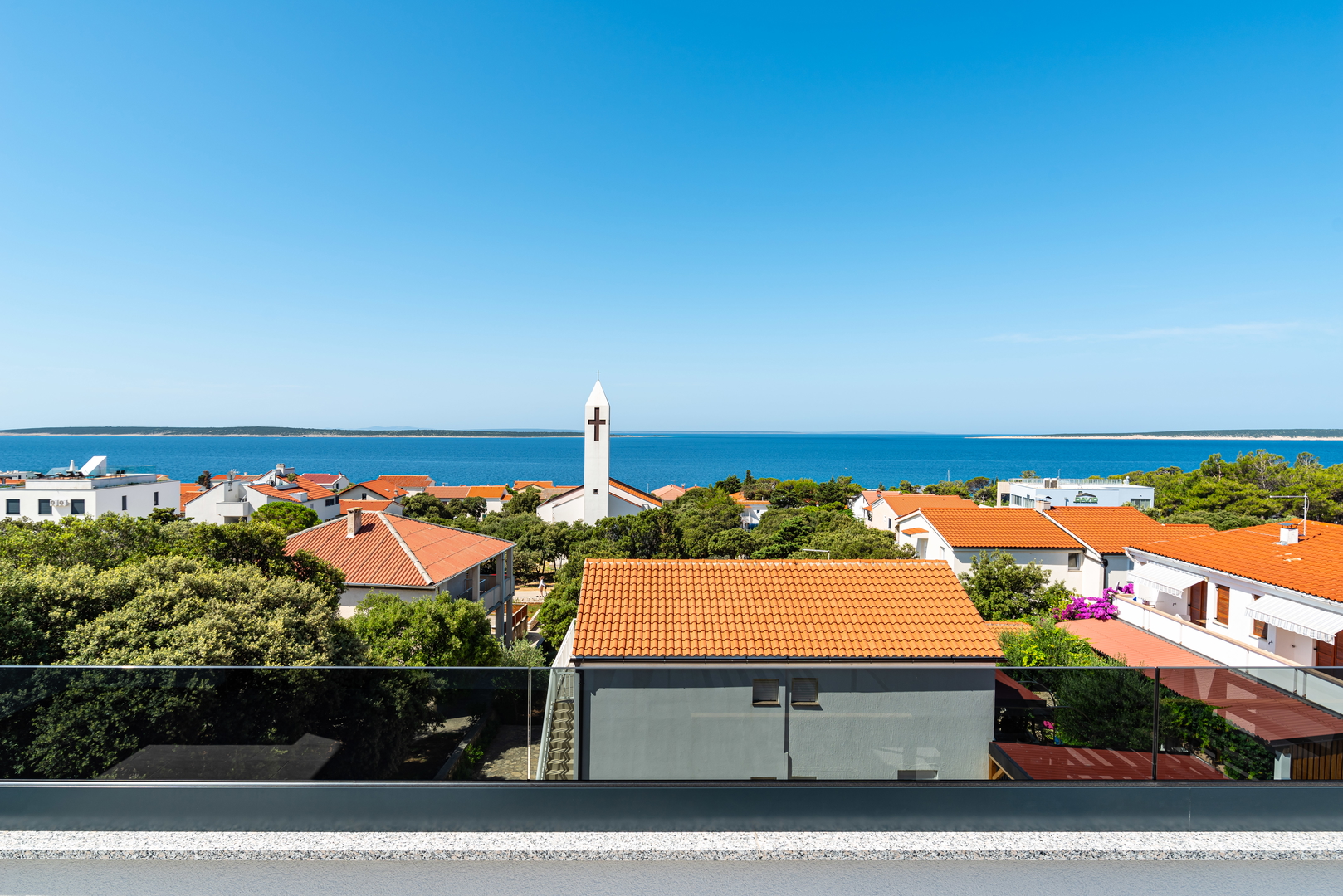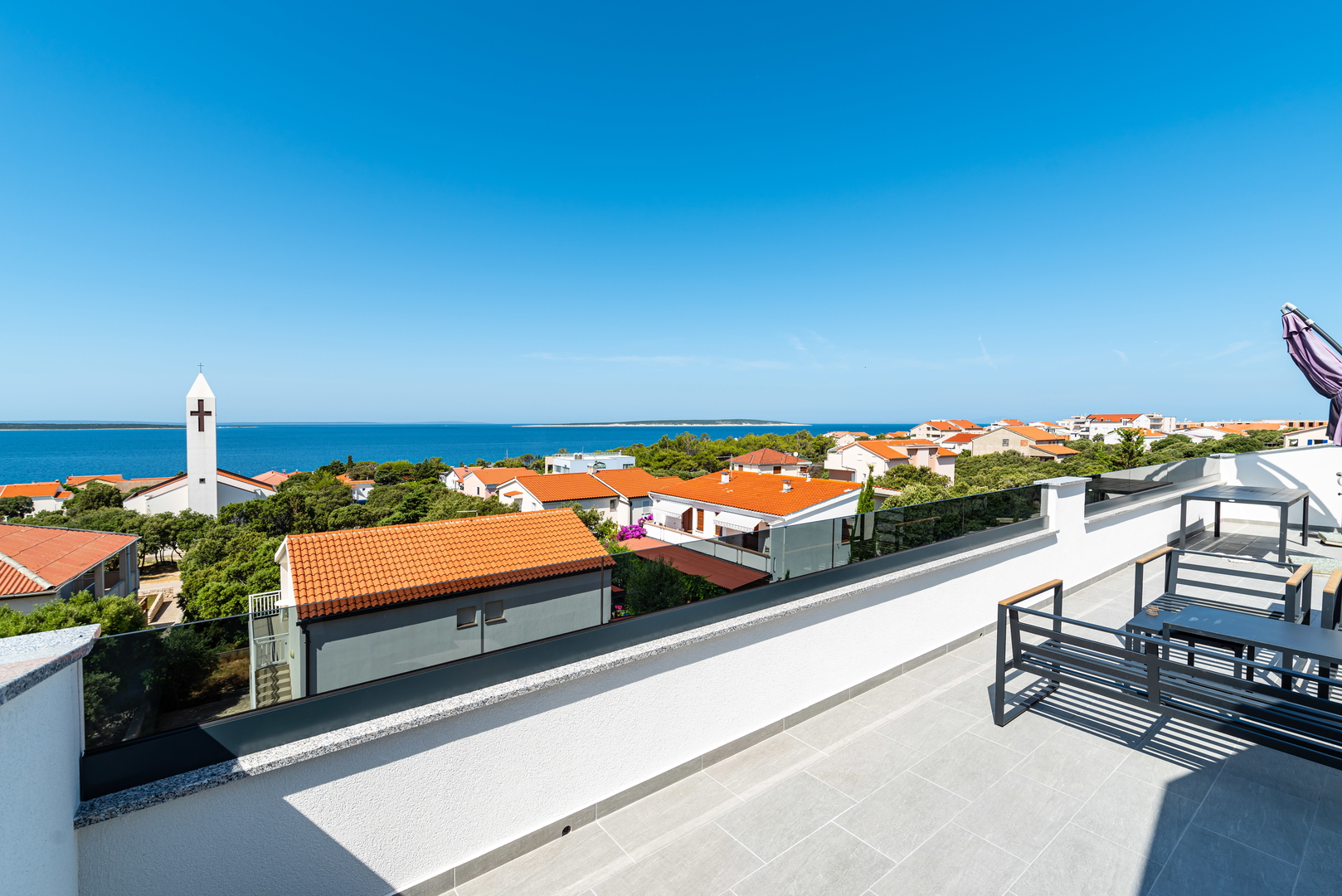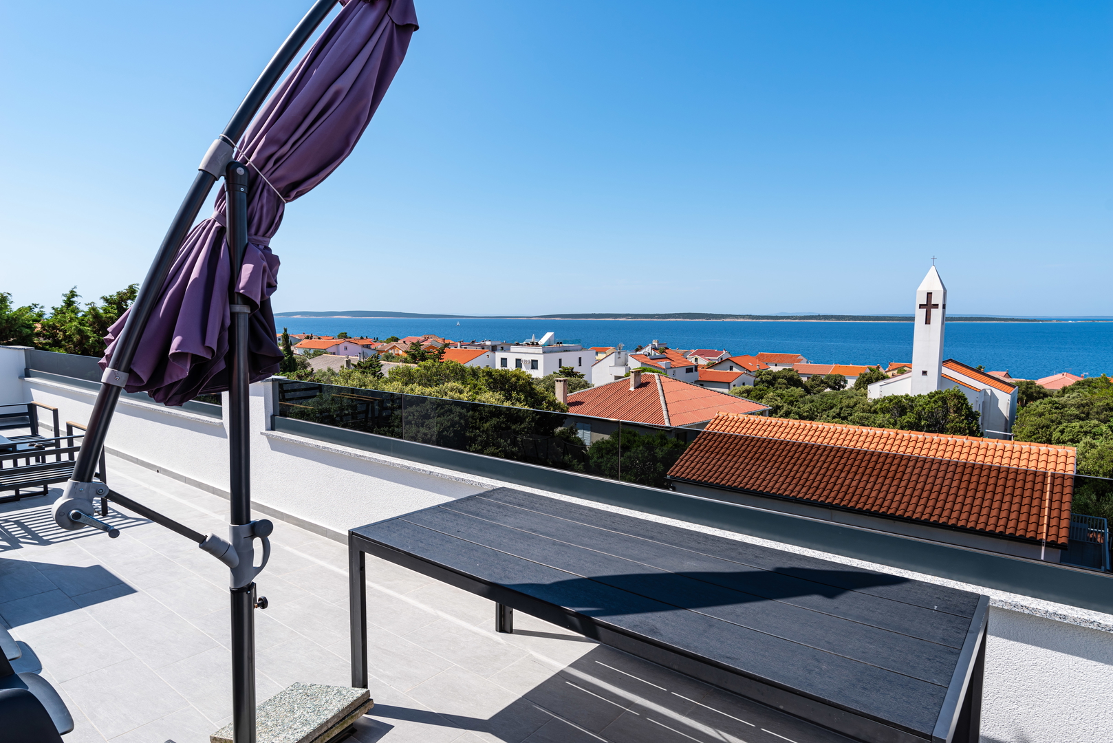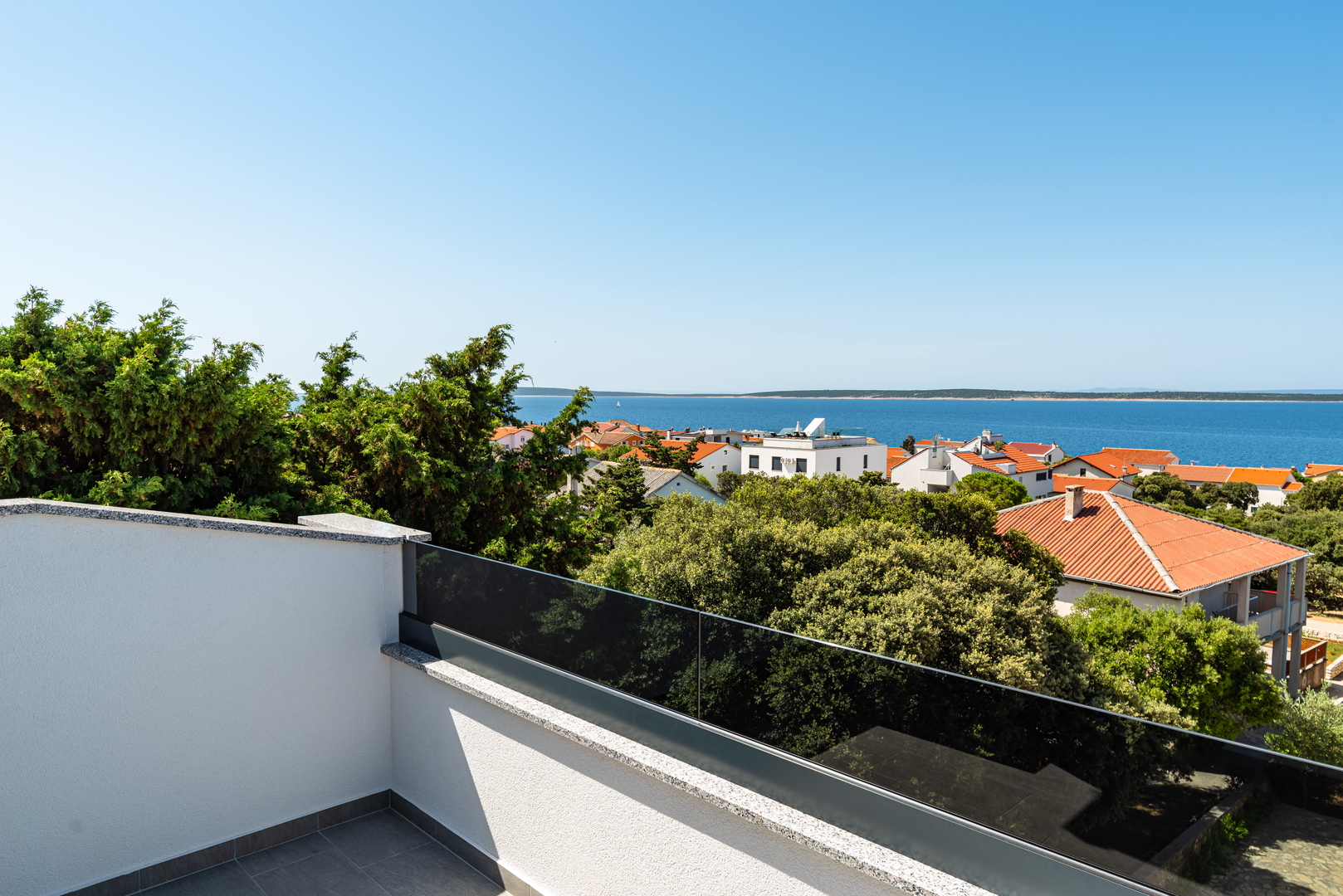 Pag – Mandre, Dreizimmerwohnung von 146,37 m2 zum Verkauf im Dachgeschoss eines 2022 erbauten Wohnhauses mit insgesamt sieben Wohnungen, komplett neu eingerichtet.