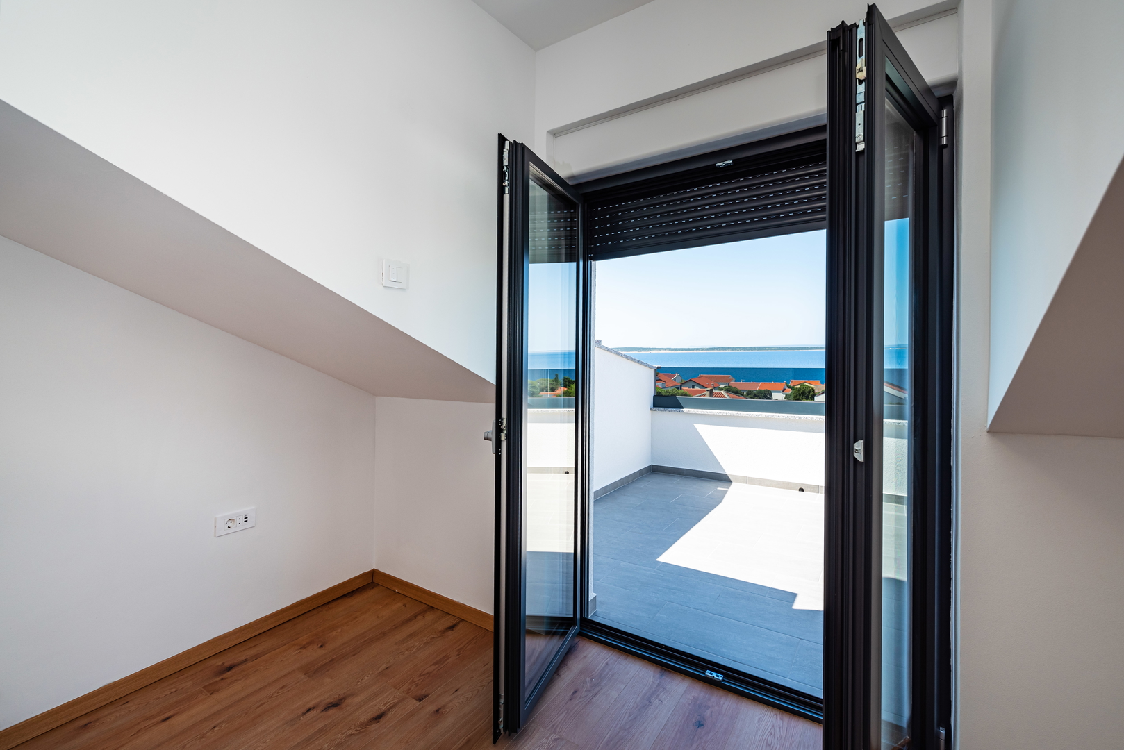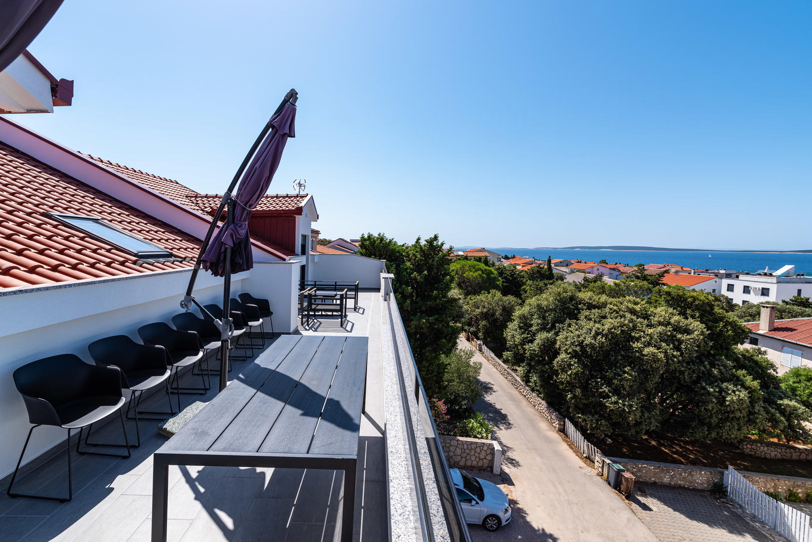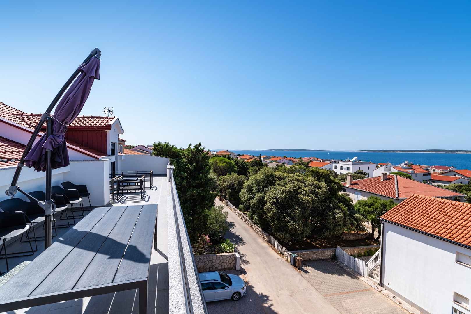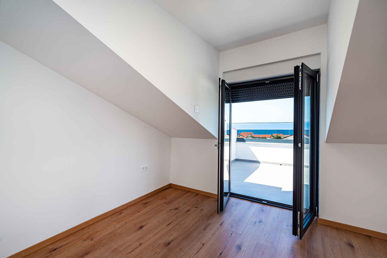 Pag – Mandre, Dreizimmerwohnung von 146,37 m2 zum Verkauf im Dachgeschoss eines 2022 erbauten Wohnhauses mit insgesamt sieben Wohnungen, komplett neu eingerichtet.