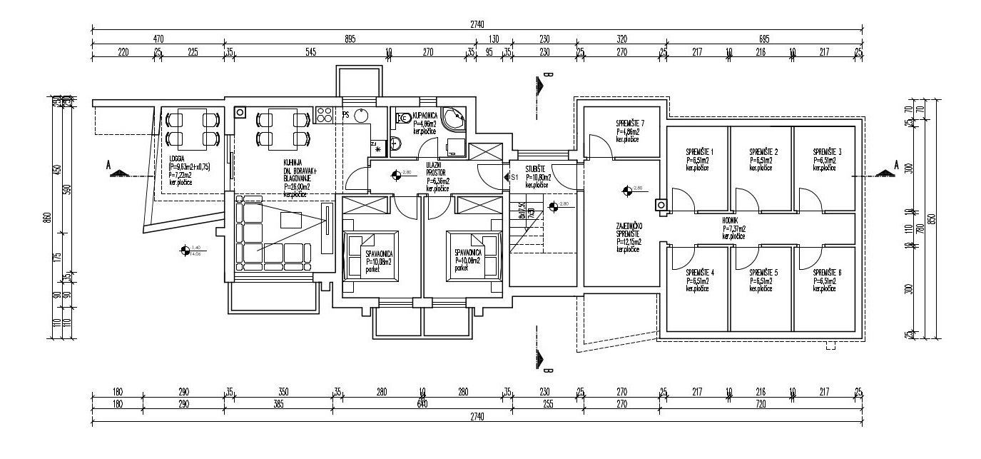 Es besteht aus: zwei Schlafzimmern, Wohnzimmer + Küche + Esszimmer, Badezimmer und Loggia.