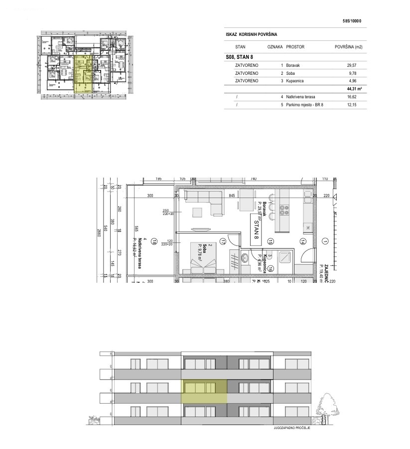 Es besteht aus: einem Schlafzimmer, Wohnzimmer + Küche + Esszimmer, Badezimmer und Terrasse.