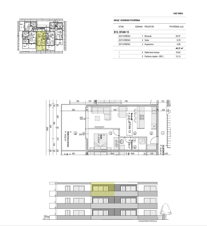 Es besteht aus: einem Schlafzimmer, Wohnzimmer + Küche + Esszimmer, Badezimmer und Terrasse.