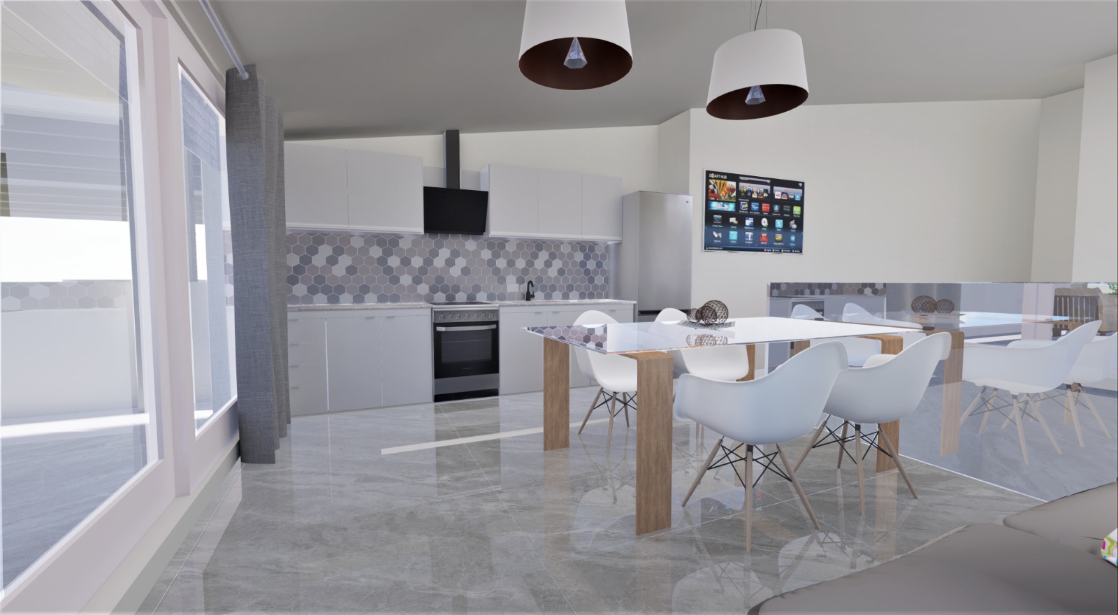 Es besteht aus: einem Schlafzimmer, Wohnzimmer + Küche + Esszimmer, Flur, Badezimmer und Terrasse.