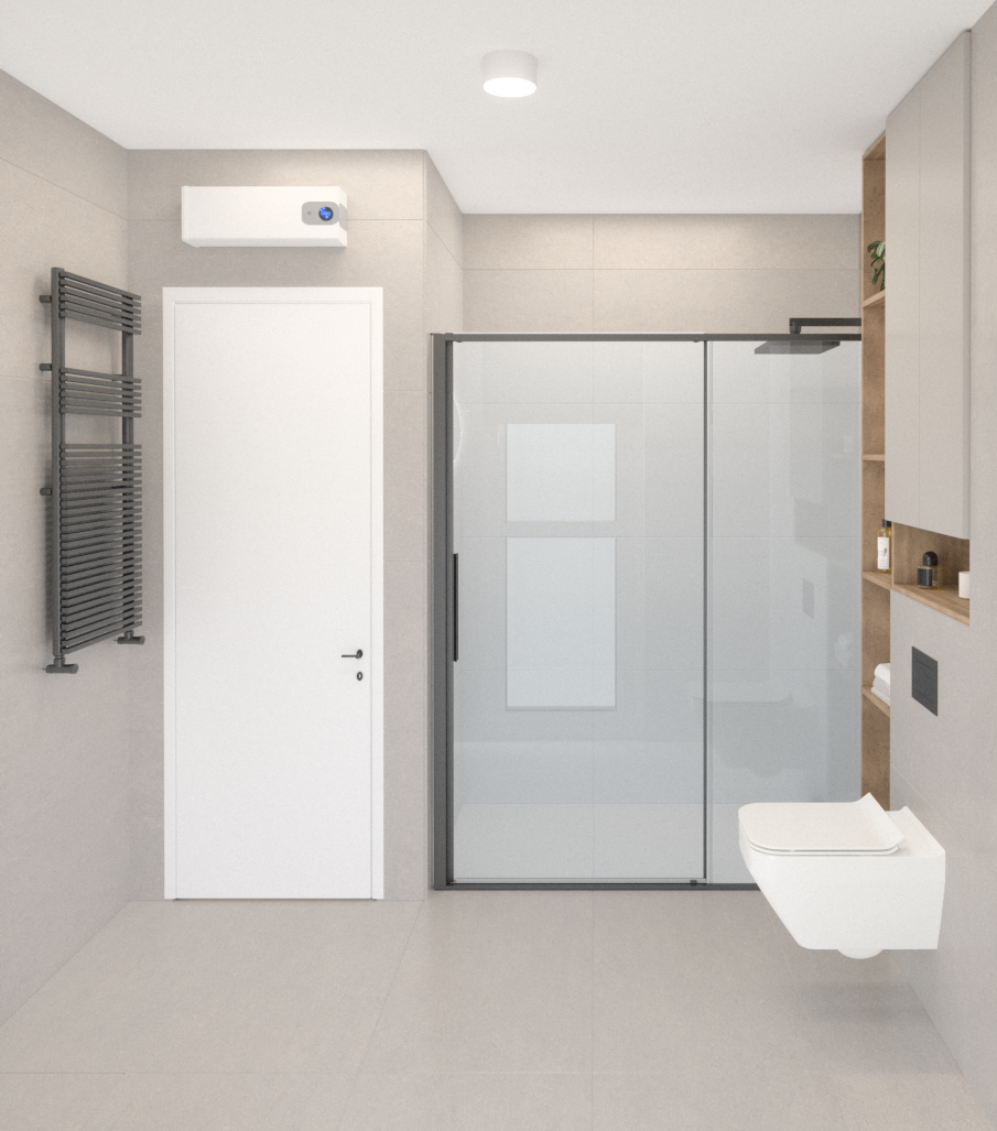 • Jedes Badezimmer verfügt über einen 80-Liter-Warmwassertank von Electrolux oder Ariston, der über WLAN gesteuert wird.