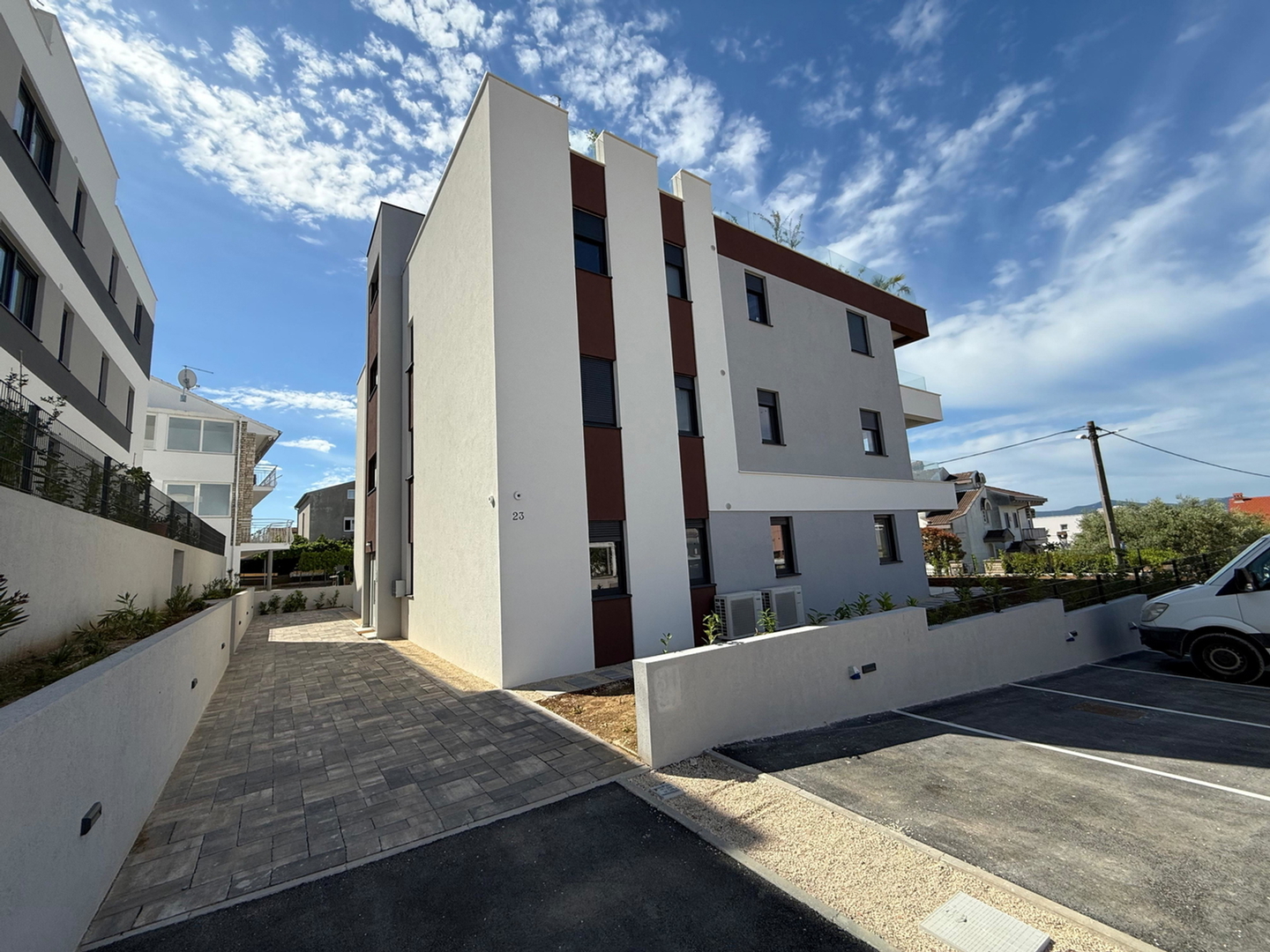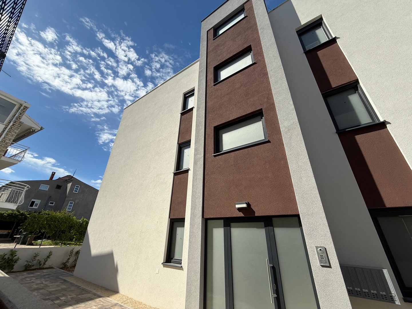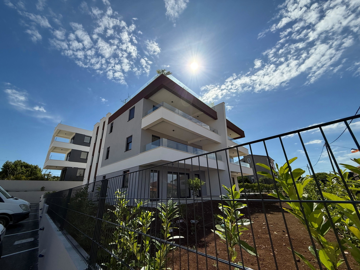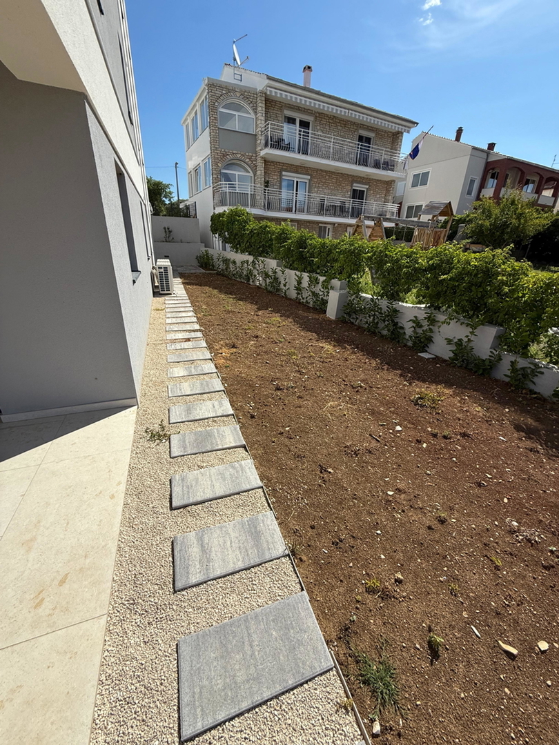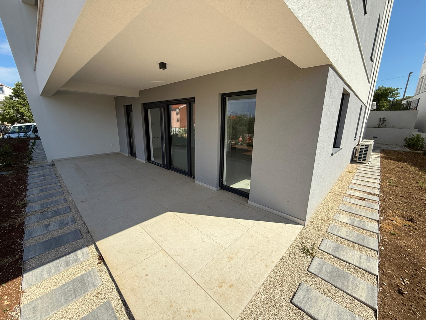 Zadar – Diklo, Drei-Zimmer-Wohnung mit 118 m2 zu verkaufen im Erdgeschoss eines Wohngebäudes, Baujahr 2025, hochwertige Bauweise, Thermofassade, Videoüberwachung, Klimaanlage in jedem Zimmer, elektrische Rollläden, Moskitonetze zum Schutz vor Insekten, Video-Gegensprechanlage, Sicherheitstüren, Fußbodenheizung, Aufzug usw.