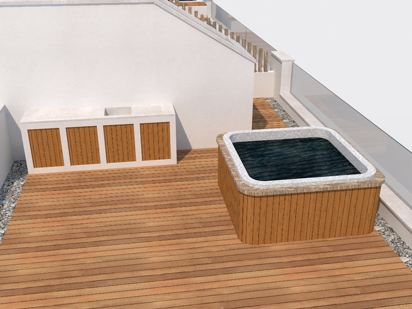 Die Wohnung ist komplett möbliert und ausgestattet und der Whirlpool befindet sich auf der Dachterrasse.