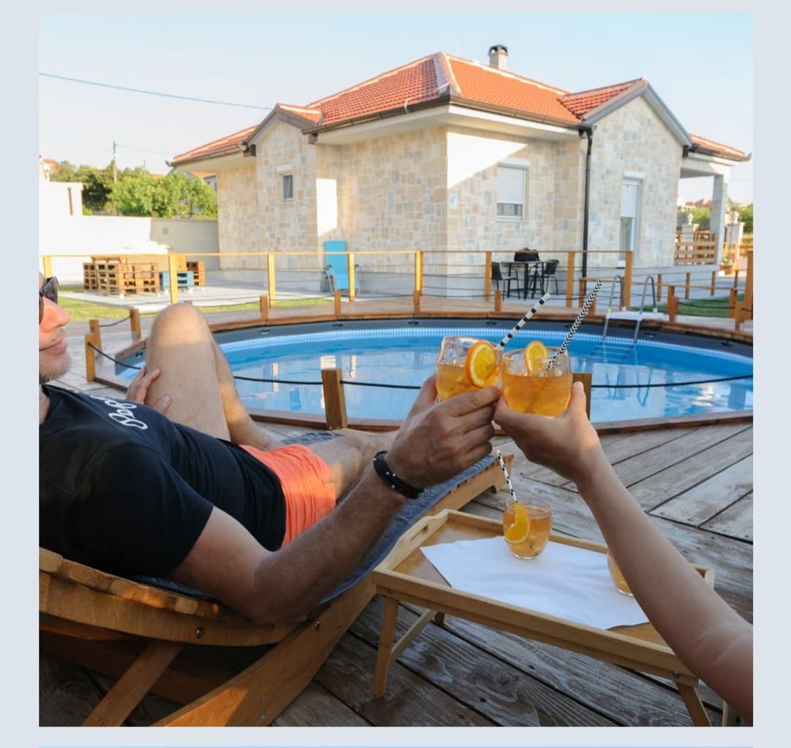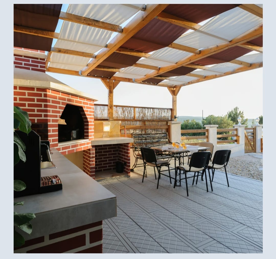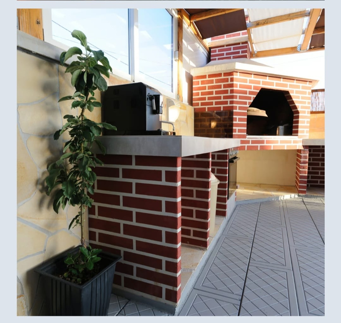 Es verfügt über zwei Parkplätze, einen Swimmingpool, einen Abstellraum, eine Außenküche mit Kamin und einen Spielbereich für Kinder.