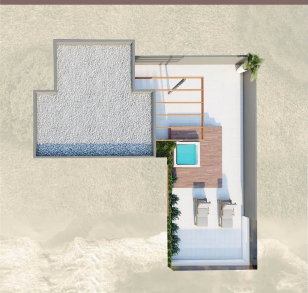 Es besteht aus: zwei Schlafzimmern, Wohnzimmer + Küche + Esszimmer, Flur, Badezimmer und Terrasse.