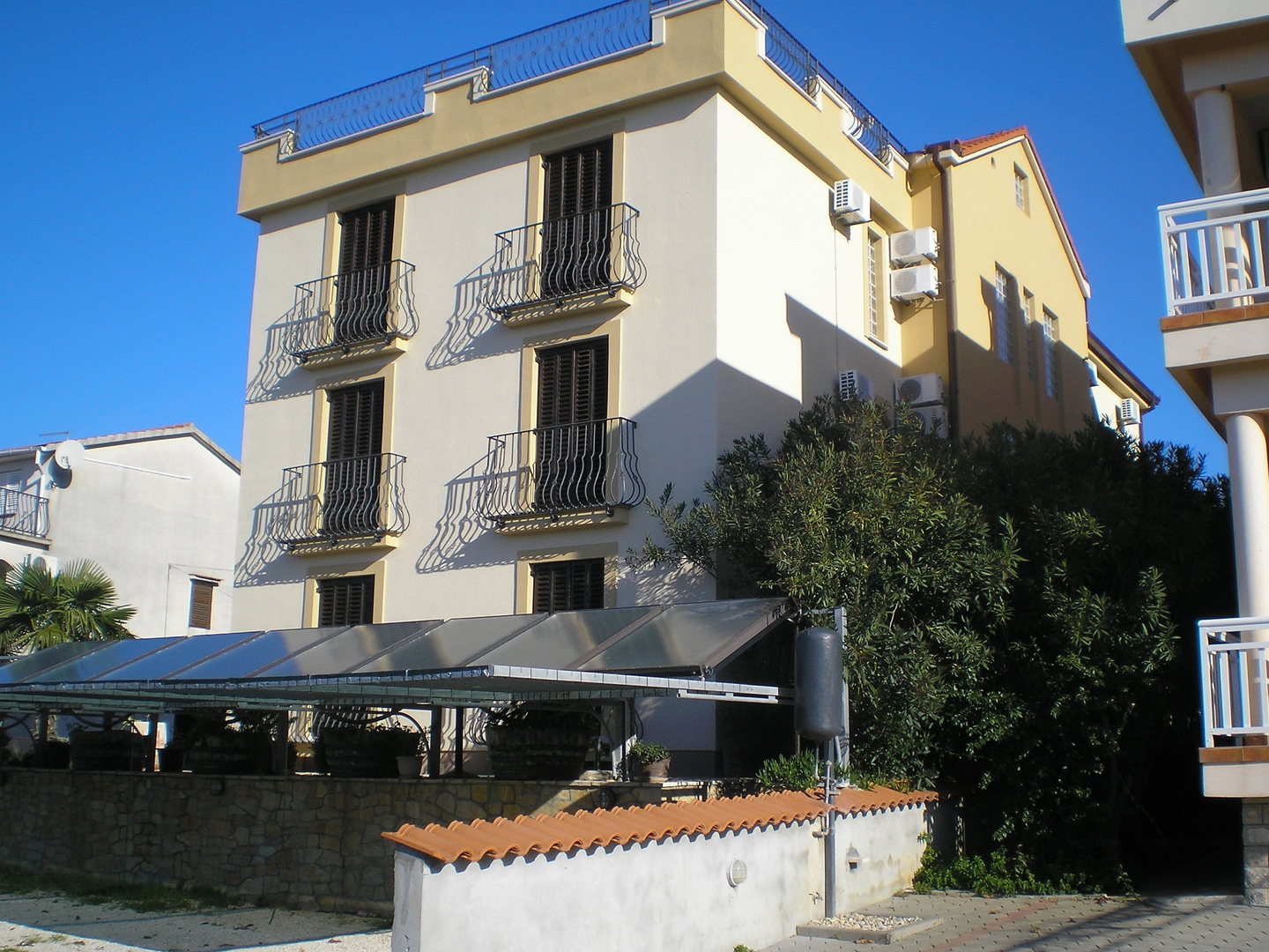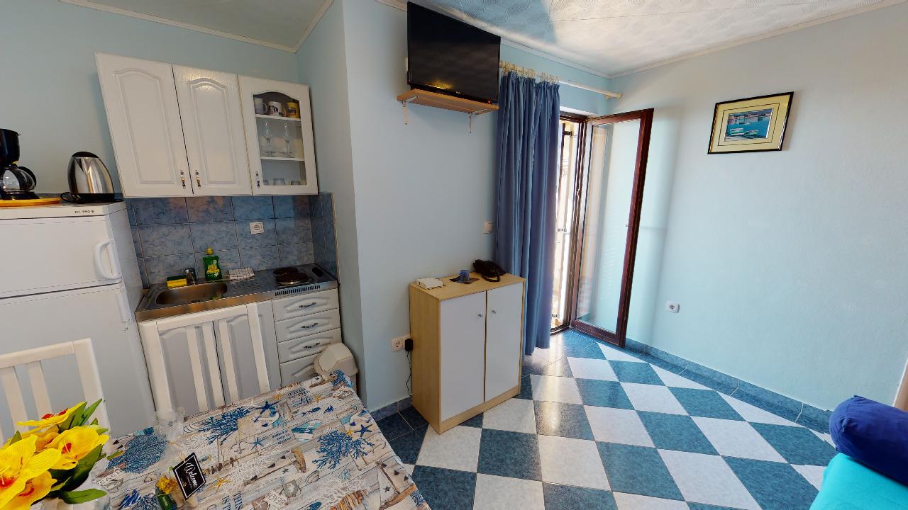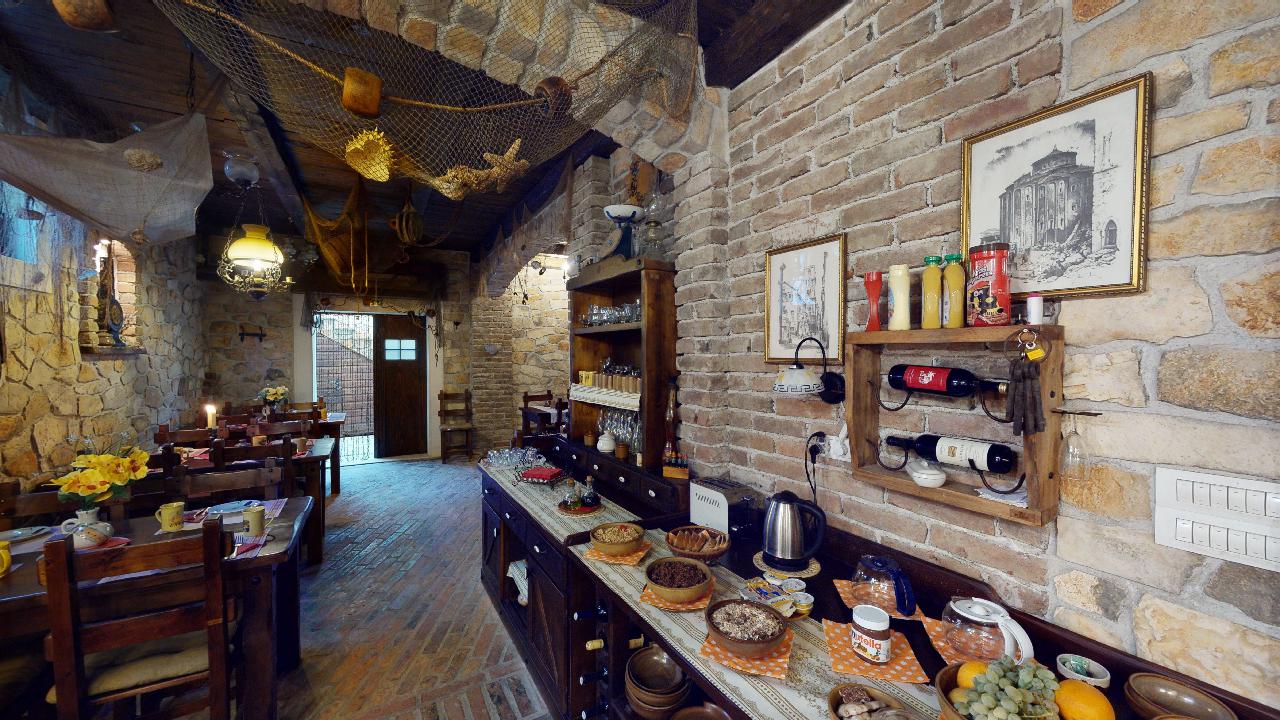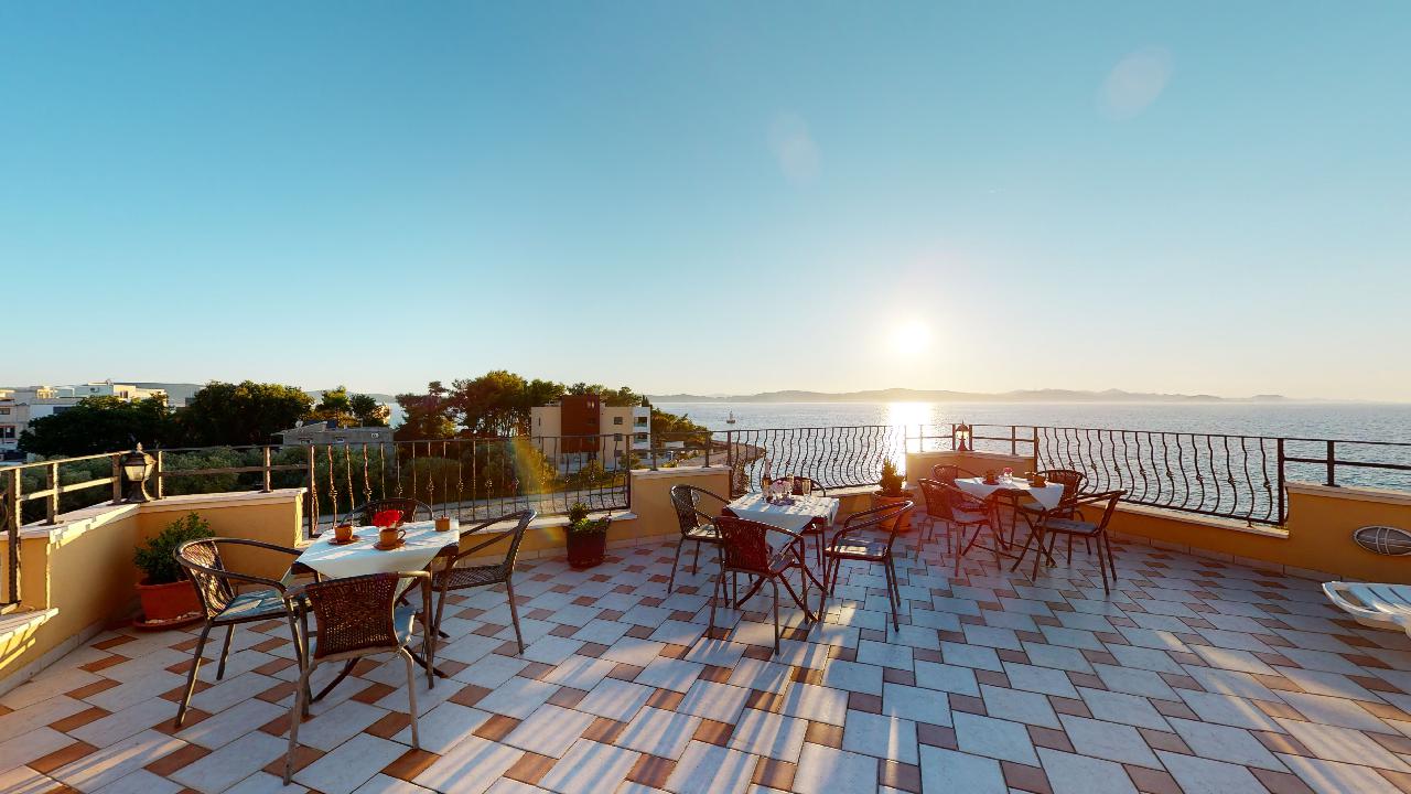 Es verfügt über zehn Parkplätze, ein Restaurant – Taverne mit 42 Sitzplätzen, das für Gäste der Anlage genutzt wird, eine Dachterrasse und einen angelegten Garten.