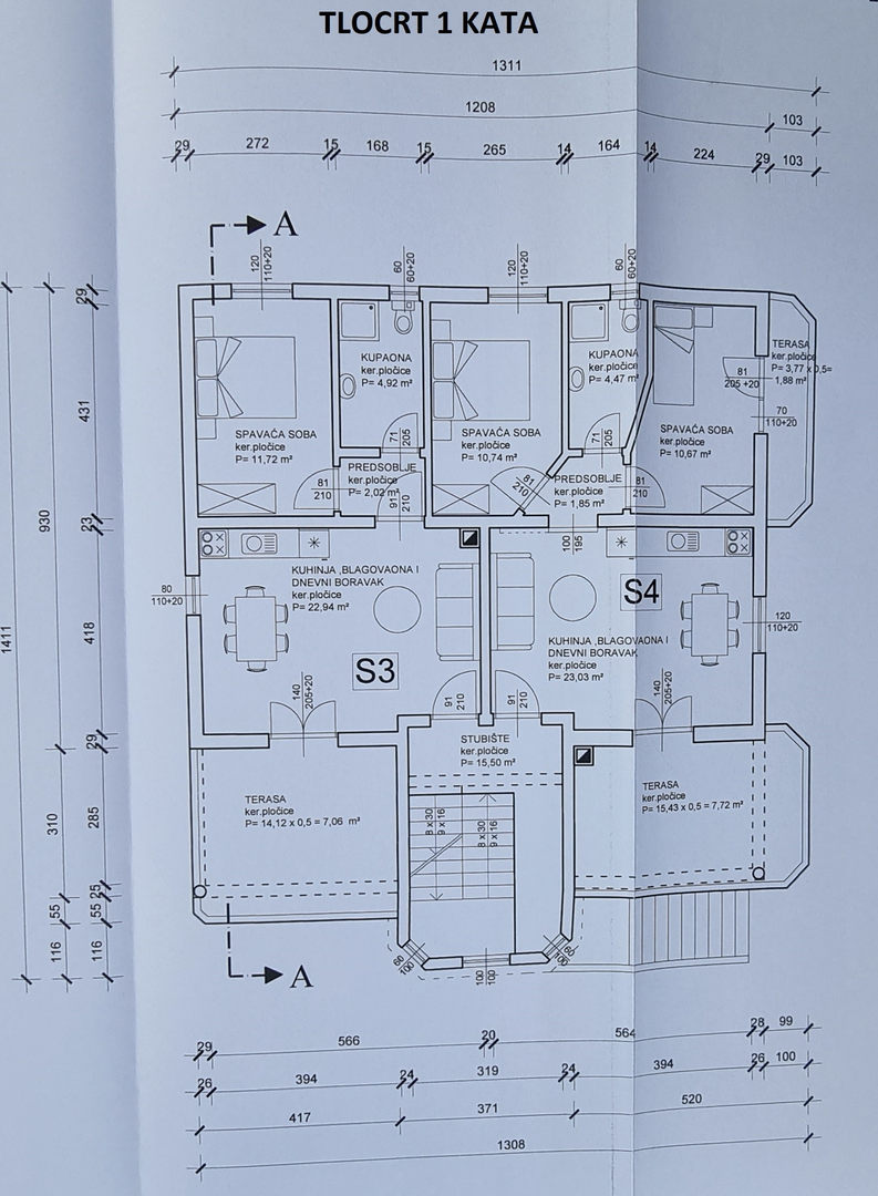 – Wohnung 1: ein Schlafzimmer, Wohnzimmer + Küche + Esszimmer, Flur, Badezimmer und Terrasse.