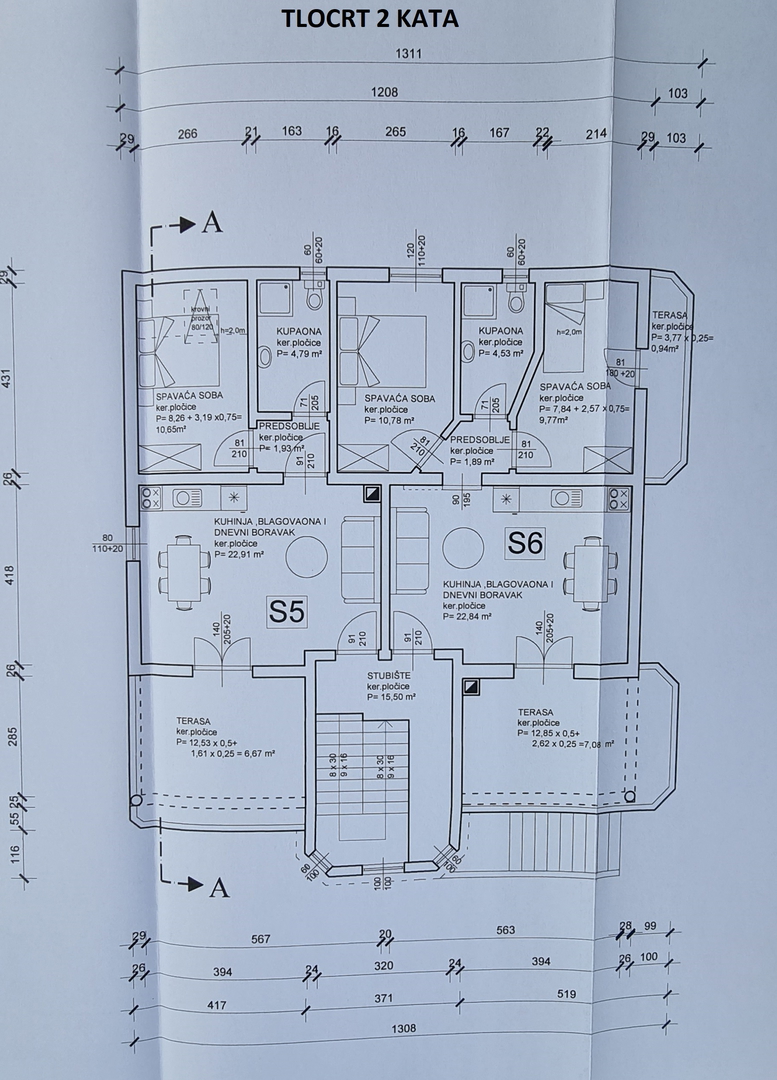 – Wohnung 2: zwei Schlafzimmer, Wohnzimmer + Küche + Esszimmer, Flur, Badezimmer und Terrasse.