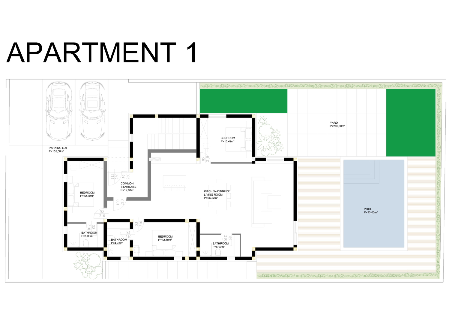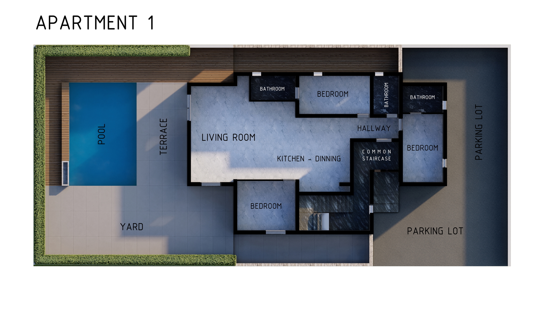 Es besteht aus: drei Schlafzimmern, Wohnzimmer + Küche + Esszimmer, Flur, drei Badezimmern und einer Terrasse.