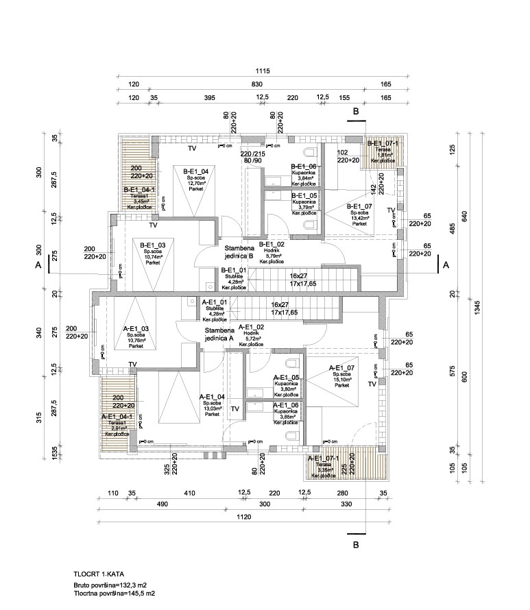 – Erster Stock: drei Schlafzimmer, zwei Badezimmer, Flur und zwei Terrassen.