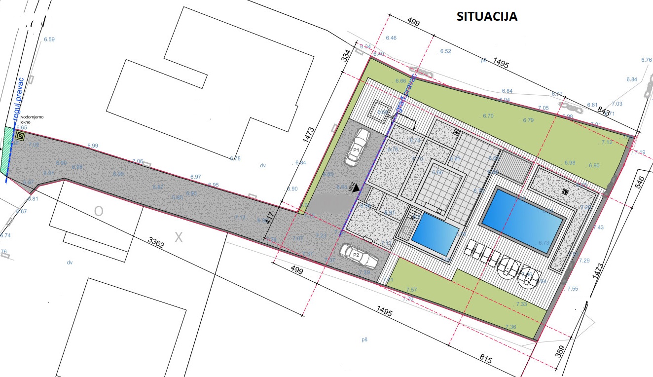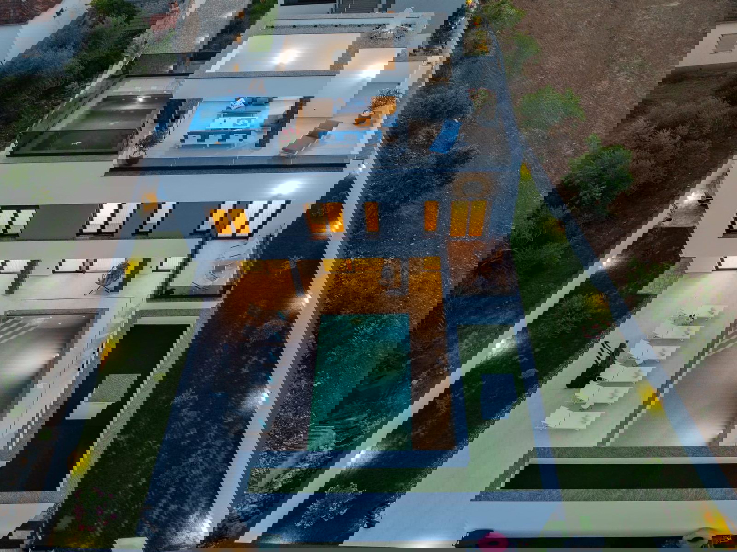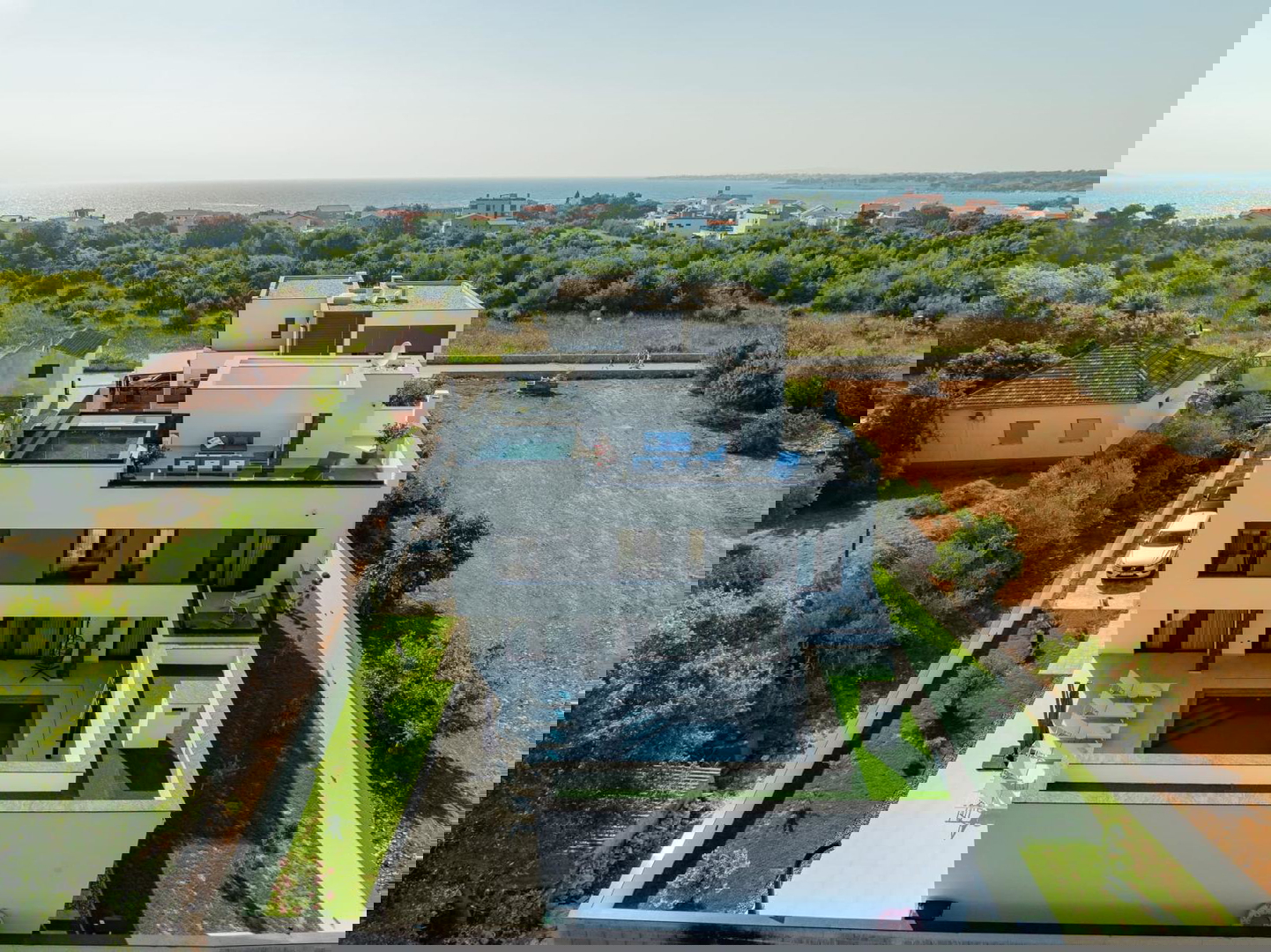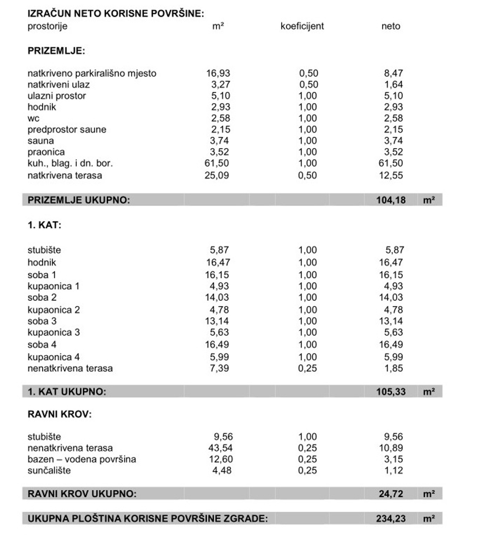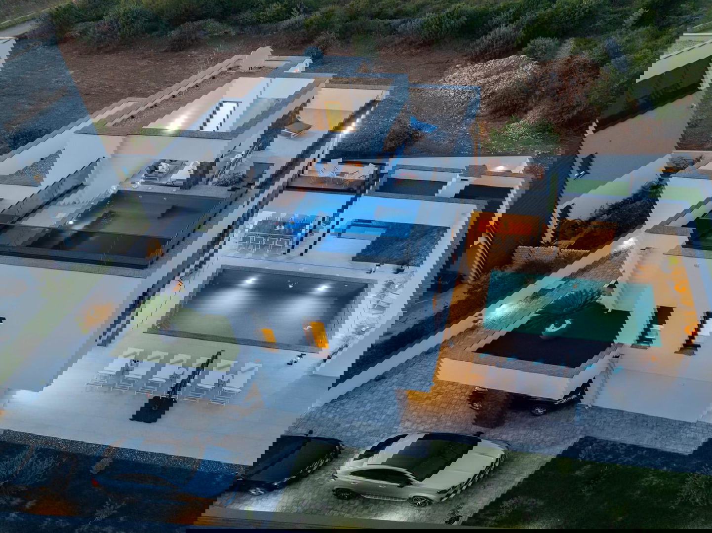 Zadar – Zaton, zu verkaufen: freistehende Villa mit einer Wohnfläche von 234,23 m2, Baujahr 2024 auf einem Grundstück von 761 m2, hochwertige Konstruktion, gebaut mit Protherm-Ziegeln, Platten und Balken und Säulen aus Stahlbeton, Wärmedämmung (Fassade) 10 und 15 cm dick, PVC-Zimmerei in Anthrazitfarbe außen und Weiß im Gebäude, Heben und Senken von elektrischen Jalousien, Heizung des Gebäudes und des Sanitärwassers über eine Wärmepumpe, Kühlung und Zusatzheizung über eine Klimaanlage, Ableitung von Fäkalienwasser in einen biologischen Reiniger, Spannung dreiphasig 13,80 kW, Schwimmbecken aus Stahlbeton (Außenbecken im Hof des Gebäudes, 1,5 m tief, und ein kleineres Becken auf der Dachterrasse, 1 m tief), gleichzeitig wird eine Wärmepumpe zur Erwärmung des Poolwassers installiert, und in der Anlage wird eine Videoüberwachung installiert. Der Swimmingpool im Hof des Gebäudes ist so gelegen, dass er geschlossen werden kann (bioklimatische Pergola oder Markise und Glaswände), etc…