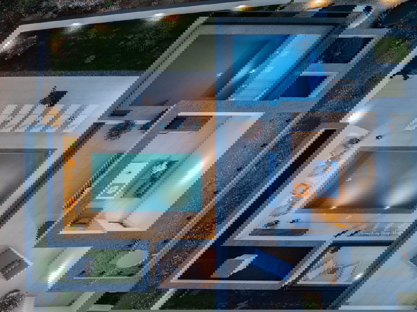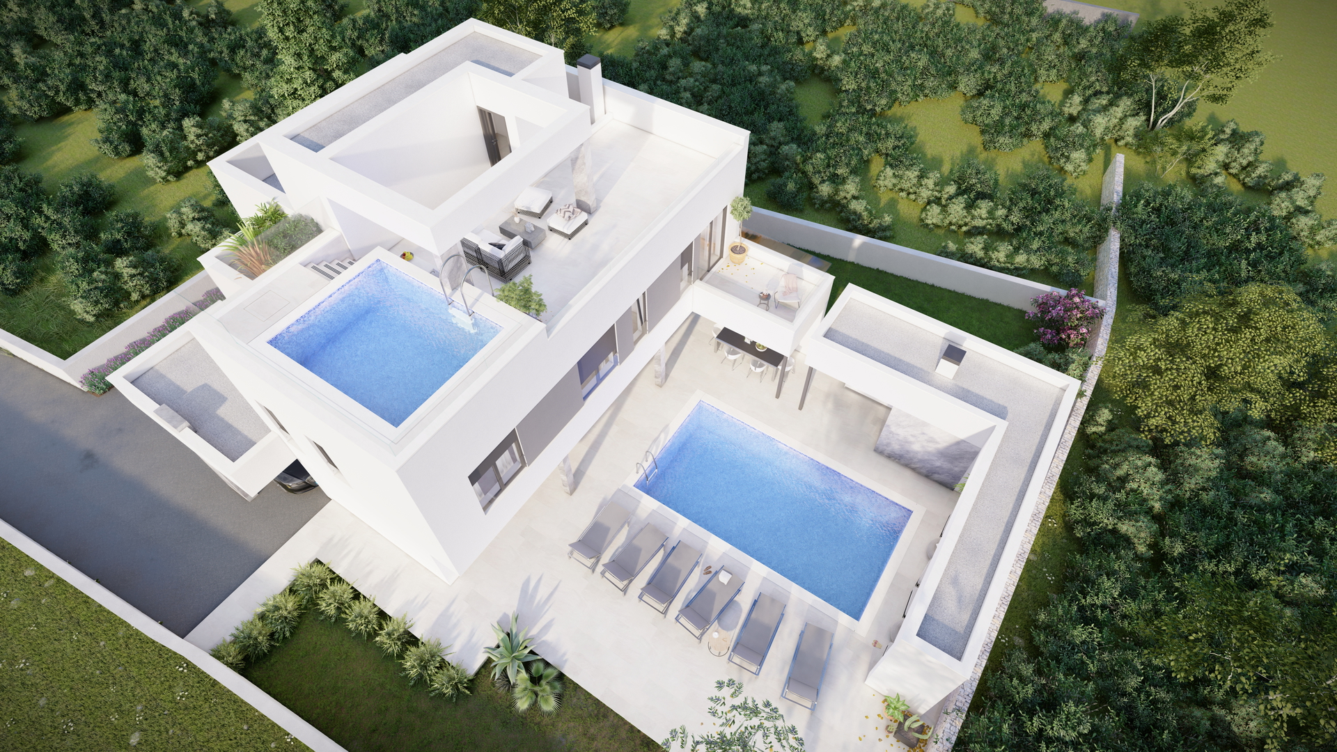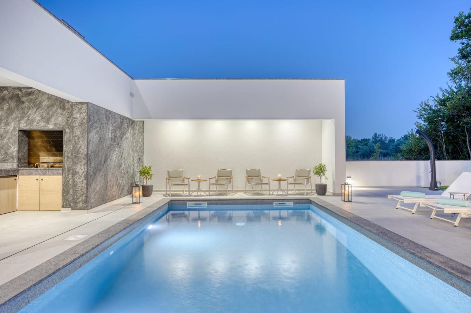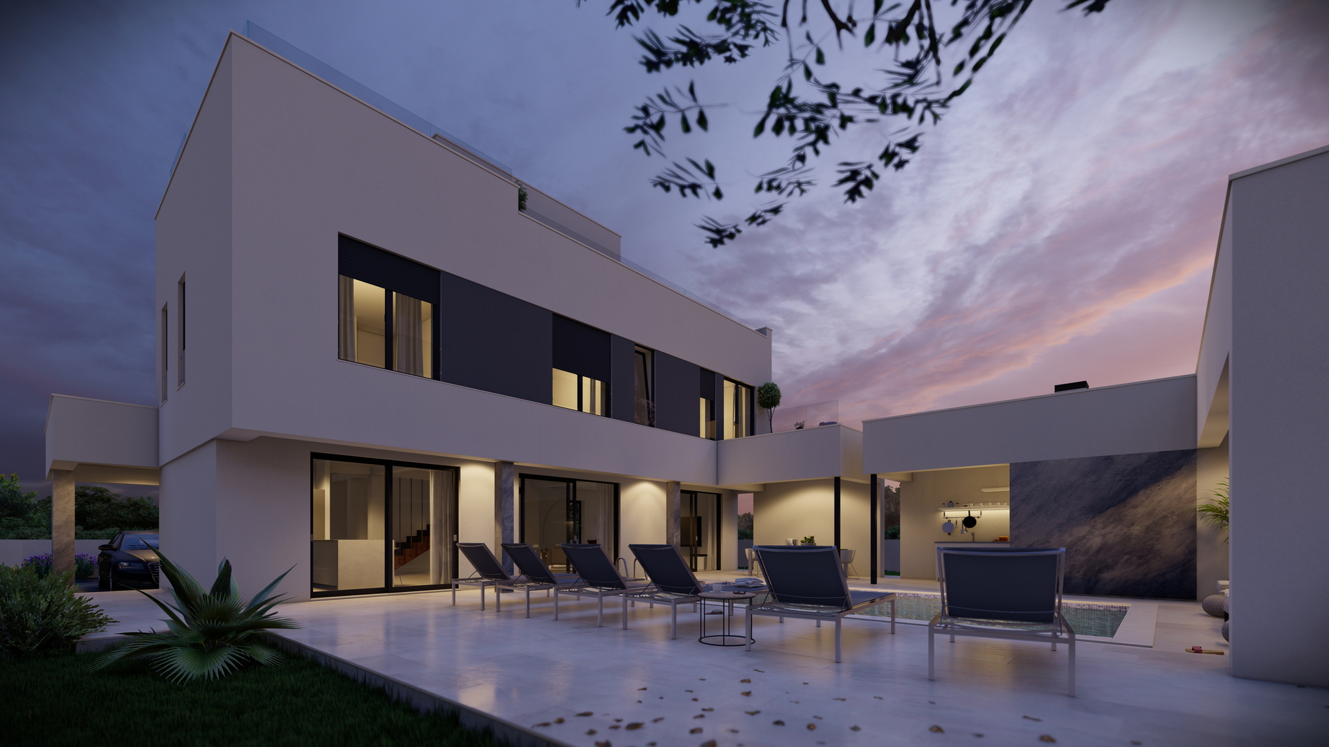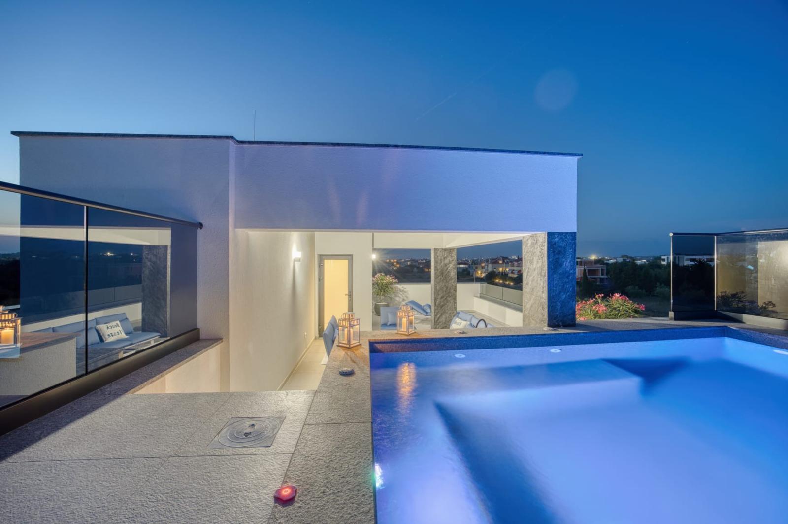 Zadar – Zaton, zu verkaufen: freistehende Villa mit einer Wohnfläche von 234,23 m2, Baujahr 2024 auf einem Grundstück von 761 m2, hochwertige Konstruktion, gebaut mit Protherm-Ziegeln, Platten und Balken und Säulen aus Stahlbeton, Wärmedämmung (Fassade) 10 und 15 cm dick, PVC-Zimmerei in Anthrazitfarbe außen und Weiß im Gebäude, Heben und Senken von elektrischen Jalousien, Heizung des Gebäudes und des Sanitärwassers über eine Wärmepumpe, Kühlung und Zusatzheizung über eine Klimaanlage, Ableitung von Fäkalienwasser in einen biologischen Reiniger, Spannung dreiphasig 13,80 kW, Schwimmbecken aus Stahlbeton (Außenbecken im Hof des Gebäudes, 1,5 m tief, und ein kleineres Becken auf der Dachterrasse, 1 m tief), gleichzeitig wird eine Wärmepumpe zur Erwärmung des Poolwassers installiert, und in der Anlage wird eine Videoüberwachung installiert. Der Swimmingpool im Hof des Gebäudes ist so gelegen, dass er geschlossen werden kann (bioklimatische Pergola oder Markise und Glaswände), etc…