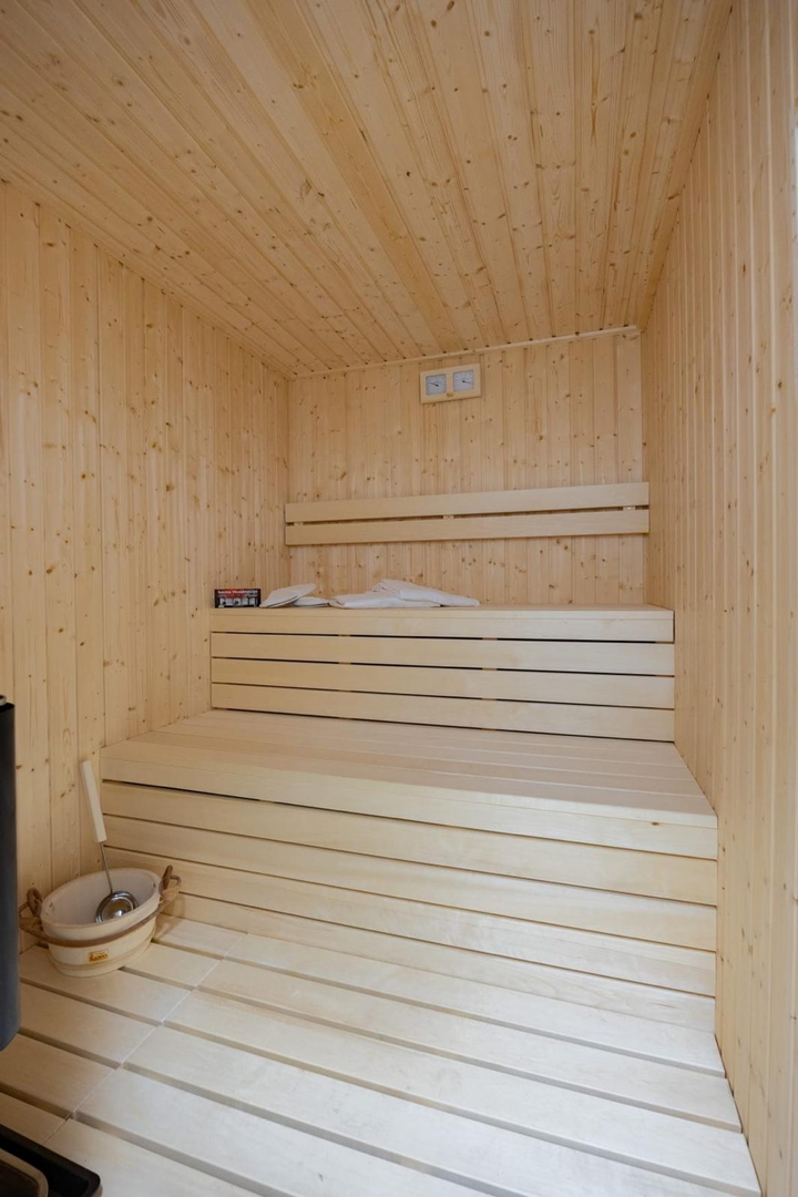 Erdgeschoss: Wohnzimmer + Küche + Esszimmer, Eingangshalle, Flur, Toilette, Sauna, Waschküche und Terrasse.