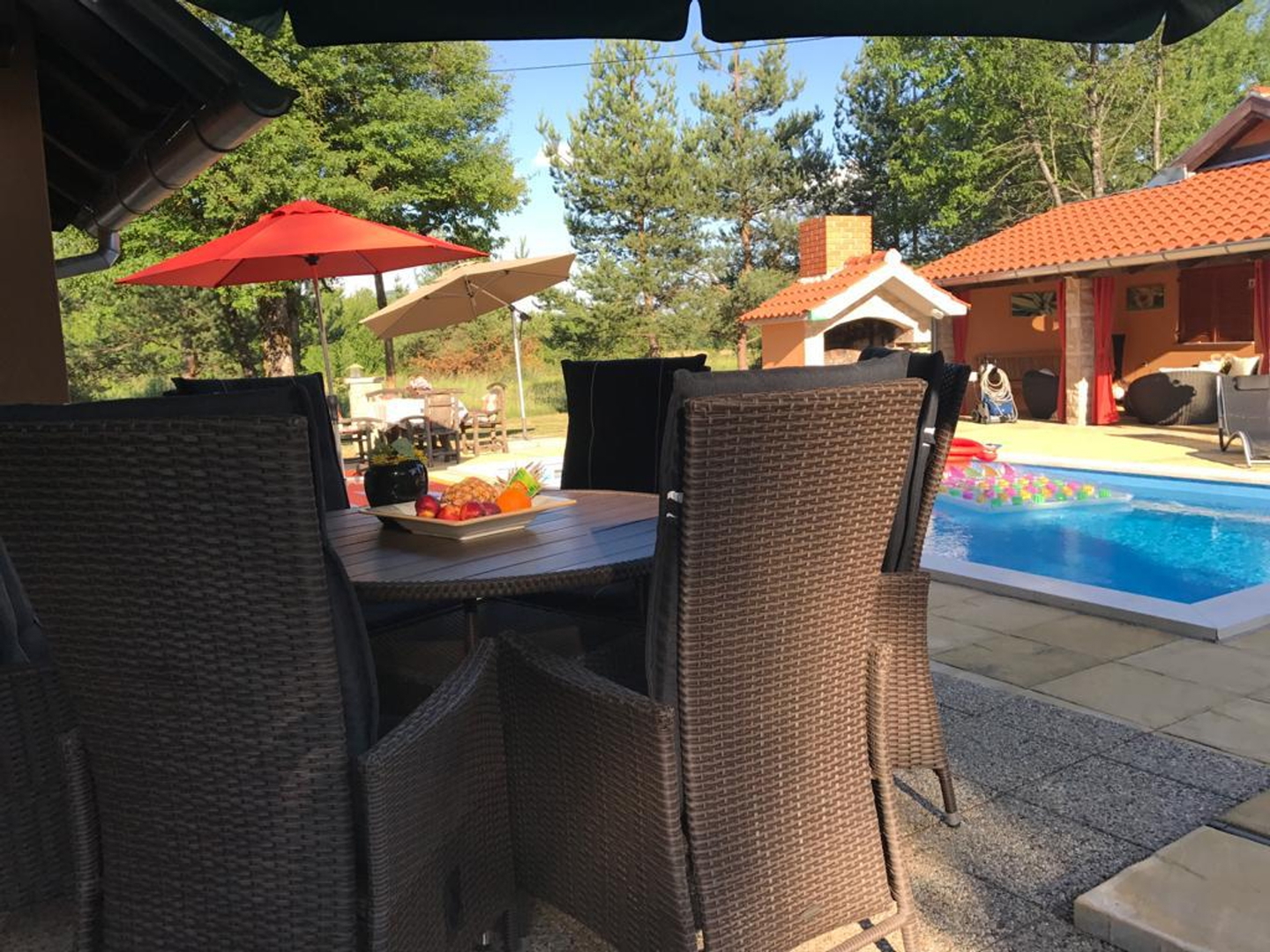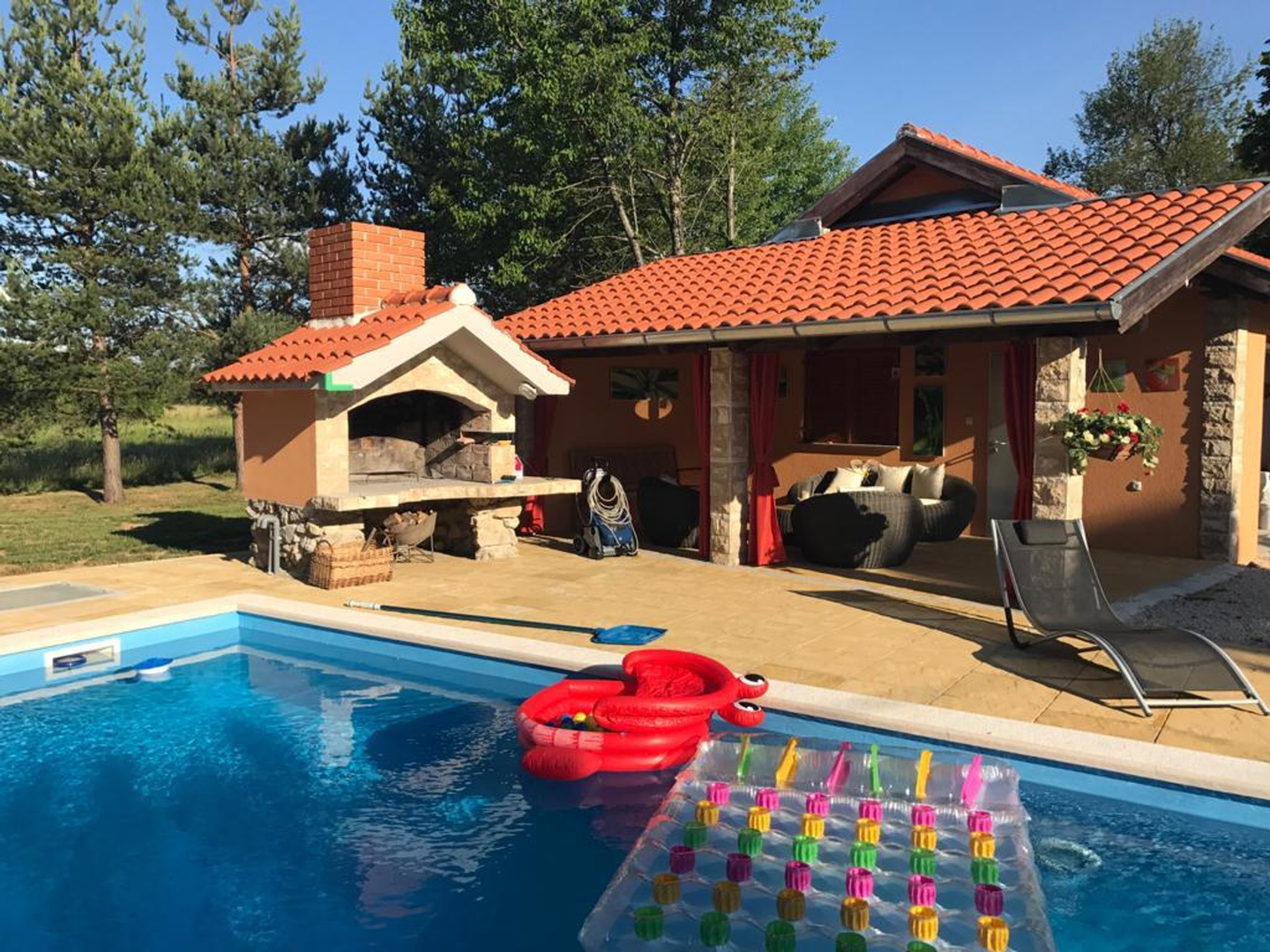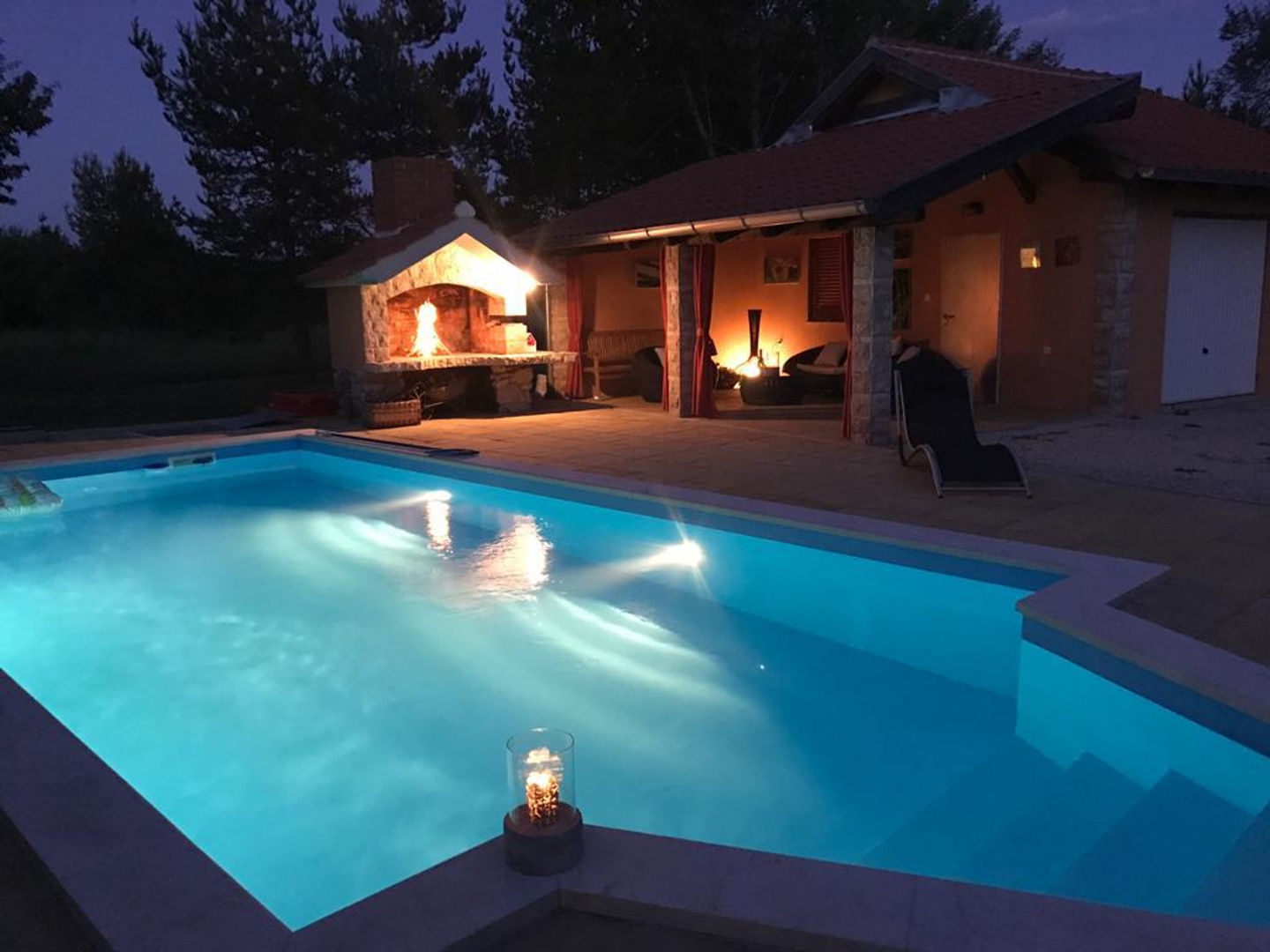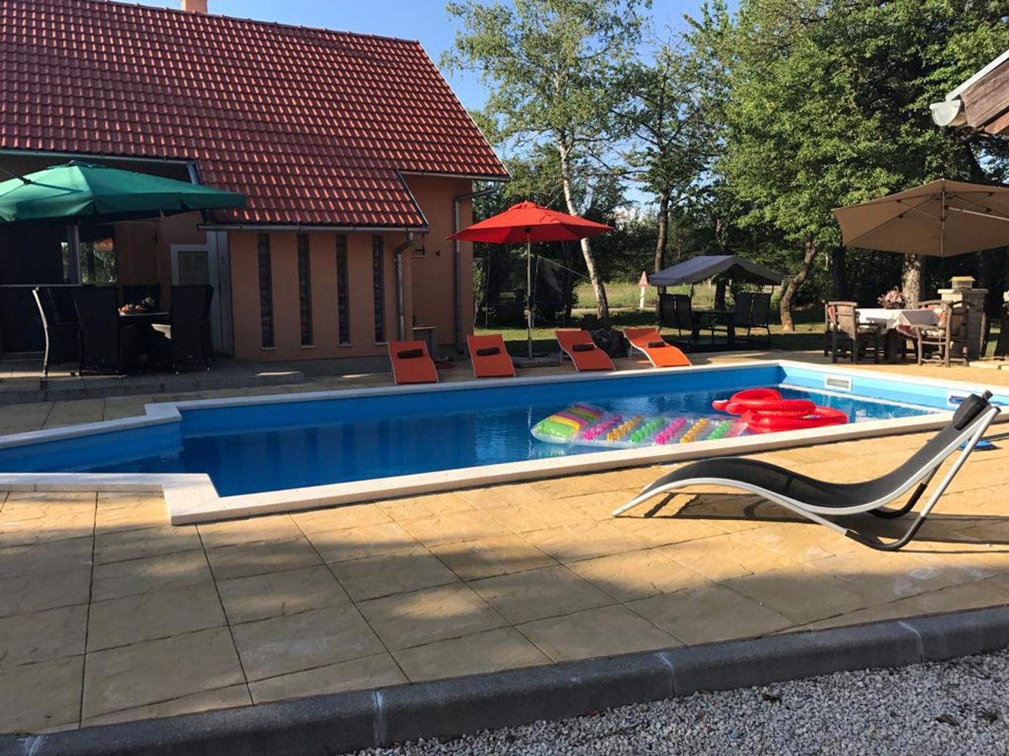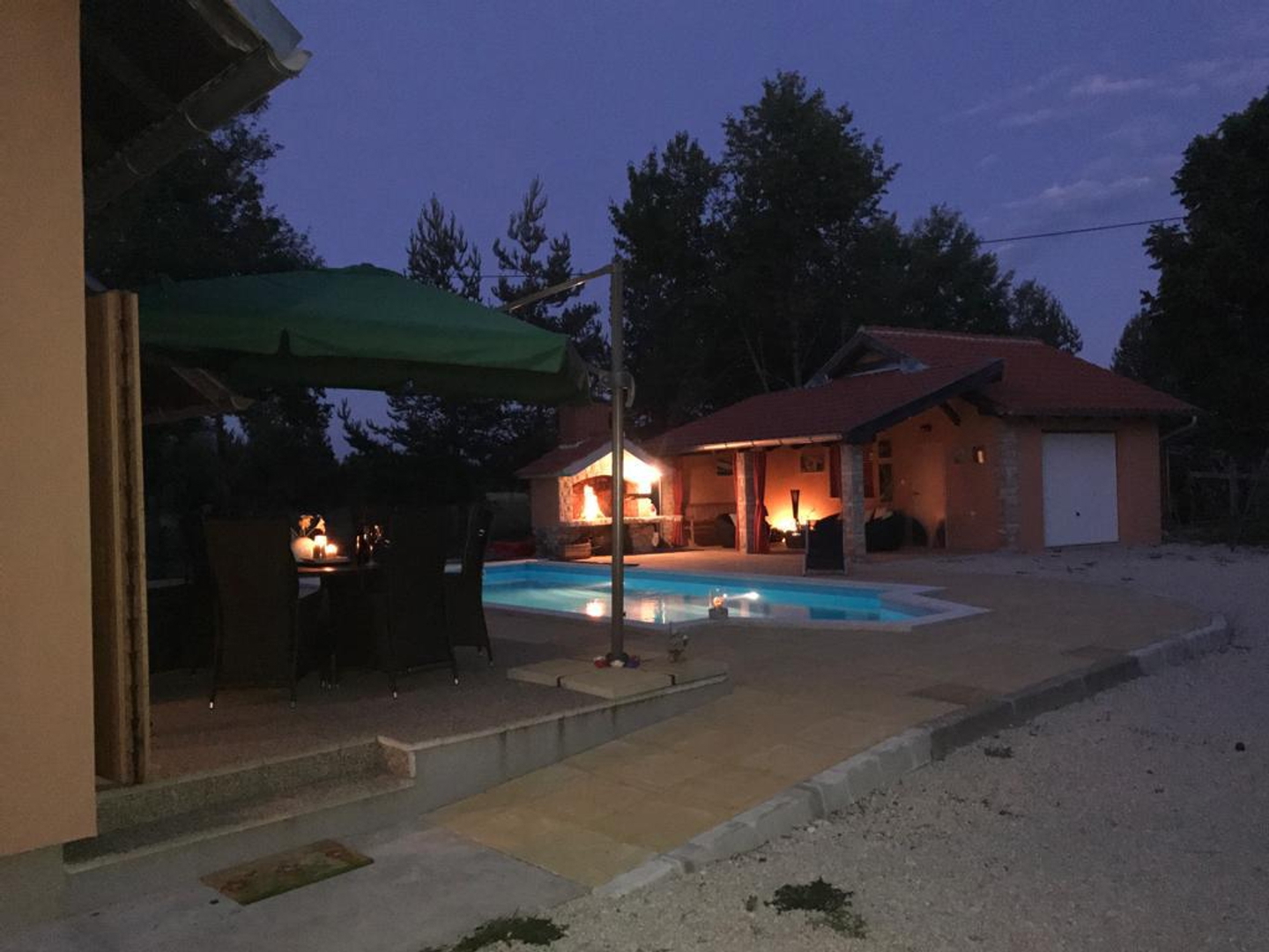 It has several parking spaces with an overhang, a swimming pool, a landscaped garden, a children’s playground, a garage, a chimney, etc…
