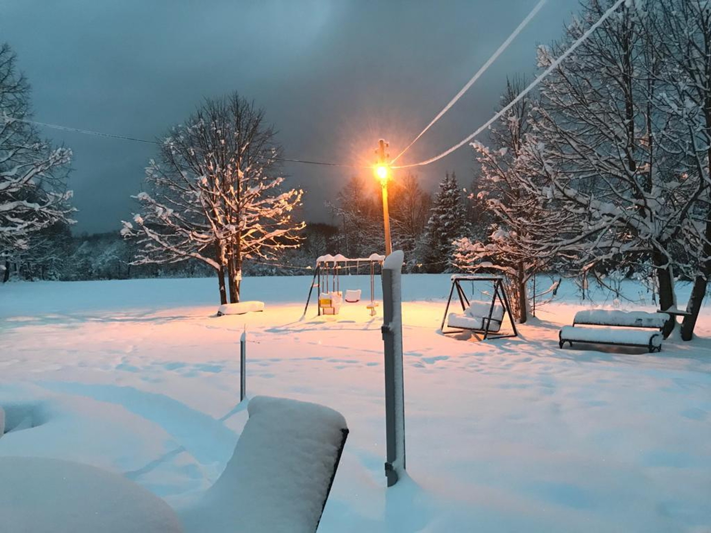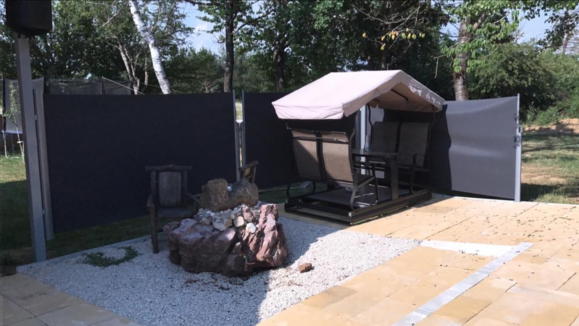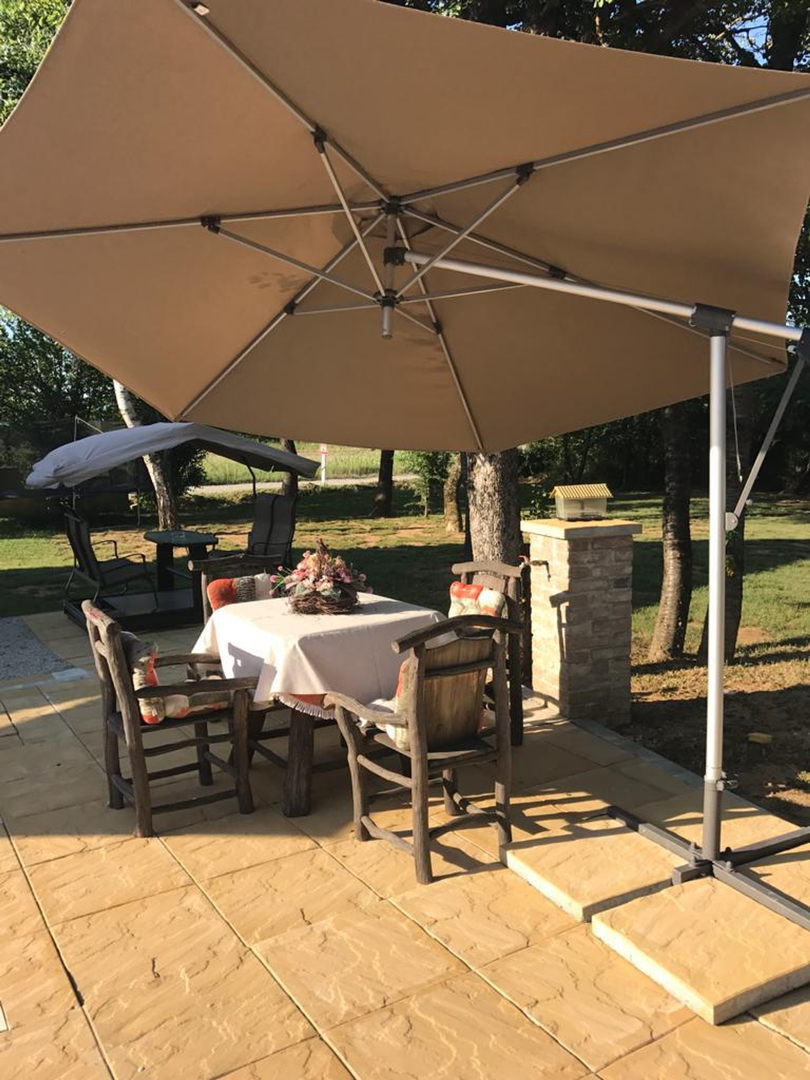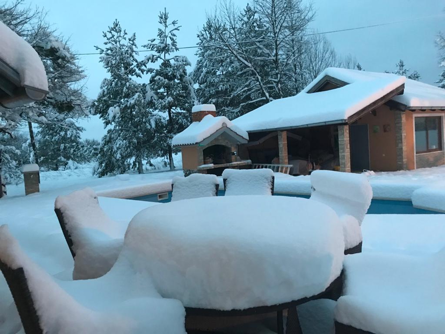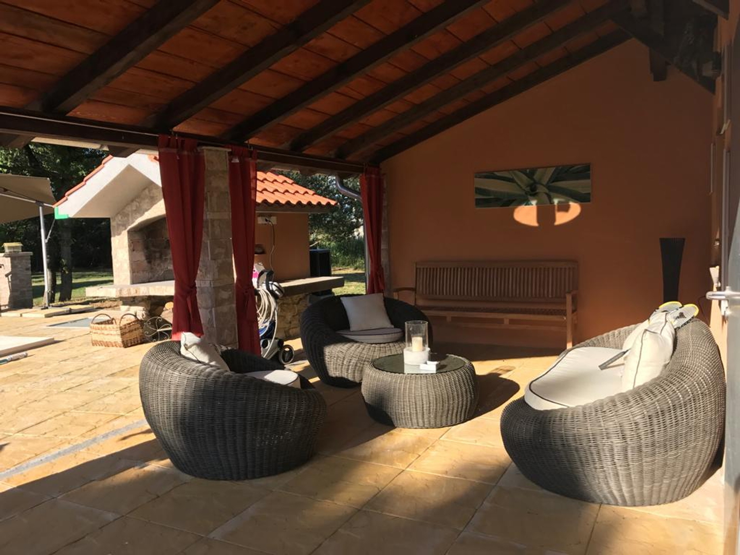 It has several parking spaces with an overhang, a swimming pool, a landscaped garden, a children’s playground, a garage, a chimney, etc…
