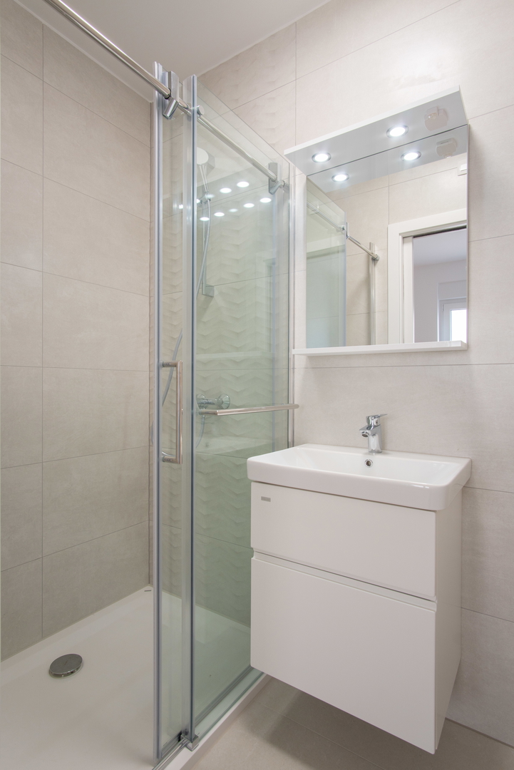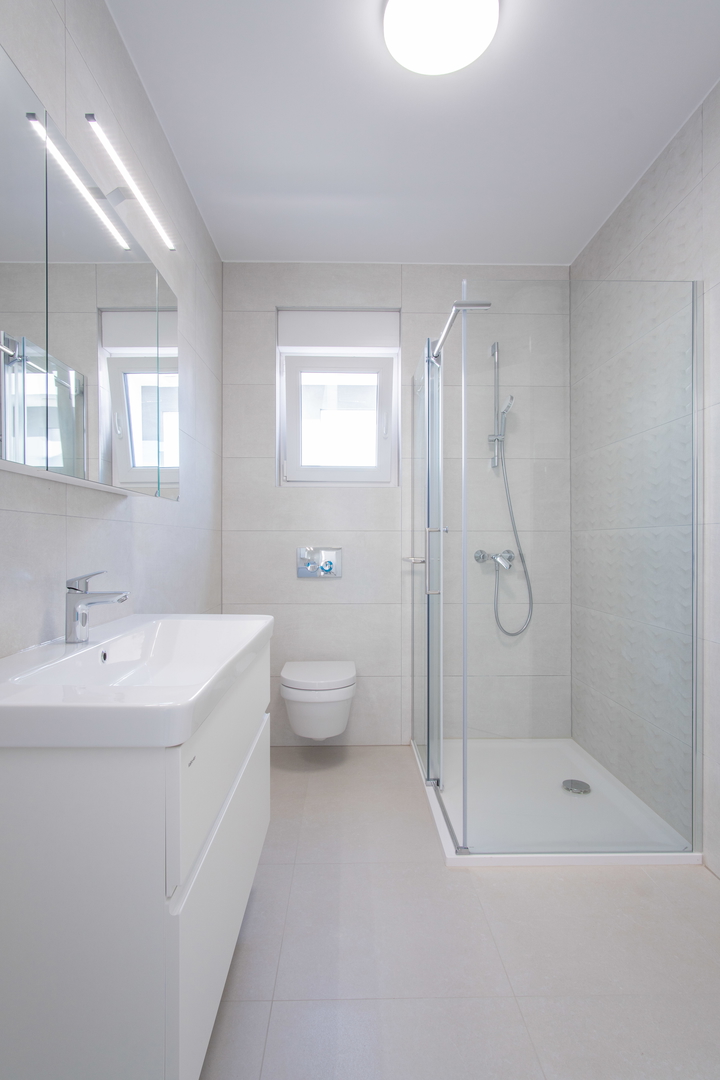 *BATHROOMS: underfloor heating, high-quality ceramics 120X40, walk-in glass showers, overhead mixers and shower heads, electric boiler, preparation for an electric bathroom radiator, electric blinds, built-in sink and faucet, SIKA waterproofing, GEBERIT water tanks