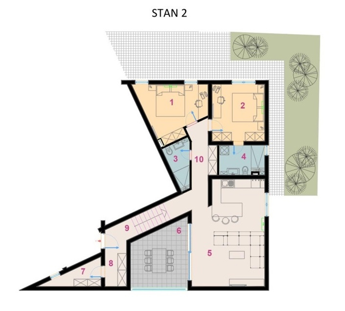 It consists of: two bedrooms, living room + kitchen + dining room, hallway, wardrobe, storage room, two bathrooms and terrace.