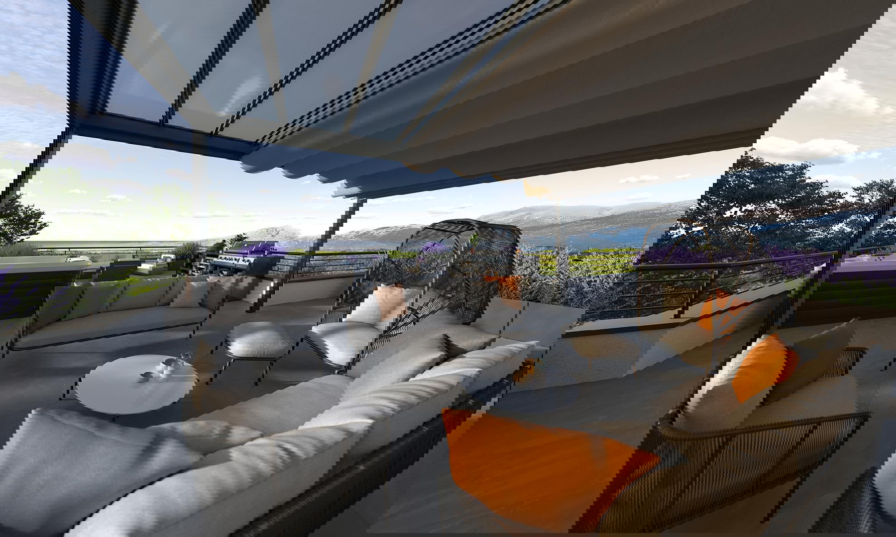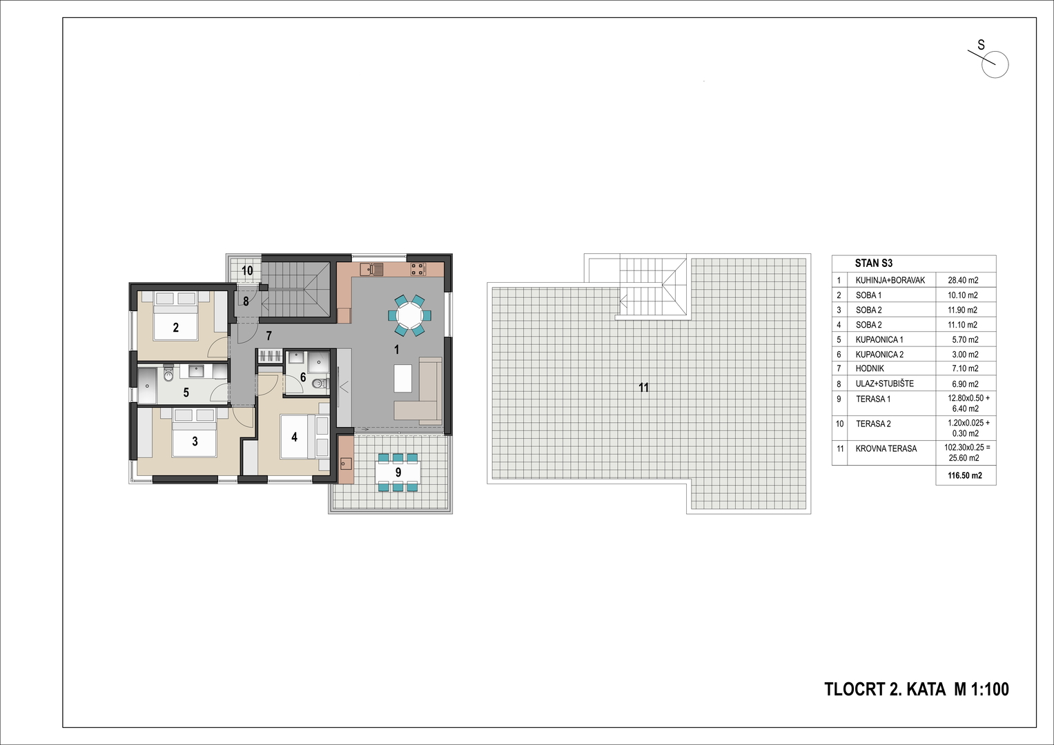 Pag – Mandre, three-bedroom apartment of 116.50 m2 for sale on the second floor of a residential building under construction, planned move-in date 06/2026. High-quality construction, underfloor heating throughout the apartment with WI-FI control, first-class floor coverings, 240cm high aluminum glass walls and corner windows, modern sanitary ware, exterior appearance with warm details such as stone walls in the courtyard, green areas and covered terraces, travertine-clad facade, etc….
