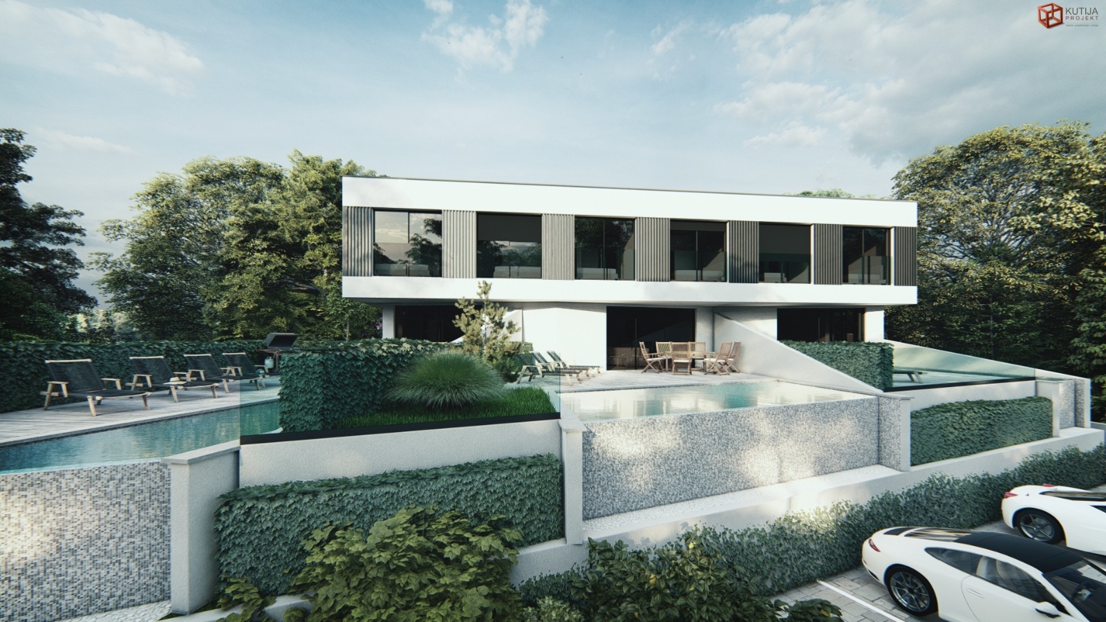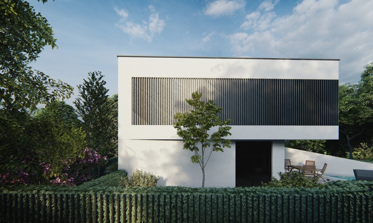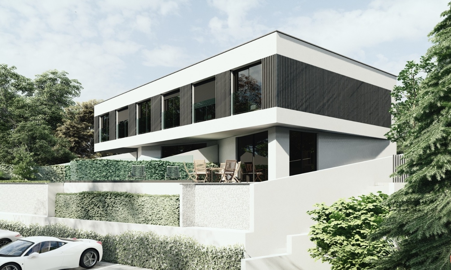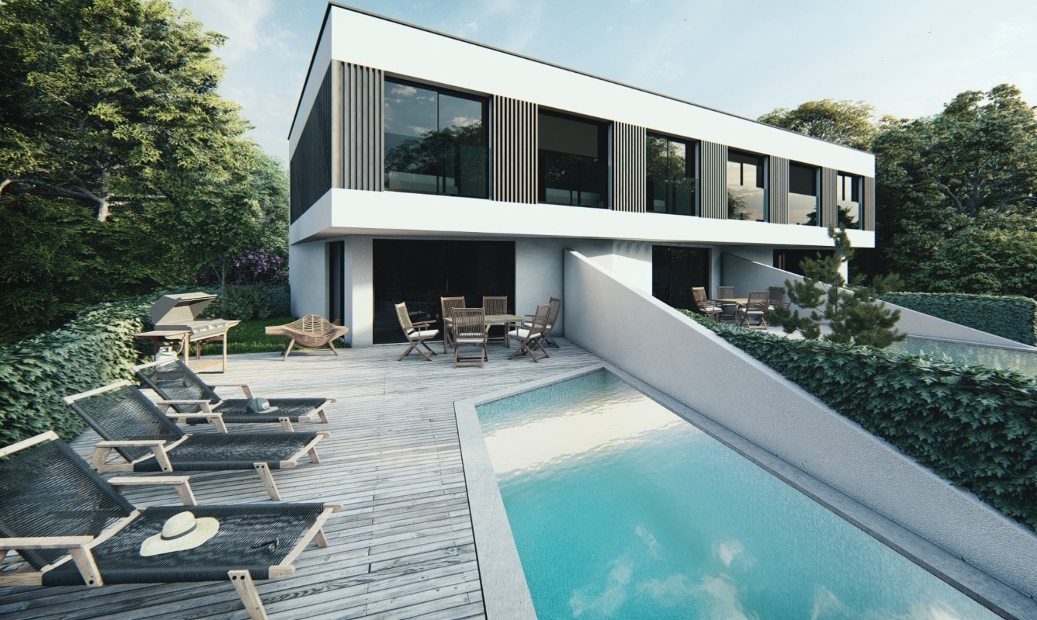 It has two parking spaces, a swimming pool of approx. 28 m2 and a garden of approx. 95 m2.