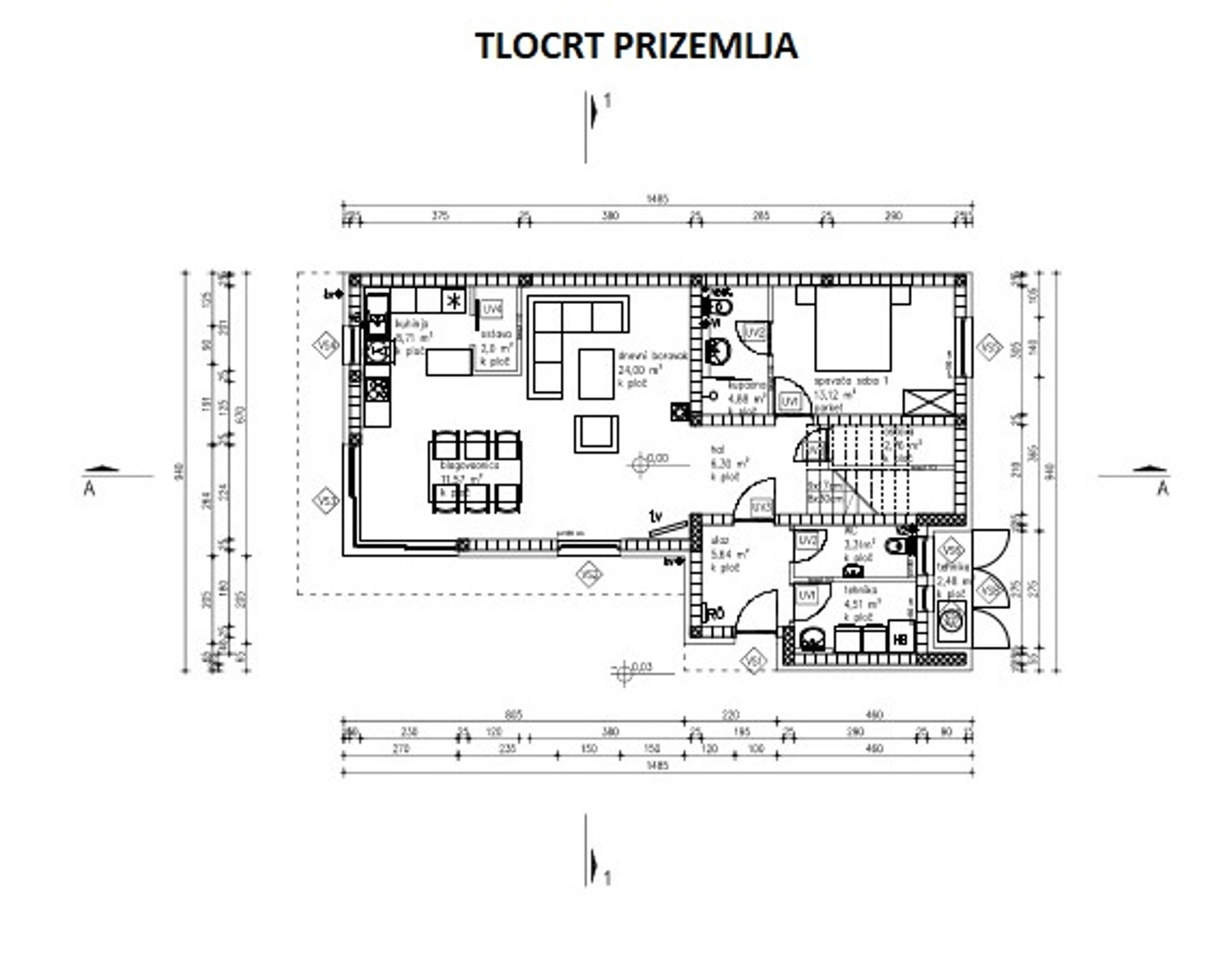 Ground floor: one bedroom, living room + kitchen + dining room, hallway, storage room, bathroom, toilet, laundry room and terrace.