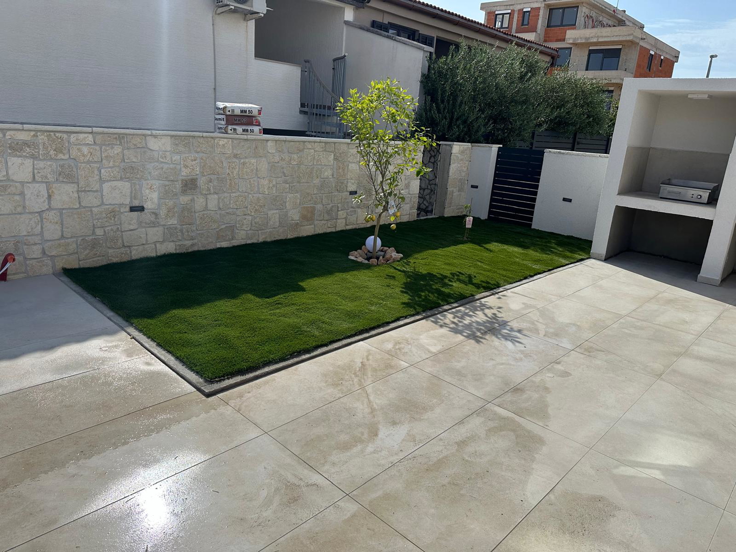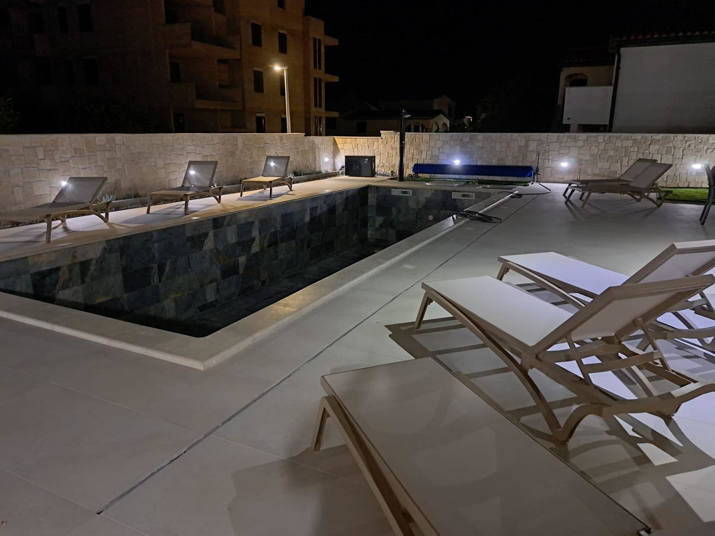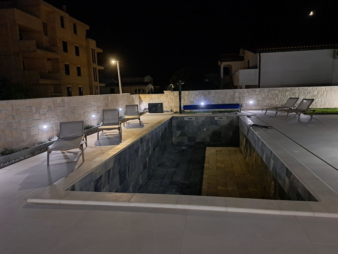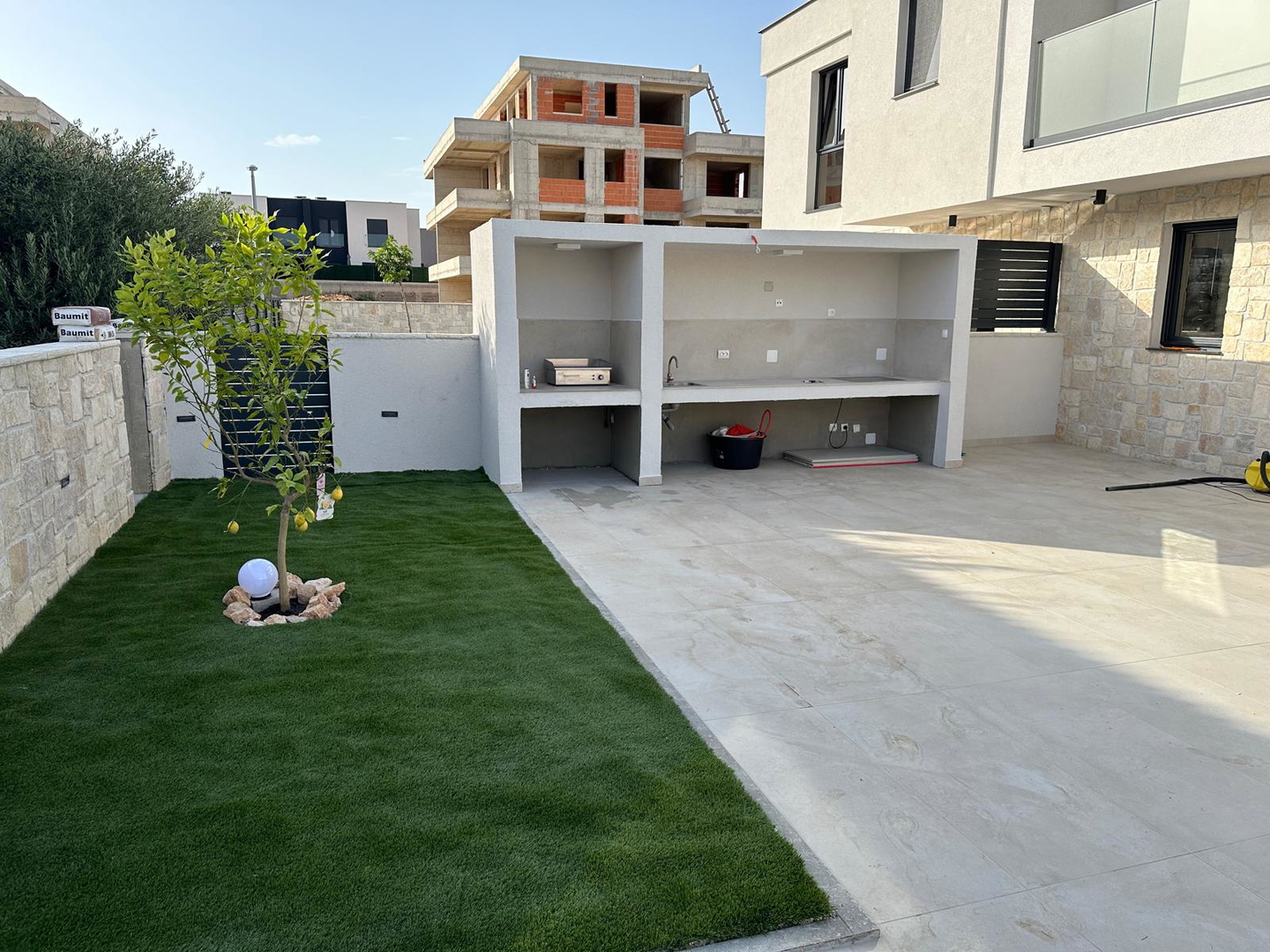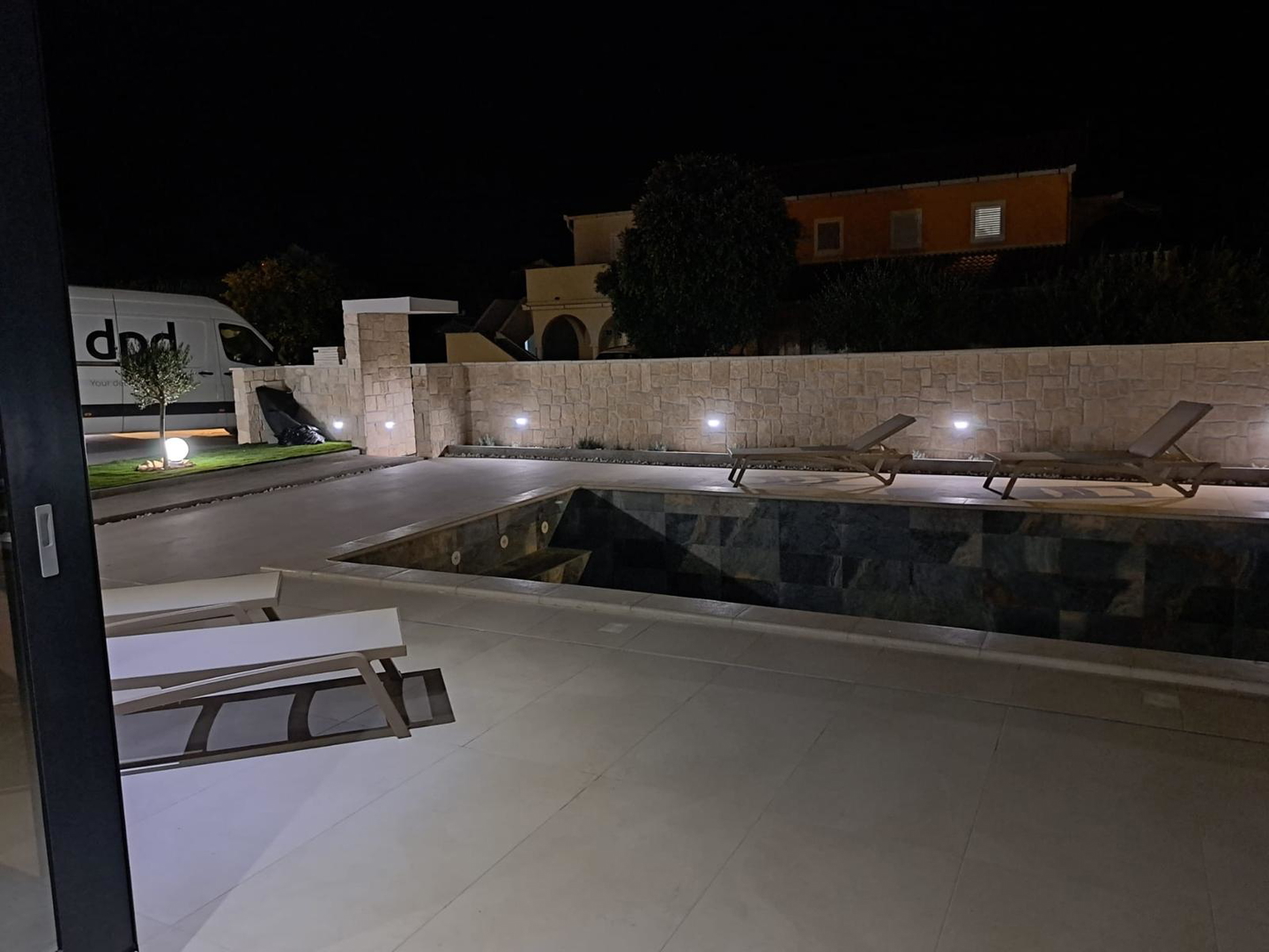 High-quality brick construction and AB construction, 15 cm insulation, flat roof with hydro and thermal insulation, high-quality sanitary facilities, fittings directly from the wall, Marazzi ceramic tiles, spider glass fence on the terrace, Daikin heat pump for heating/cooling and hot water A*** with underfloor heating and converters, three-layer anthracite carpentry with bronze effect and mosquito nets, edges of the house facing the sea without pillars, Smart house – control using mobile phones, tablets or computers, natural stone used as aesthetic details, swimming pool with heat pump and all automation, lined with ceramic tiles, summer kitchen with grill, sink, induction hobs and worktops, pergola with approx. 20m2, solar shower outside, jacuzzi, outdoor ambient lighting, preparation for solar panels, three-phase power connection, fence around the house AB with natural stone facing the street, car chargers, video surveillance, coded entrance, etc…