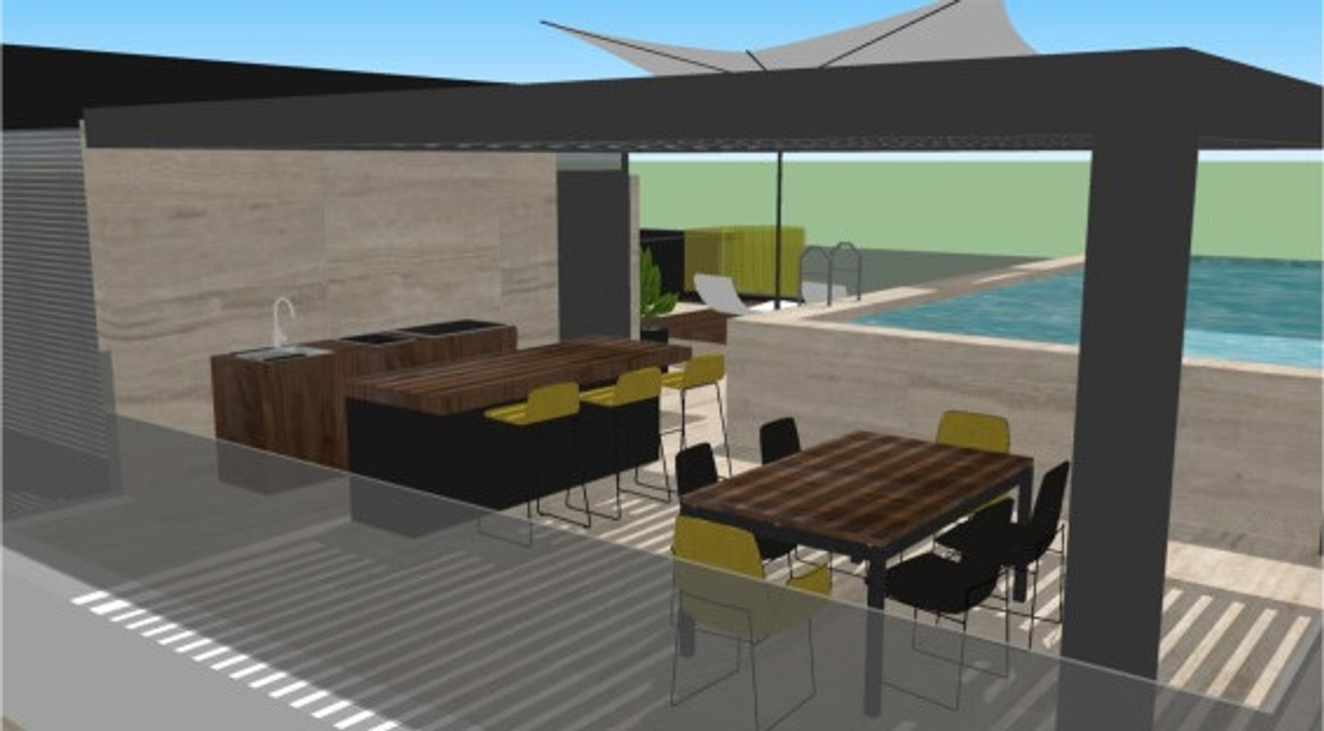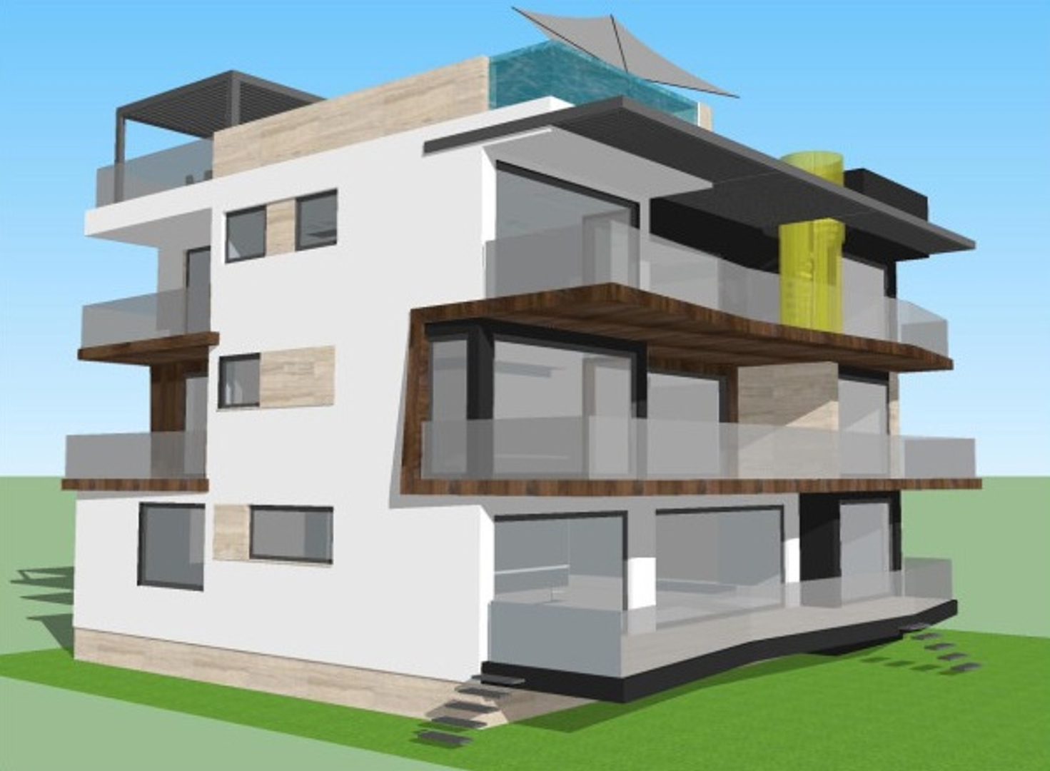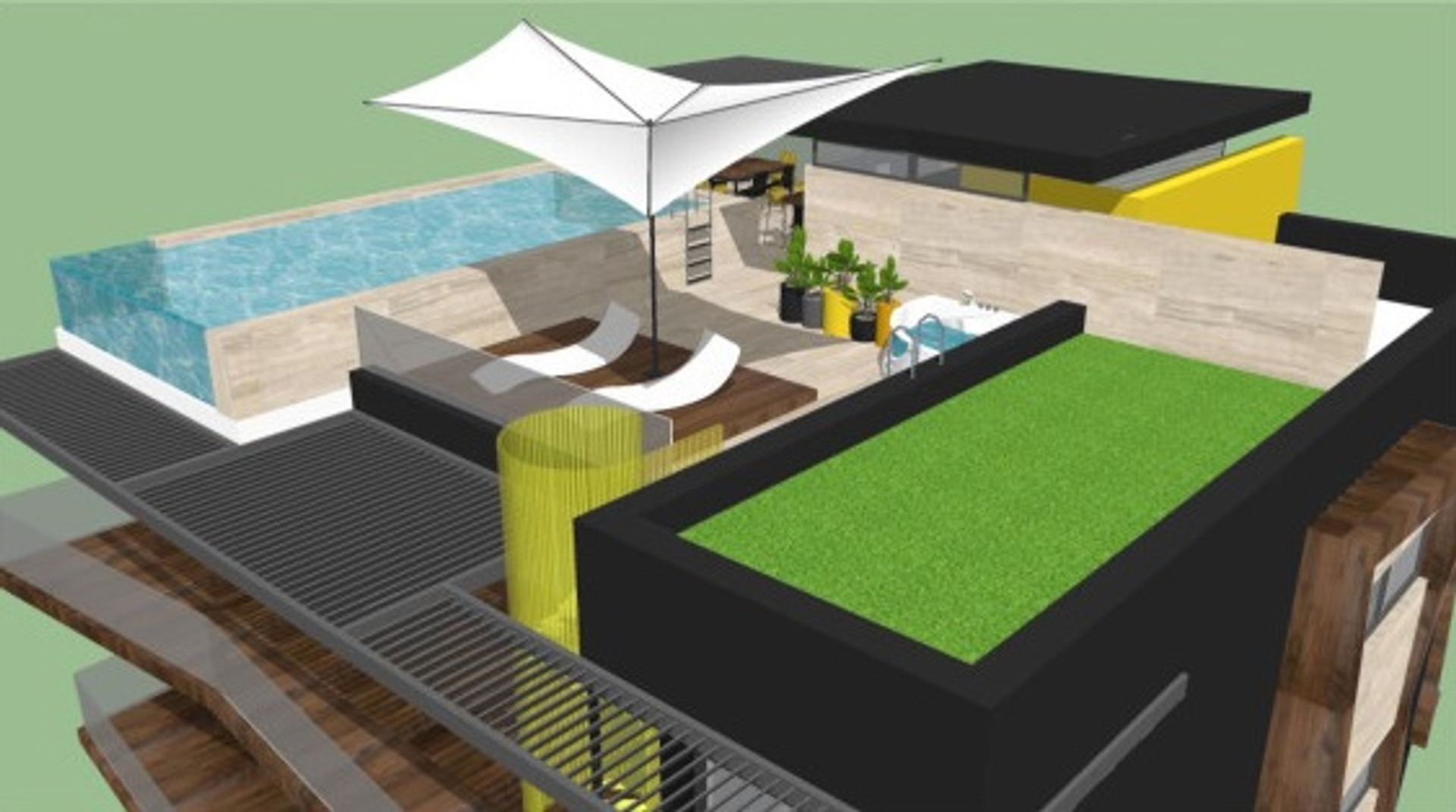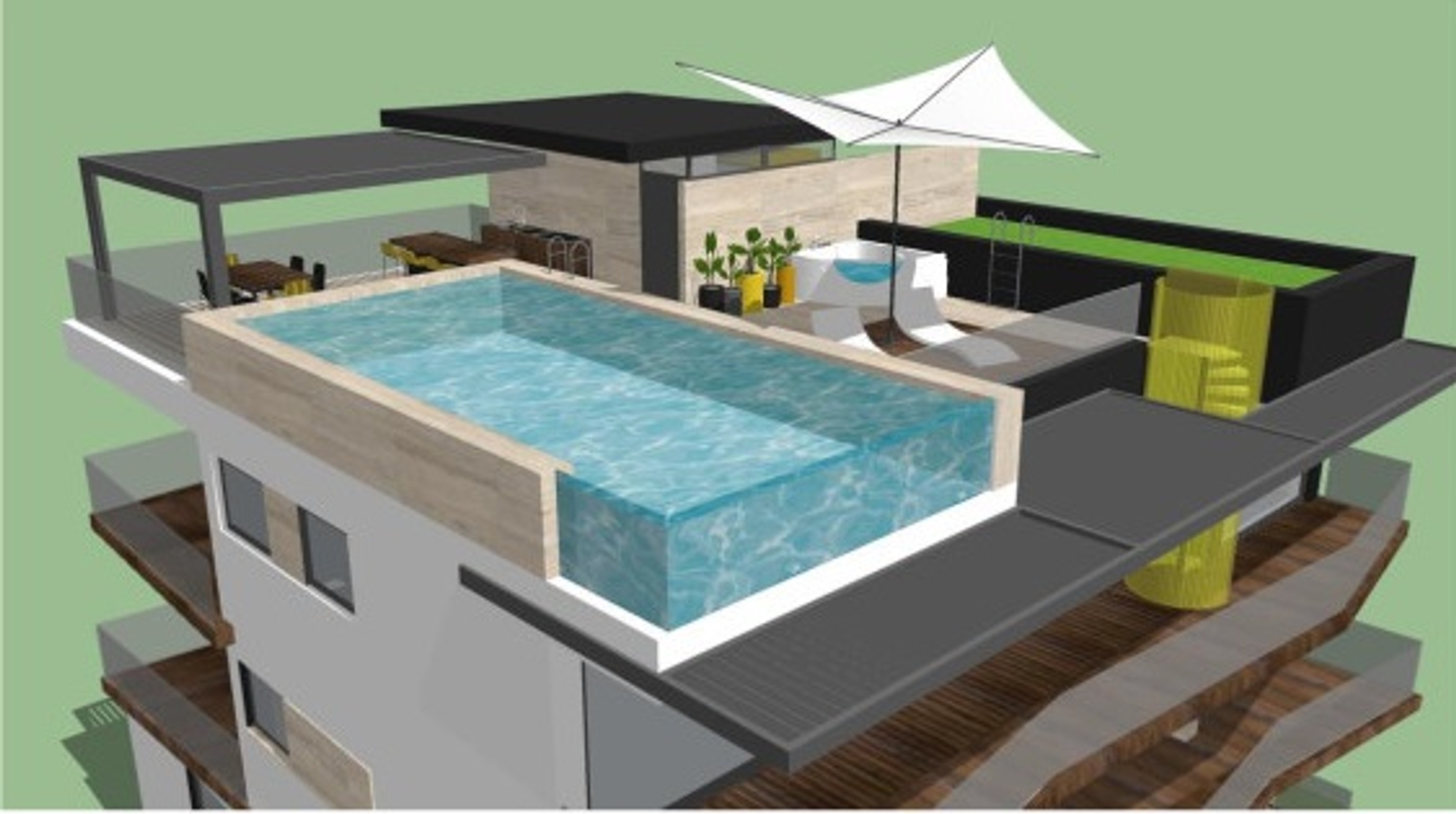The apartment has a large roof terrace with a sun deck, swimming pool, roof garden, etc…