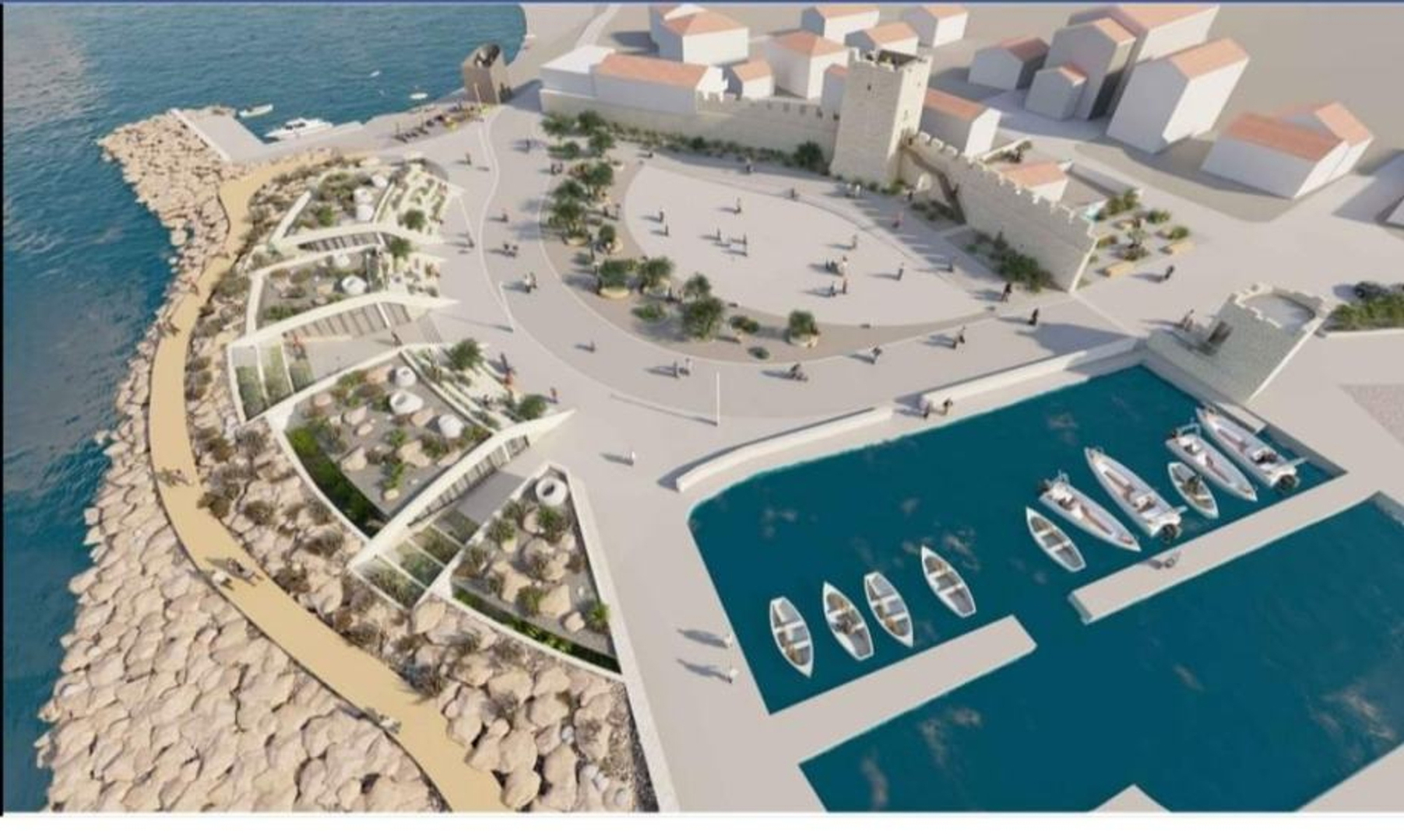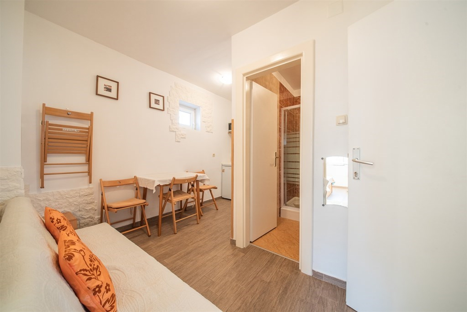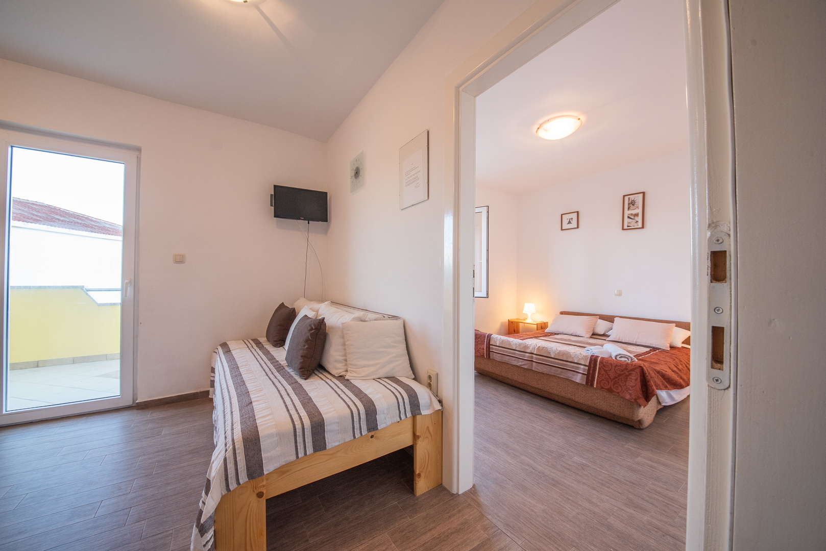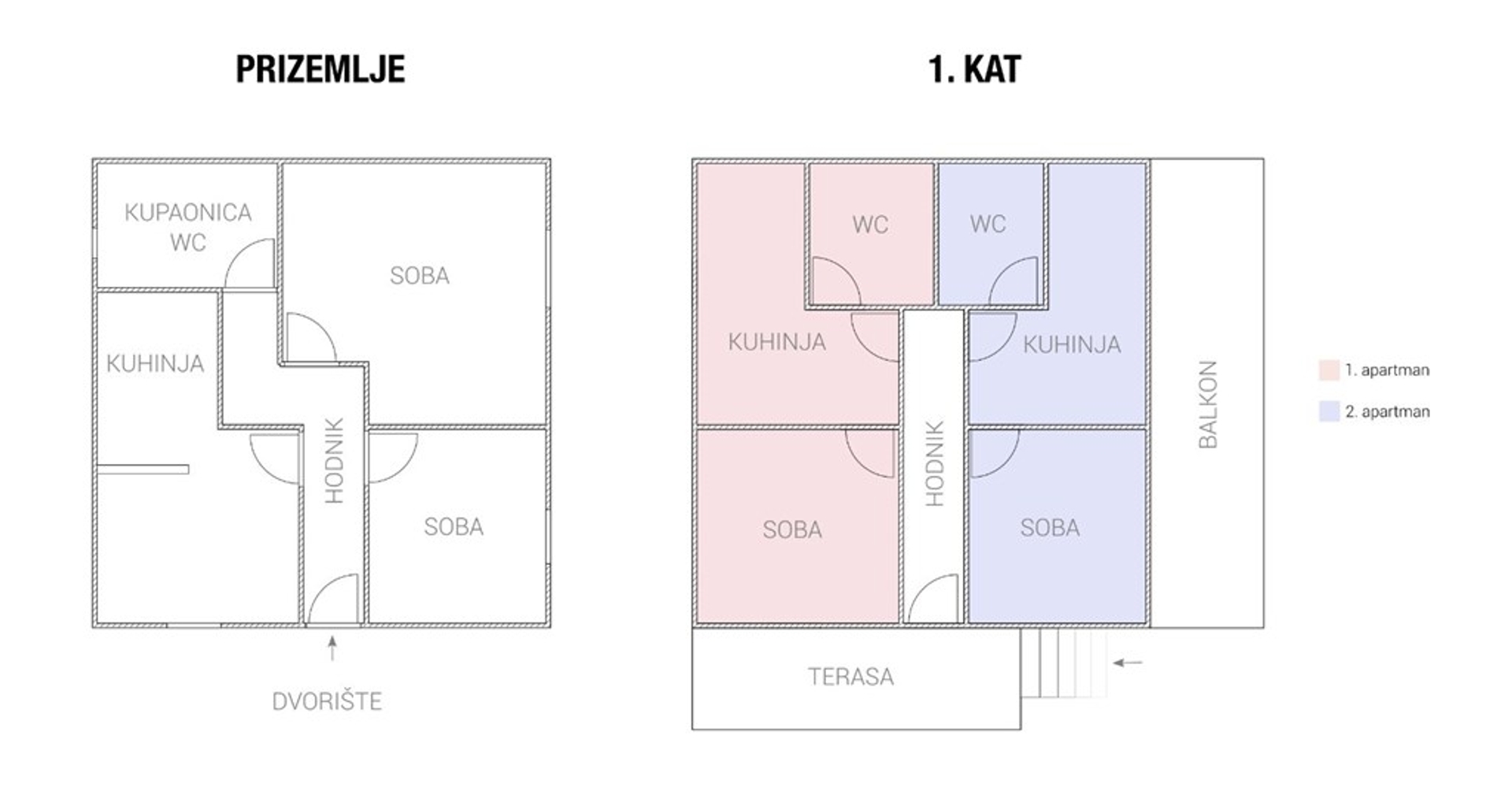 Floor two separate apartments each: one bedroom, kitchen + dining room, bathroom and terrace.