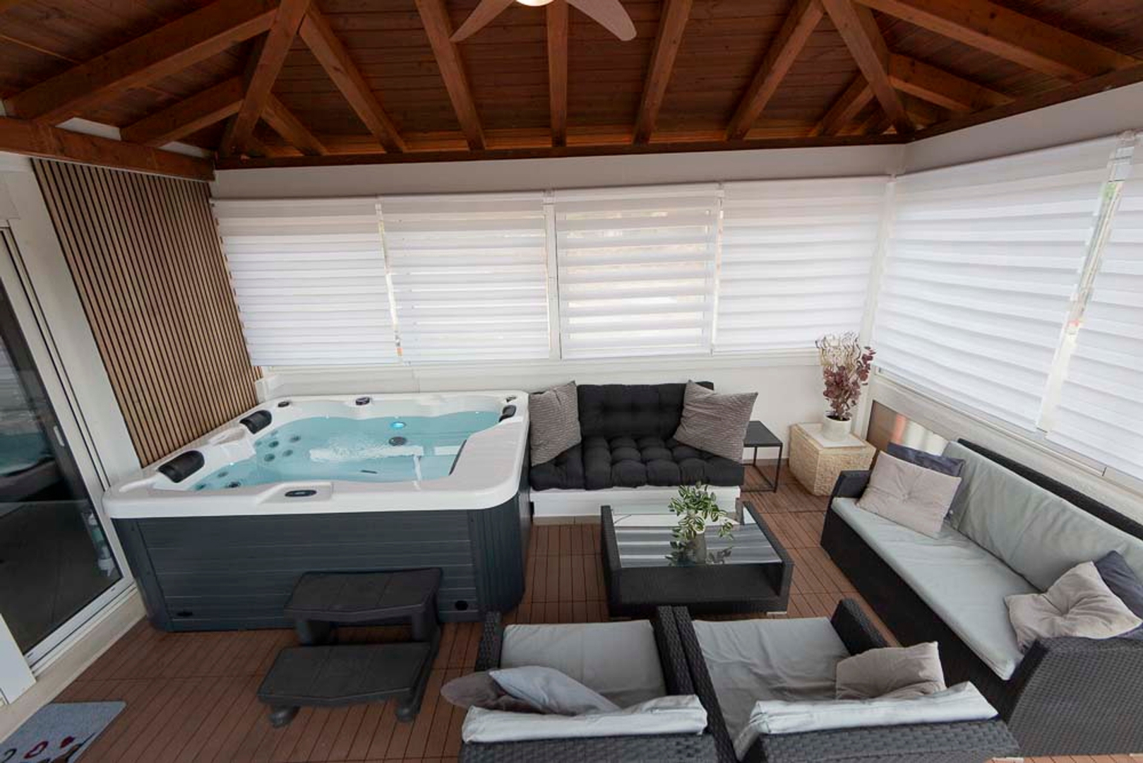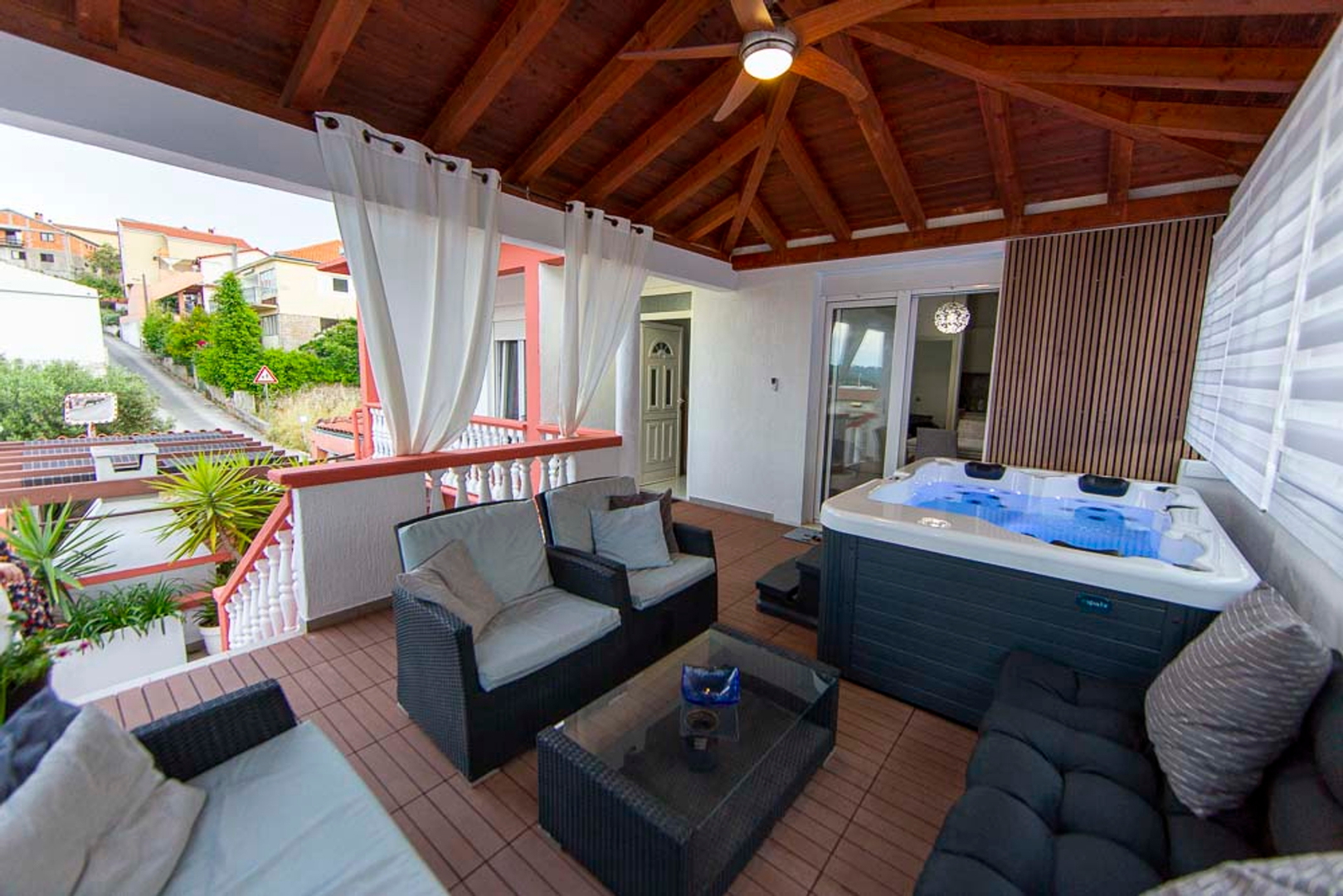 It has a storage room and a jacuzzi with lounge furniture on the terrace.