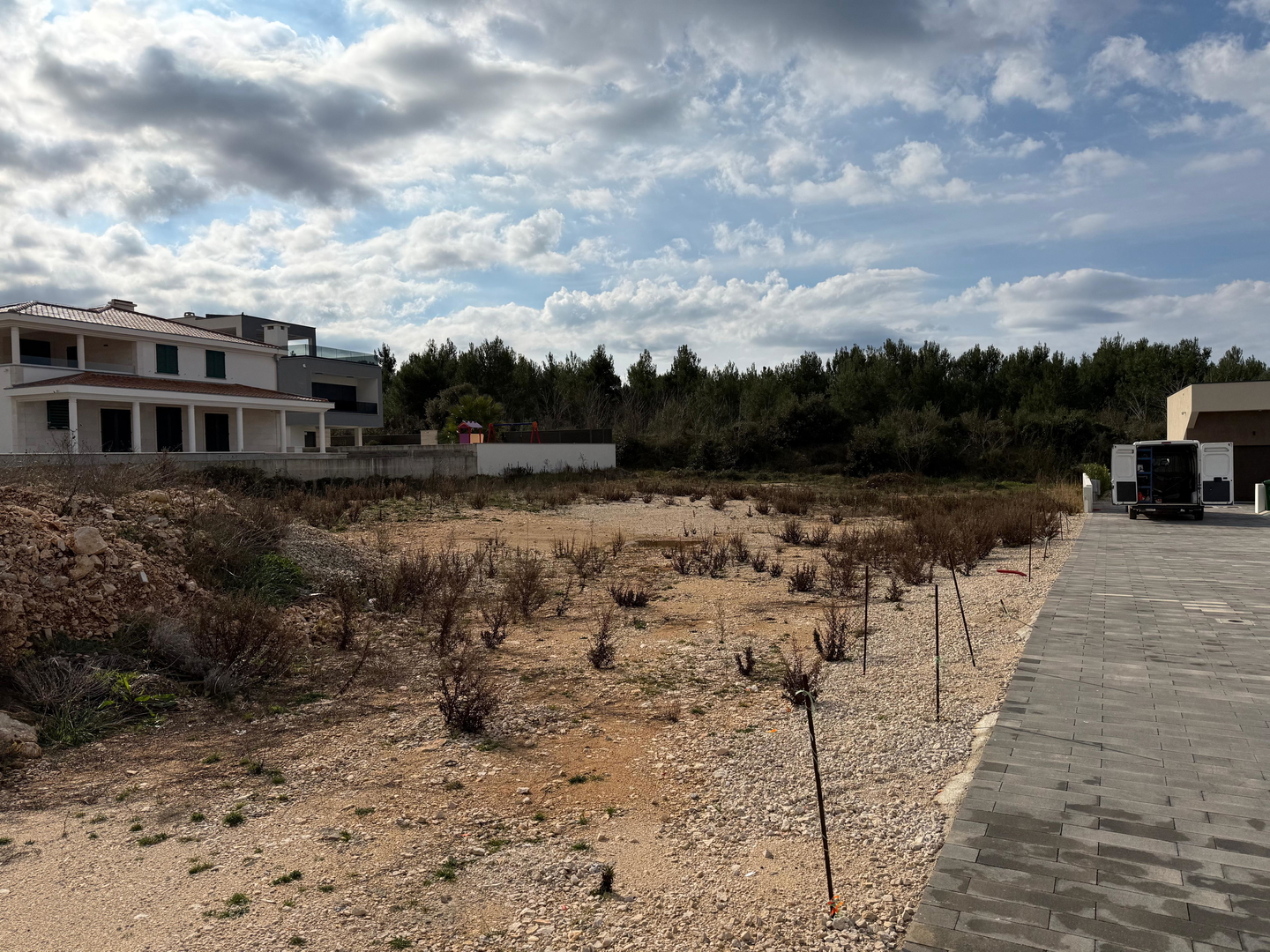 The land is of regular shape, dimensions approx. 22m x 27m, access road, infrastructure nearby. Has a building permit for a building with four residential units.