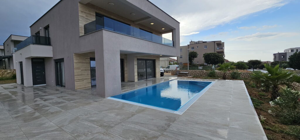 Pag – Mandre, prodaje se dvojna kuća katnica od 220 m2 stambene površine izgrađena 2024 godine na zemljištu od 465 m2. Visokokvalitetna gradnja zidano opekom i AB konstrukcijom, izolacija od 15cm, ravni krov sa hidro i termoizolacijom, vrhunska sanitarija, armature iz zida direktno, Marazzi keramičke pločice, spider staklene ograda na terasi, Daikin dizalica topline za […]