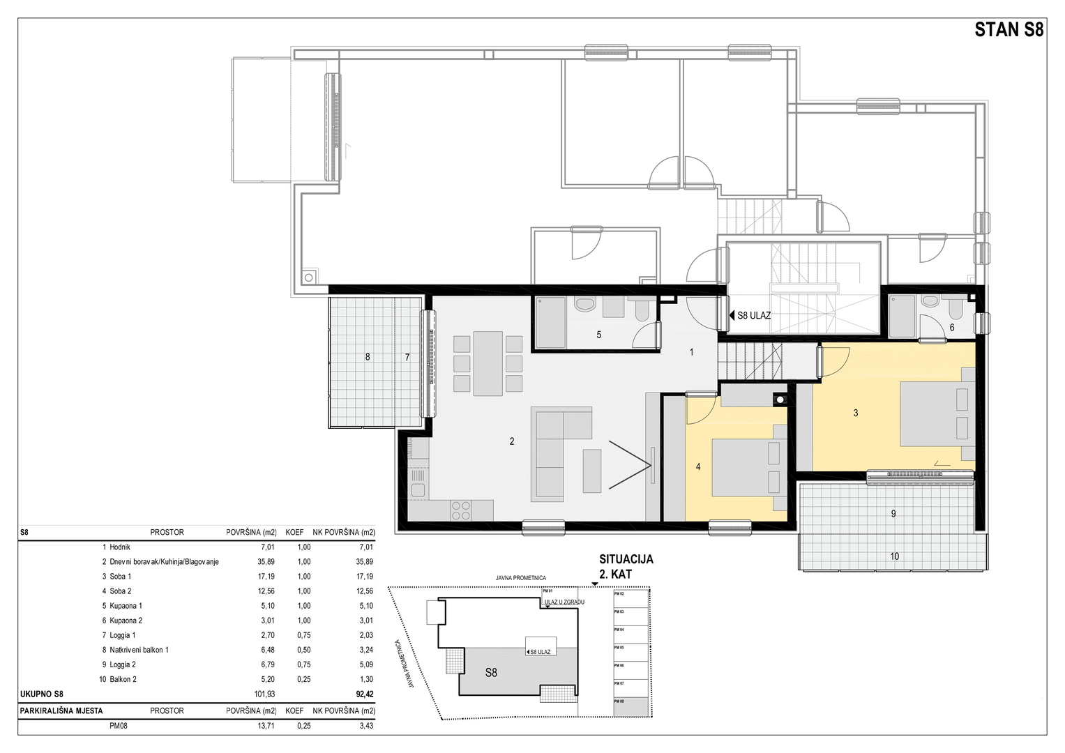Pag – Mandre, prodaje se dvosobni apartman od 104,35 m2 na drugom katu stambenog objekta sa ukupno osam apartmana izgrađenog 2026 godine, kvalitetna gradnja, Schuco dvoslojna stakla u cijeloj zgradi, Marazzi keramika u cijeloj zgradi, Hansgrohe slavine, Laufen sanitarije, itd…. Sastoji se od: dvije spavaće sobe, dnevnog boravka + kuhinja + blagovaona, hodnika, dvije kupaonice i dvije terase. IZ APARTMANA SE PRUŽA OTVOREN POGLED NA MORE!!! Nalazi se na izvrsnoj lokaciji 15 m udaljen od mora i plaže (prvi red), blizina svih potrebnih sadržaja za ugodan odmor!!! Posjeduje parkirno mjesto koje je GRATIS. Dokumentacija uredna. Planirano useljenje 04/2026. godine.