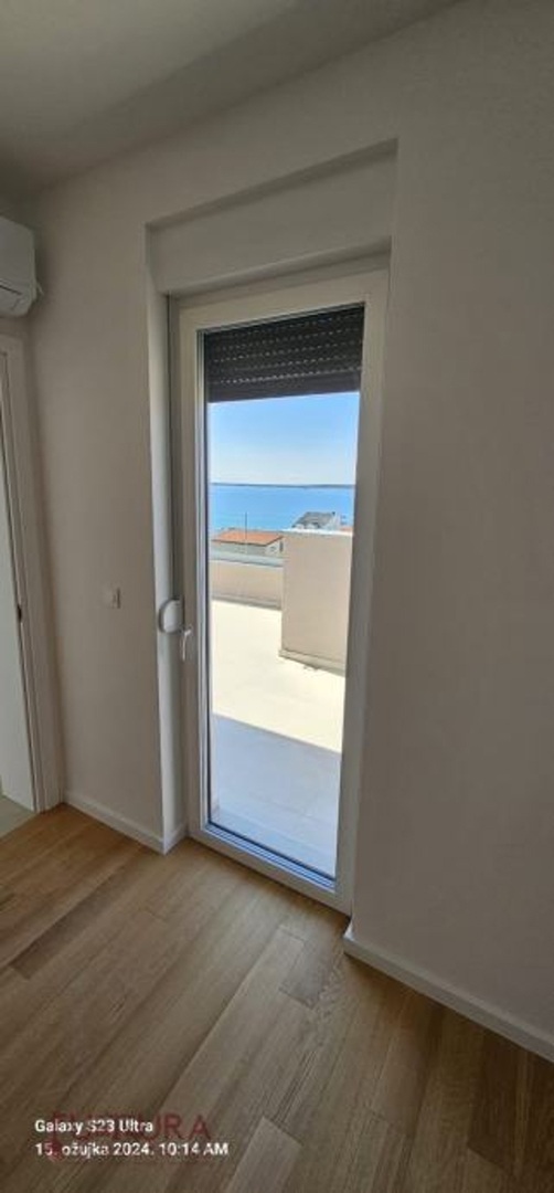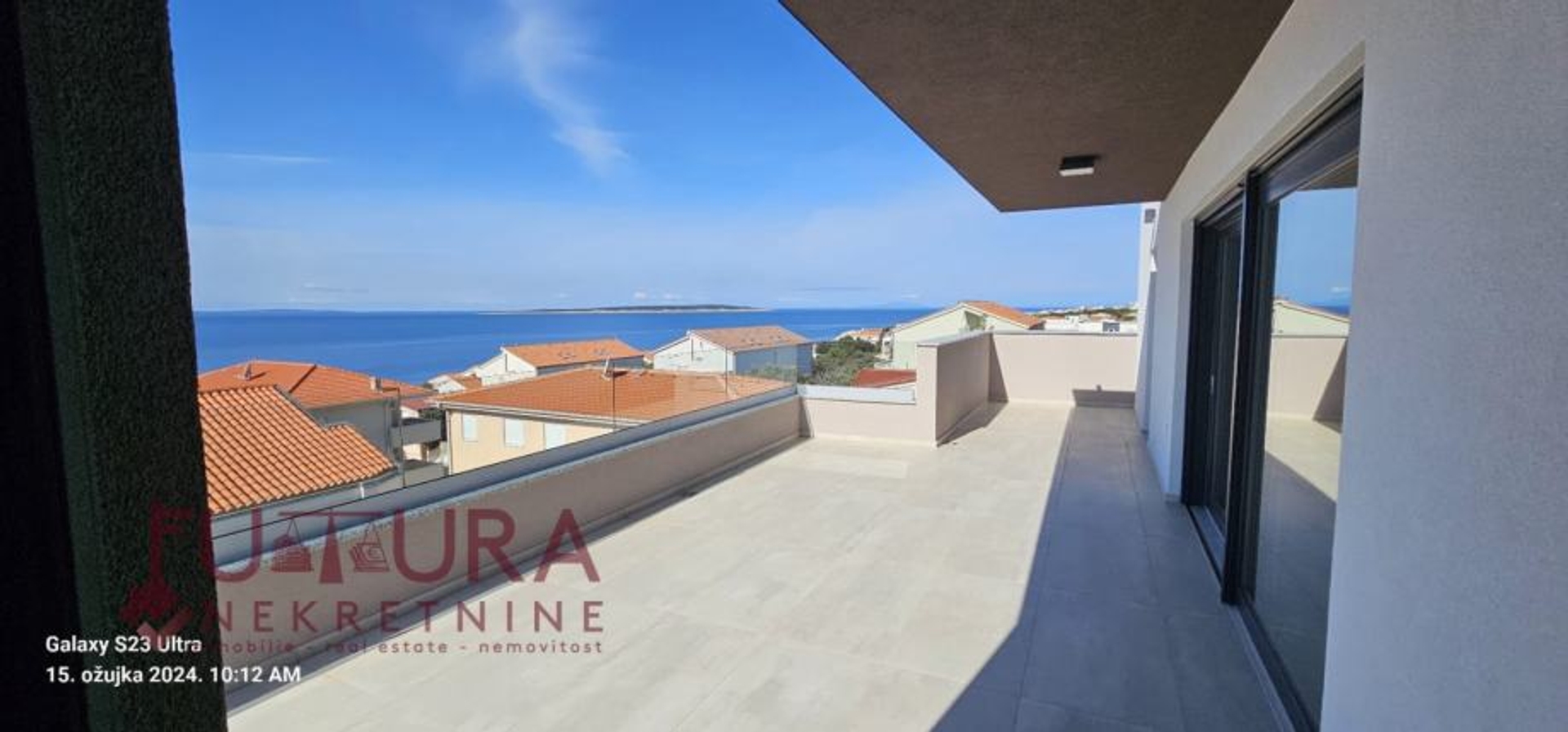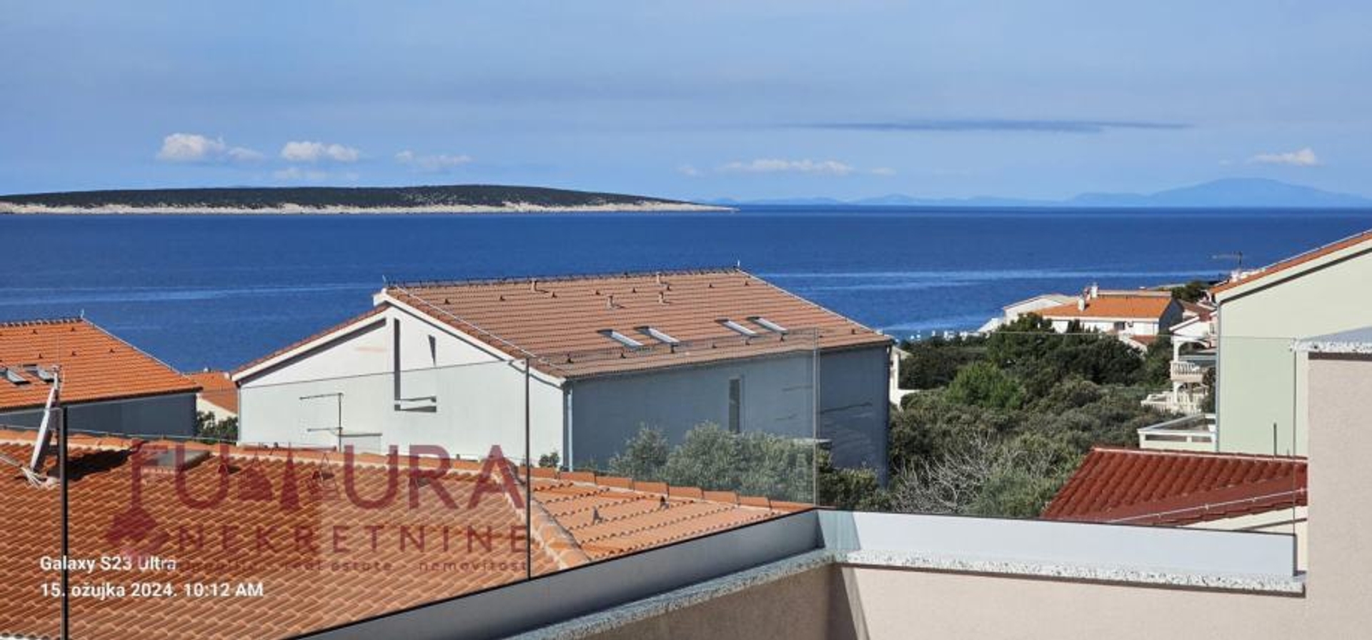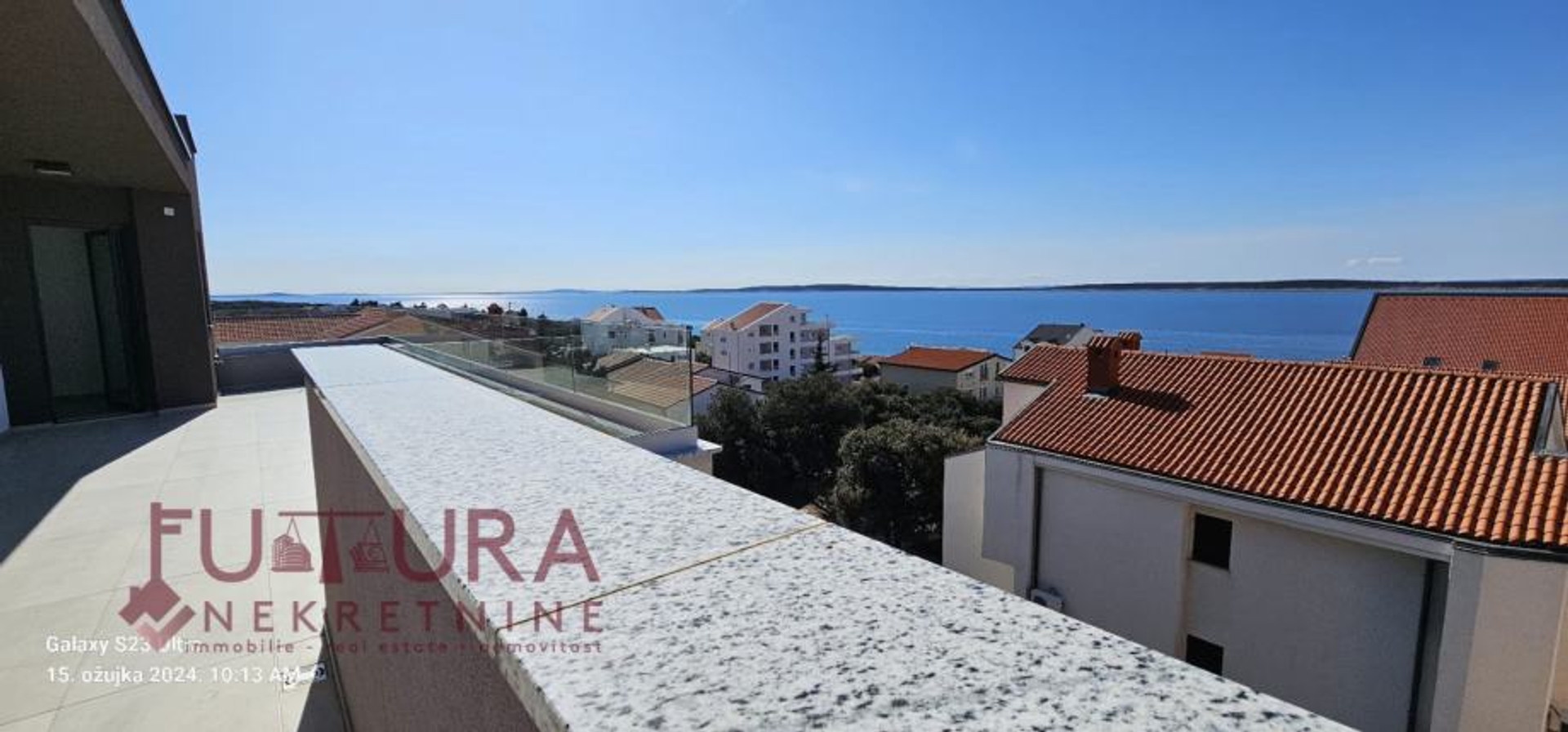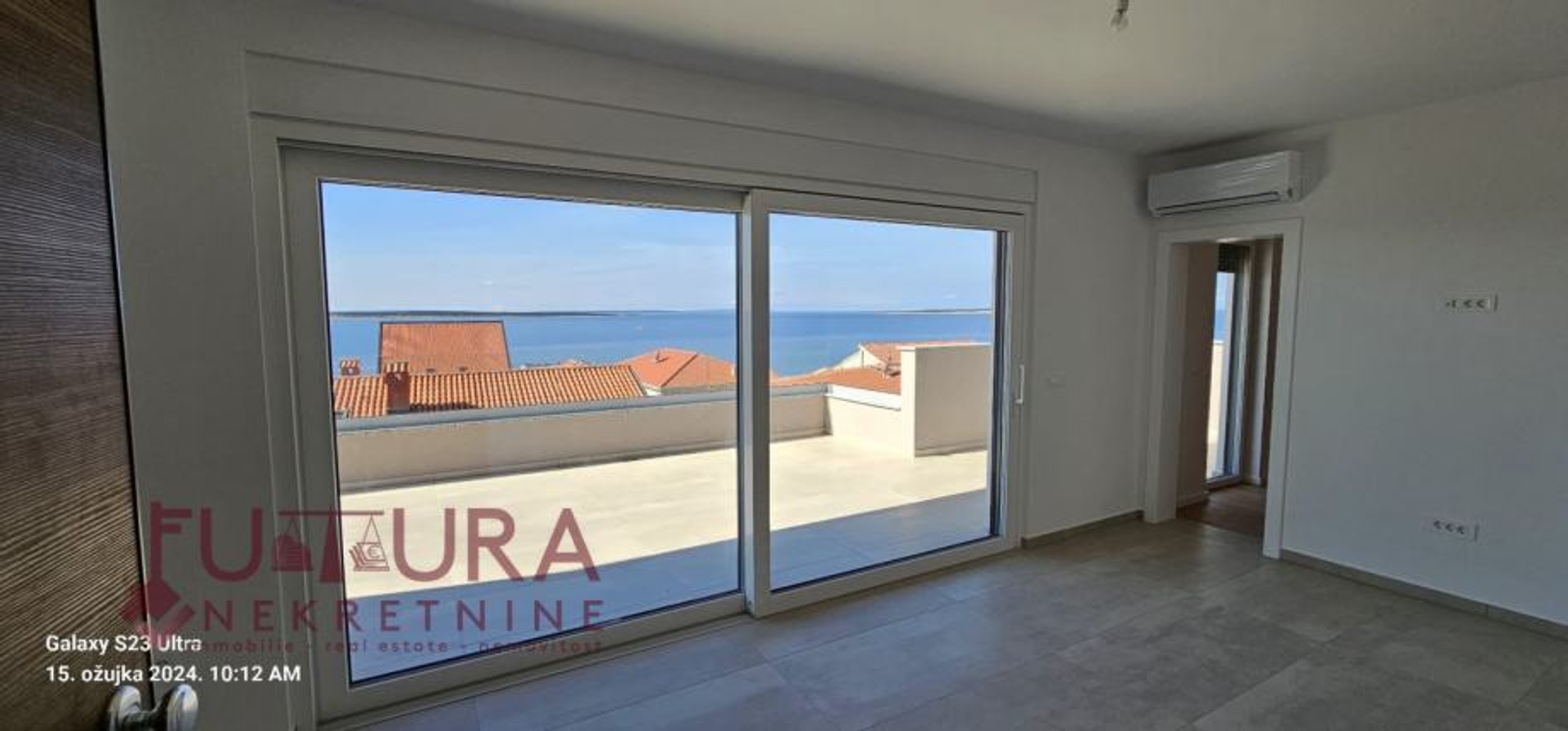 Pag – Mandre, prodaje se dvosobni apartman od 104,94 m2 tlocrtne površine na trećem katu stambenog objekta izgrađenog 2023 godine. Visokokvalitetna gradnja, armirano betonska konstrukcija, zidovi – Porotherm 25 Profi, pregradni zidovi – Porotherm 10 Profi, ravni krov 15 cm XPS, vanjski zidovi 8 cm EPS, završna obrada akril žbuka, keramika, staklena ograda na terasi na ALU nosačima, stolarija unutarnja jednokrilna drvena vrata hrast natur, protuprovalna i protupožarna ulazna vrata, vanjska PVC više komorna stolarija 3 stakla, boja izvana antracit, iznutra bijela, rolo komarnici, električno pokretna roleta na podizno kliznim stijenama, unutarnje kamene klupice, vanjske antracit klupice s brtvom, stubište popločano prirodnim kamenom, Inox ograda, sobe podna obloga troslojni hrastov parket, klima jedinica u svim sobama i dnevnom boravku, kupaonice podna i zidna obloga keramičke pločice 60 cm x 120 cm, Hansgrohe podžbukni tuš sistem + armature, premium umivaonik, GEBERIT ugradbeni vodokotlić + rimless WC školjka sa soft close daskom, radijator ljestve, zatravljeni okoliš sa zasađenim stablima agruma, kamenom popločan parking, priprema instalacije za punjače za električna vozila, video portafon, priprema za TV u sobama… . Sastoji se od: dvije spavaće sobe, dnevnog boravka + kuhinja + blagovaona, kupaonice i terase. . IZ APARTMANA SE PRUŽA POGLED NA MORE!!! . Nalazi se na odličnoj lokaciji 140 m udaljen od mora i plaže, blizina kafića, konobe, trgovine te svih sadržaja potrebnih za ugodan i miran odmor!!! . Posjeduje parkirno mjesto. . Dokumentacija uredna.