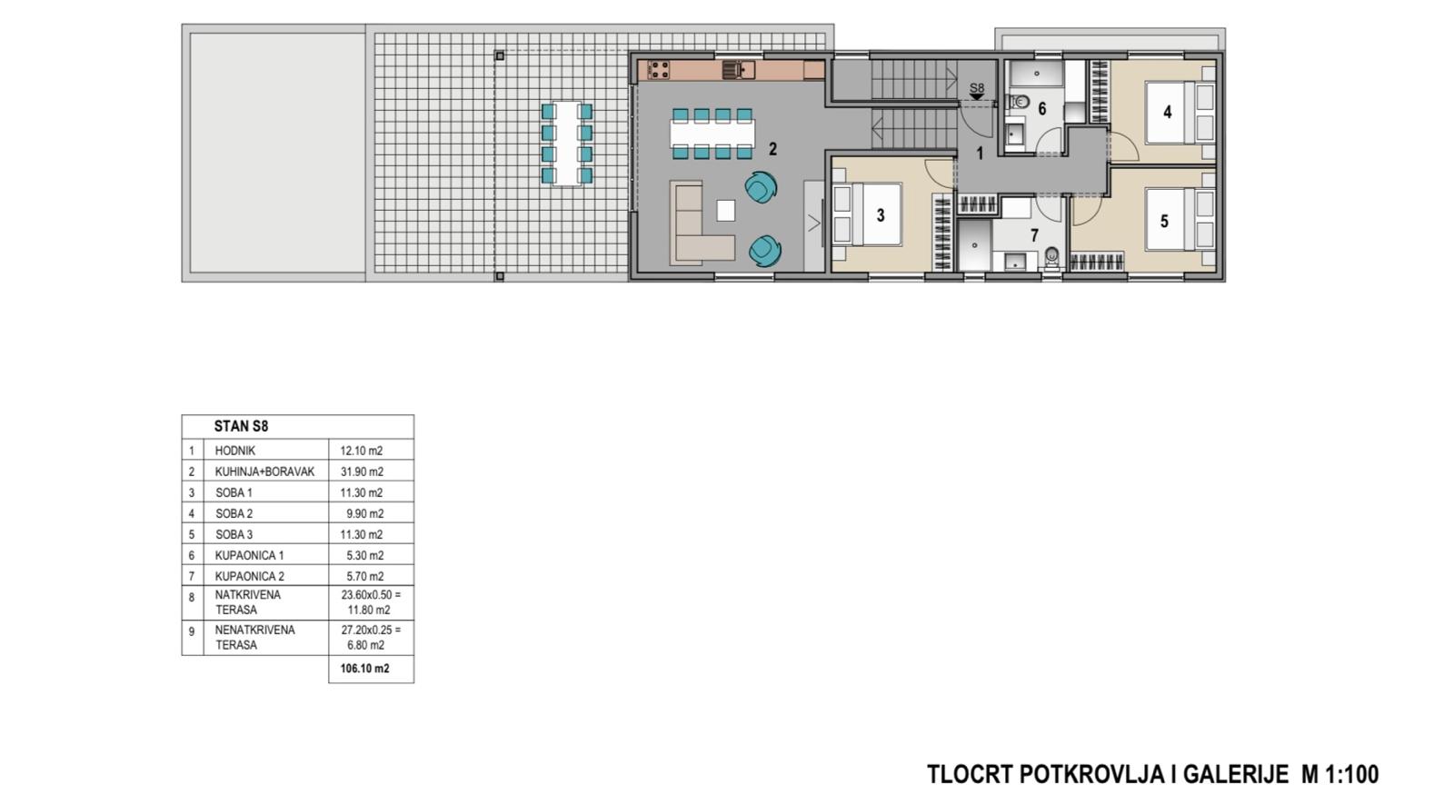 Pag – Mandre, prodaje se trosobni apartman od 106,10 m2 u potkrovlju stambenog objekta sa ukupno osam apartmana, u izgradnji, planirano useljenje 07/2026 godine. Kvalitetna gradnja, podno grijanje u svakoj sobi, električne rolete, keramičke pločice u cijelom stanu, itd… Sastoji se od: tri spavaće sobe, dnevni boravak + kuhinja + blagovaona, hodnika, dvije kupaonice i terase. IZ APARTMANA SE PRUŽA POGLED NA MORE!!! Nalazi se na odličnoj lokaciji 420 m udaljeno od mora i plaže, blizina kafića, restorana, trgovine te svih ostalih sadržaja potrebnih za ugodan odmor!!! Posjeduje parkirno mjesto i ostavu. Dokumentacija uredna. Tlocrt gledati stan oznake S8.