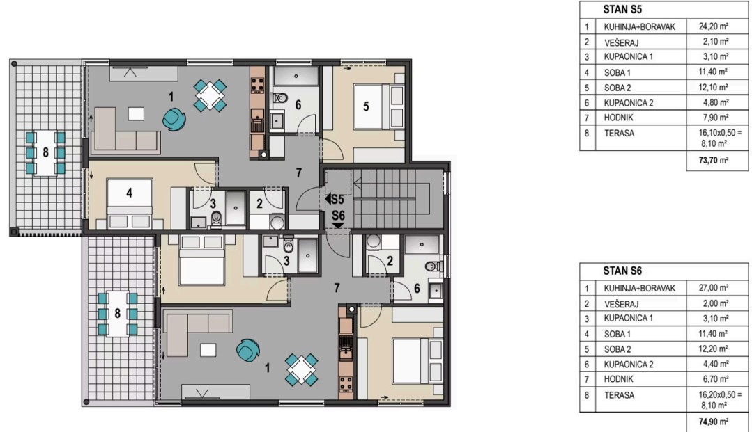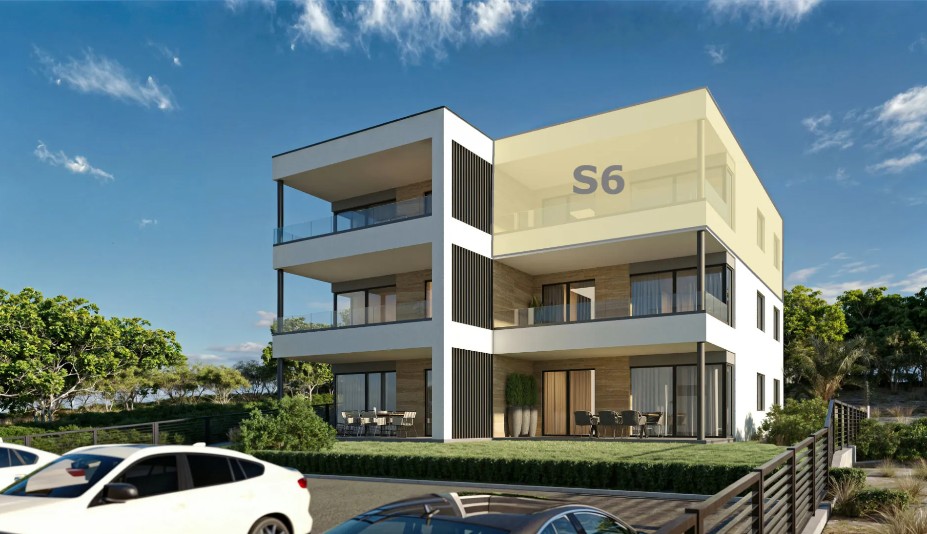 Pag – Mandre, prodaje se dvosobni apartman od 77,50 m2 na drugom katu stambenog objekta sa ukupno šest apartmana u izgradnji, planirano useljenje proljeće 2027 godine. Kvalitetna gradnja, visokokvalitetne pločice u cijelom stanu, kupaonica s tušem i umivaonikom, klima uređaj u svakoj spavaćoj sobi i dnevnom boravku, itd… Sastoji se od: dvije spavaće sobe, dnevnog boravka + kuhinja + blagovaona, hodnika, vešeraja, dvije kupaonice i terase. SA TERASE SE PRUŽA POGLED NA MORE!!! Nalazi se na odličnoj lokaciji 260 m udaljen od mora i plaže, blizina dječjeg igrališta, trgovine, restorana, kafića te svih ostalih sadržaja za ugodan i miran odmor!!! Posjeduje parkirno mjesto. Dokumentacija uredna. Tlocrt gledati stan S6.