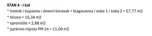 Pag – Povljana, prodaje se dvosobni apartman od 57,77 m2 na prvom katu stambenog objekta sa ukupno deset apartmana, izgrađenog 2025 godine. Sastoji se od: dvije spavaće sobe, dnevnog boravka + kuhinja + blagovaona, hodnika, kupaonice i terase. IZ APARTMANA SE PRUŽA POGLED NA MORE!!! Nalazi se na dobroj lokaciji 310 m udaljen od mora i plaže, 500 m od plaže Mali Dubrovnik, blizina trgovine, kafića, restorana te svih ostalih sadržaja potrebnih za ugodan i miran odmor!! Posjeduje parkirno mjesto i spremište od 2,88 m2. Apartman ima električno podno grijanje u svim prostorijama i klimatizaciju. Zgrada ima lift. Dokumentacija uredna. Tlocrt gledati apartman S4. Mogućnost kupnje garaže i dodatnog parkirnog mjesta. Planirano useljenje 01/2026.